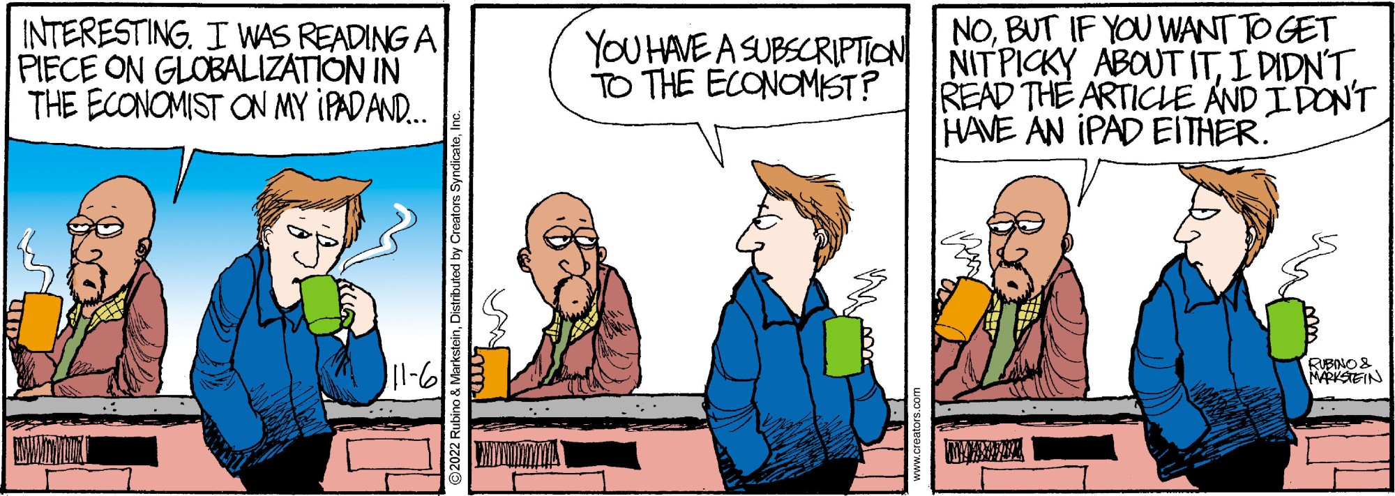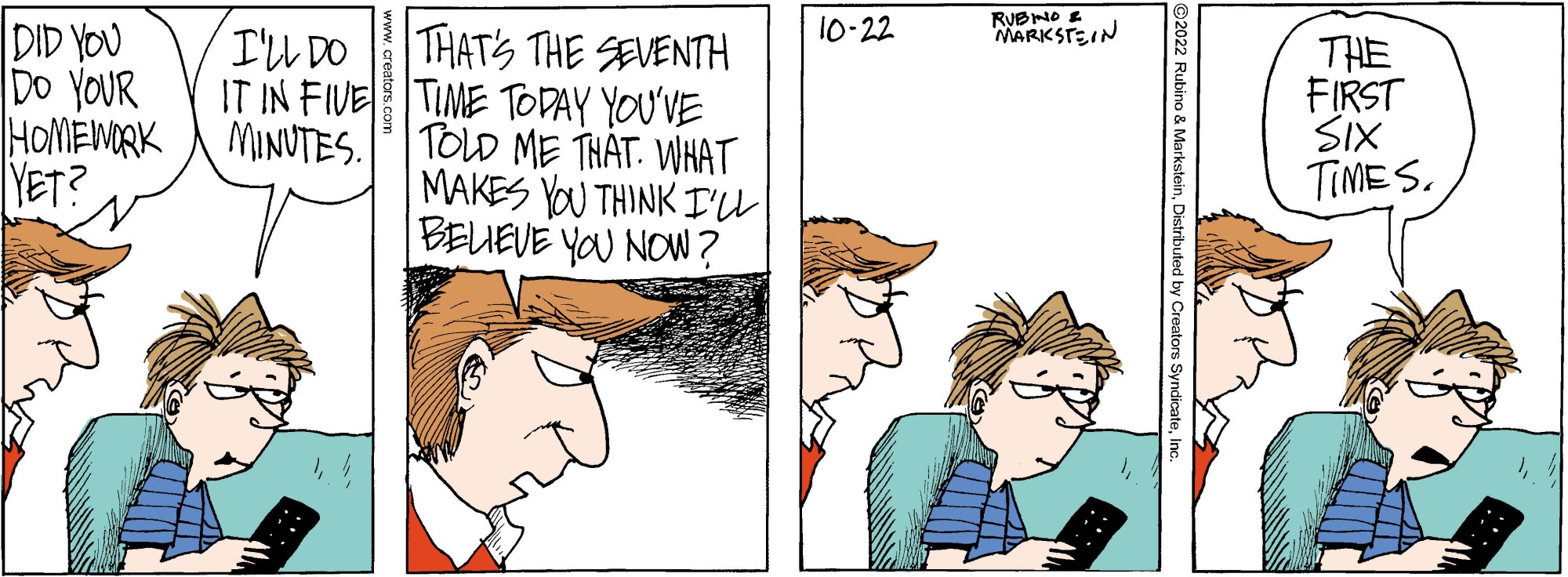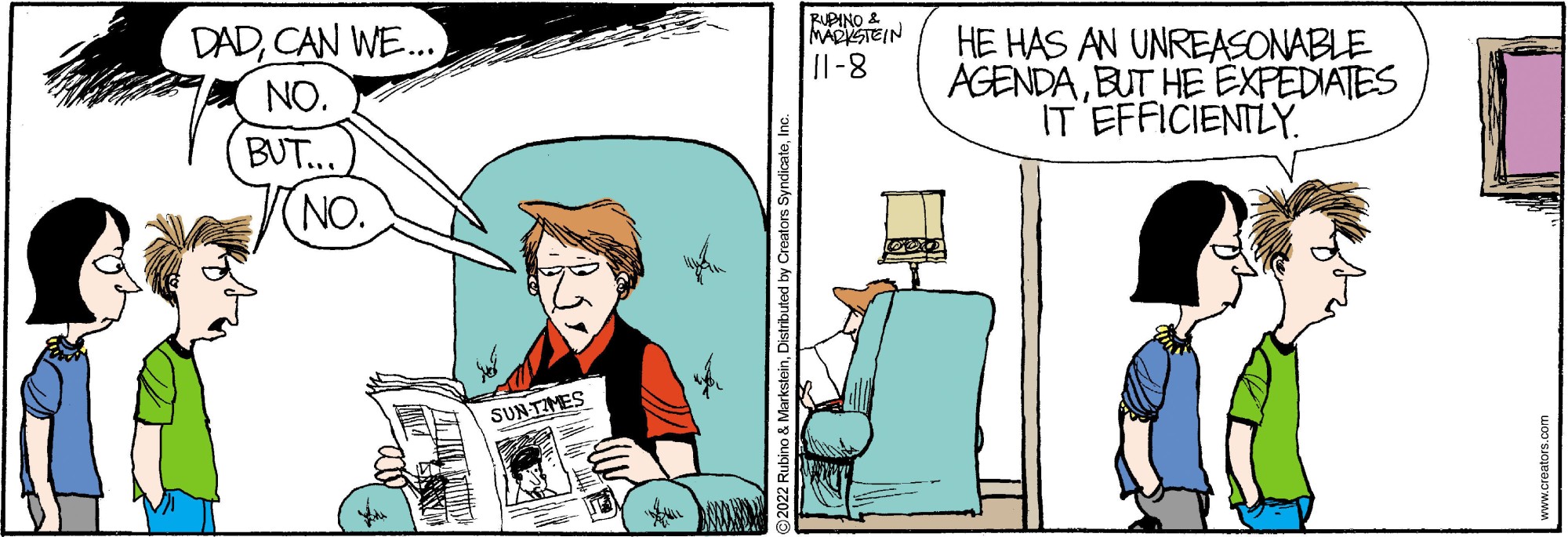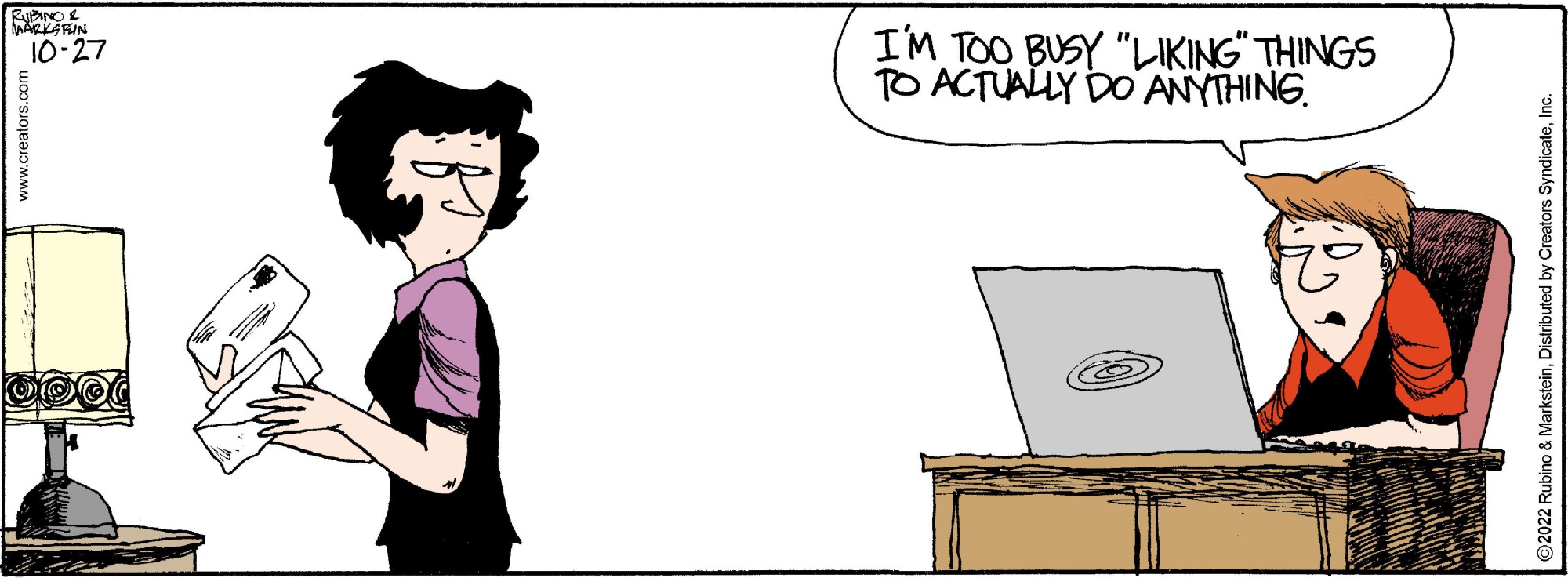 "Daddy’s Home" is a contemporary family comic with an emphasis on the role of the modern father. No other cartoon feature examines domesticity from this uniquely male perspective while remaining universally appealing to both genders. Through the eyes of a stay-at-home-dad, "Daddy’s Home" casts a unique light on everyday situations. With biting sarcasm and sharp wit, Peter and a cast of supporting characters navigate the turbulent waters of modern family life. Creators Syndicate