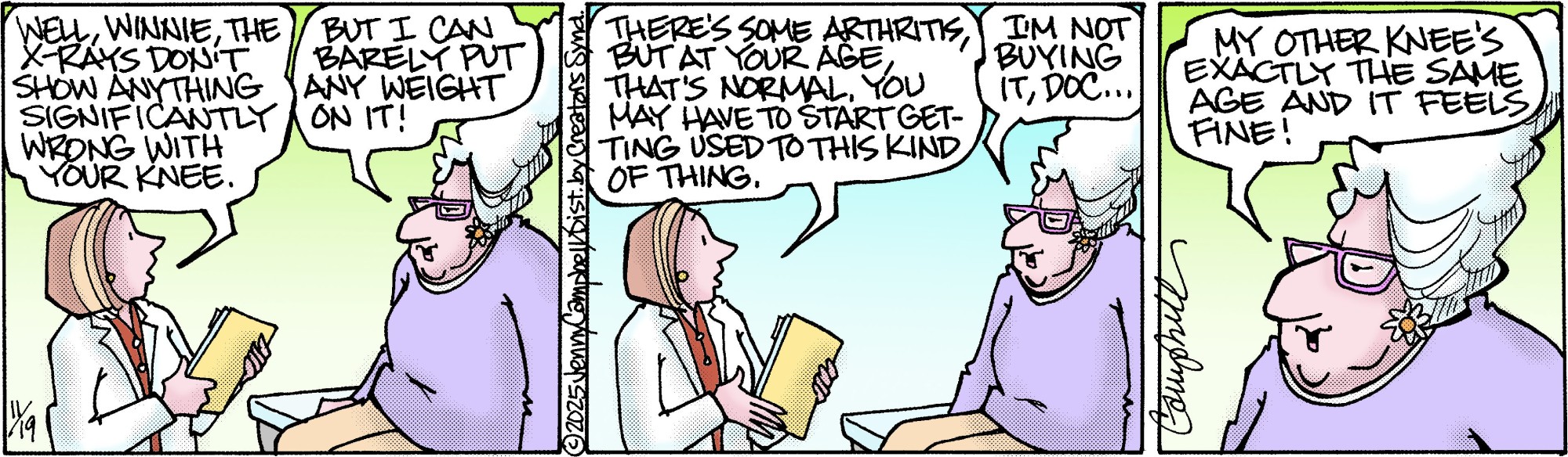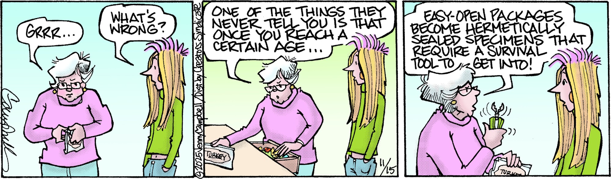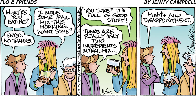 Cartoonist Jenny Campbell has created a spirited and intelligent look at aging and the generation gap. This strip features a group of older women and men dealing with the perils and perks of being old, the rules of chocolate, and the challenges of families. "Flo and Friends" is graceful, poignant, and full of humor. Creators Syndicate