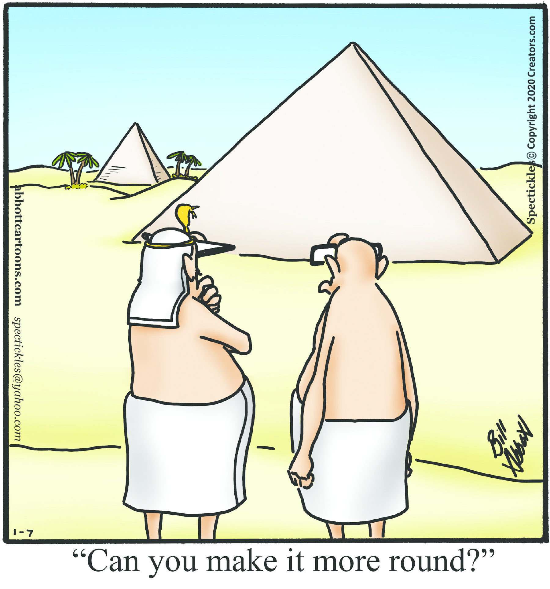 Spectickles, a cartoon primarily about a married couple with, to put it mildly, communication challenges, is an amalgamation of physical traits that author Bill Abbott finds humorous: the deadpan expression and gravity-tugged flesh of Walter Matthau, the powerful presence of Ethel Merman, the glasses of his great-grand-parents and a host of other subtleties. Creators Syndicate