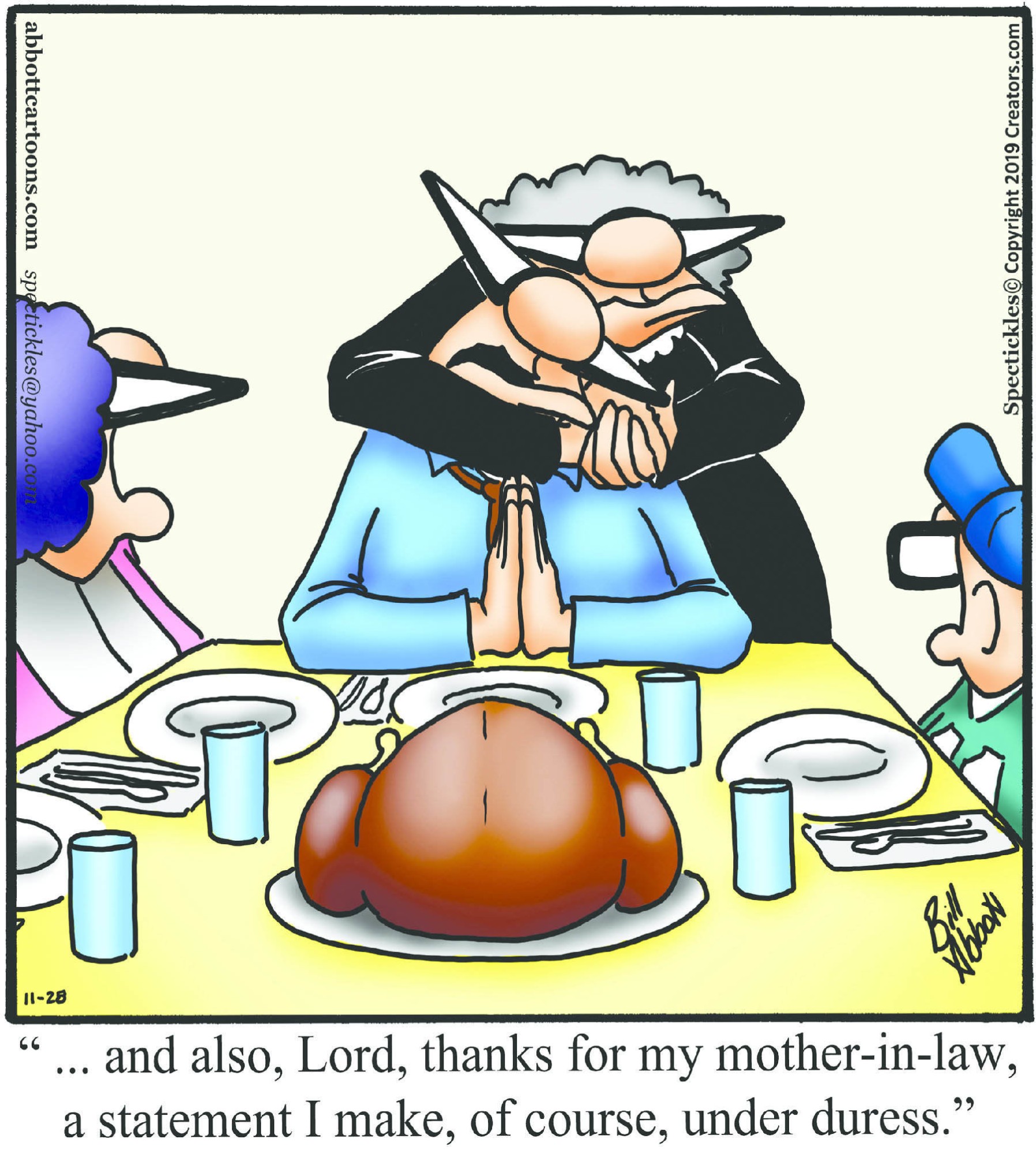 Spectickles, a cartoon primarily about a married couple with, to put it mildly, communication challenges, is an amalgamation of physical traits that author Bill Abbott finds humorous: the deadpan expression and gravity-tugged flesh of Walter Matthau, the powerful presence of Ethel Merman, the glasses of his great-grand-parents and a host of other subtleties. Creators Syndicate