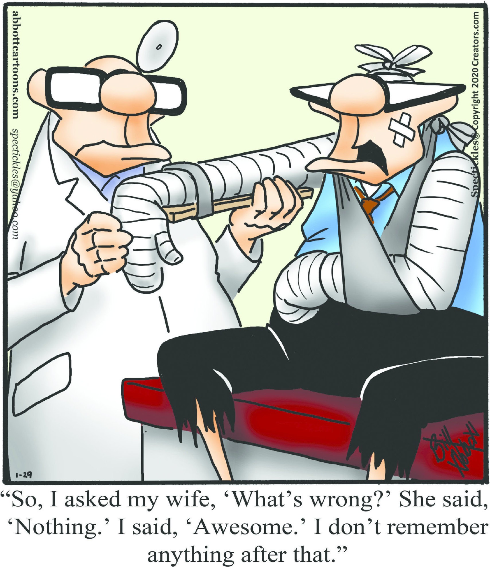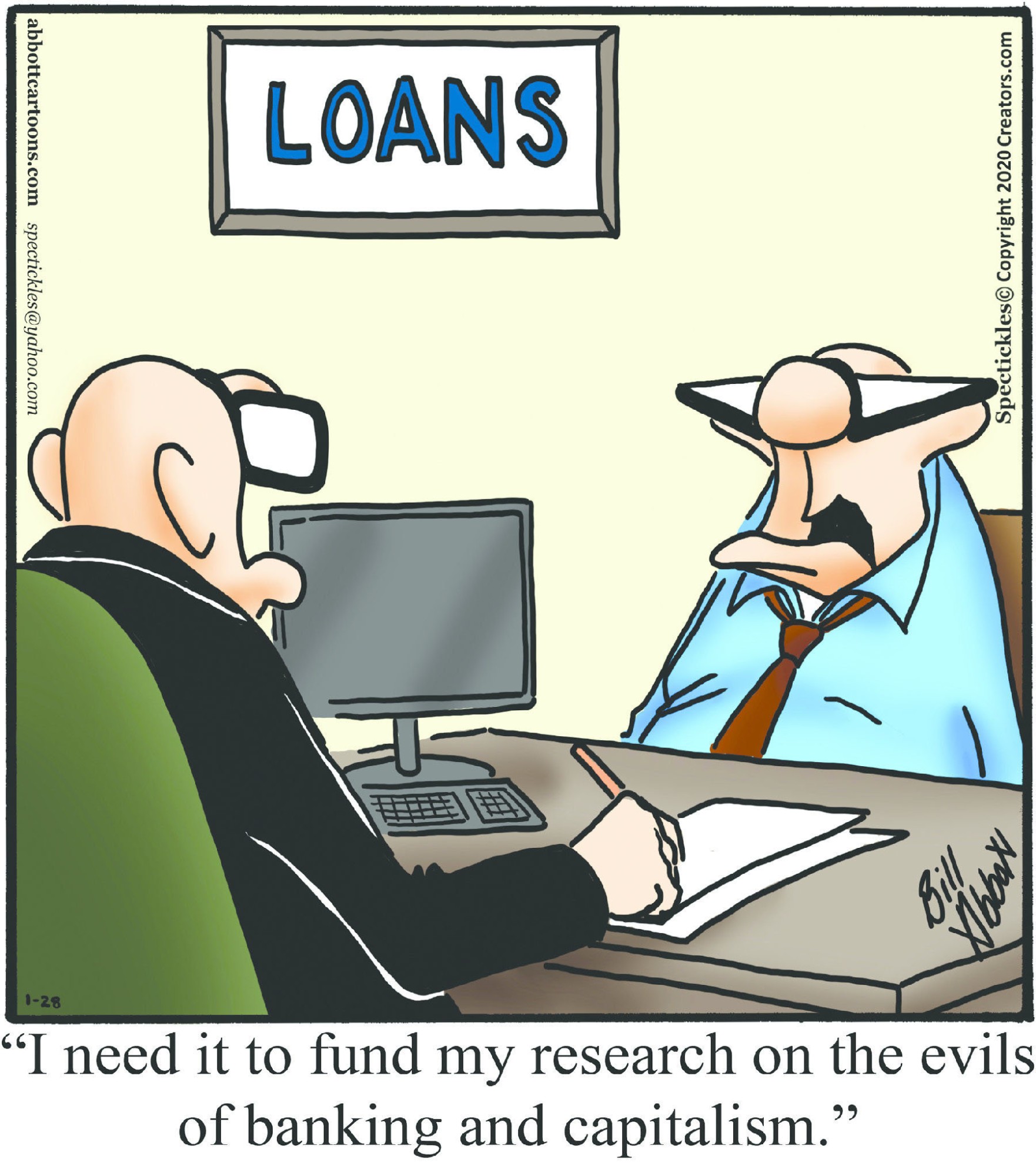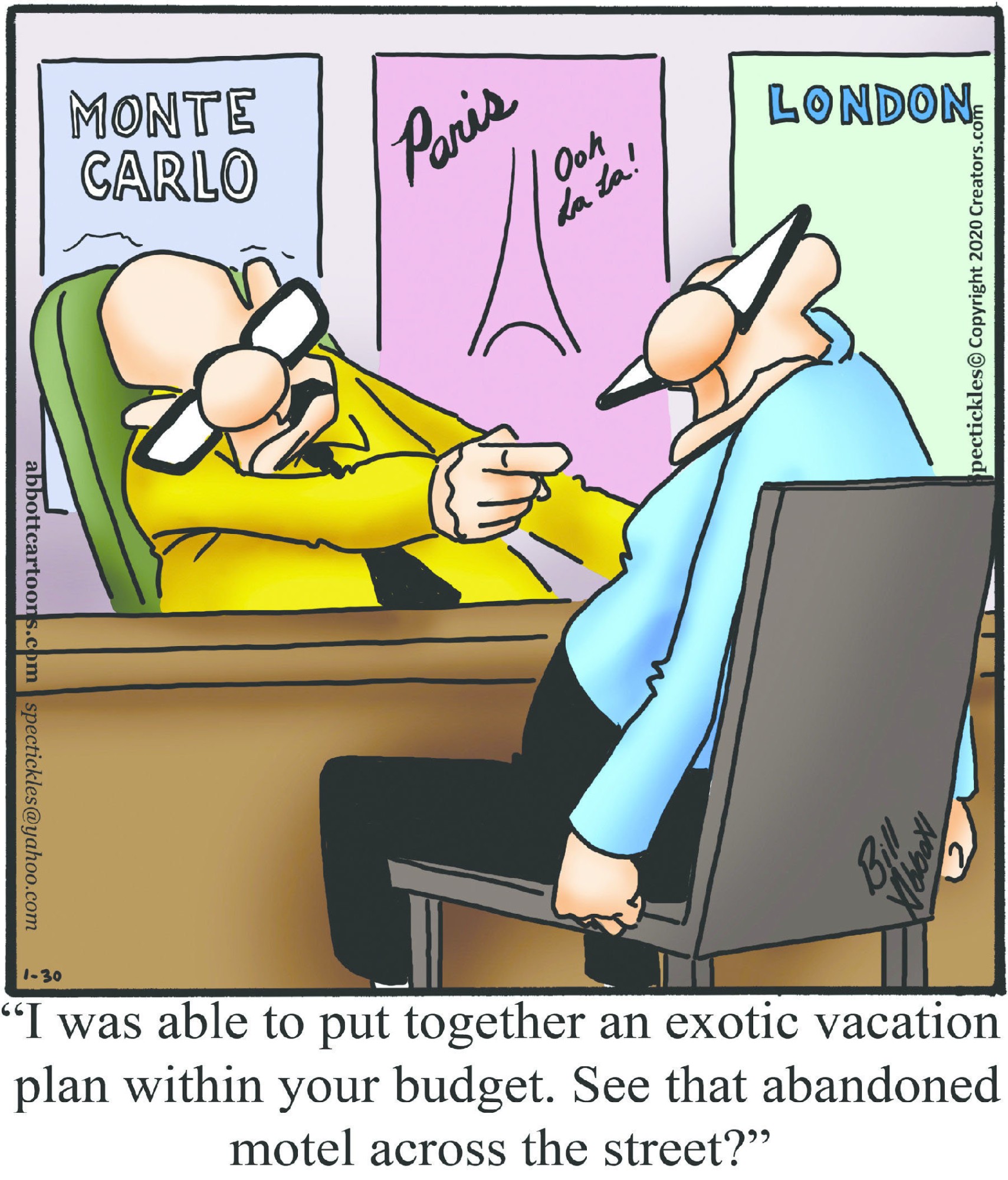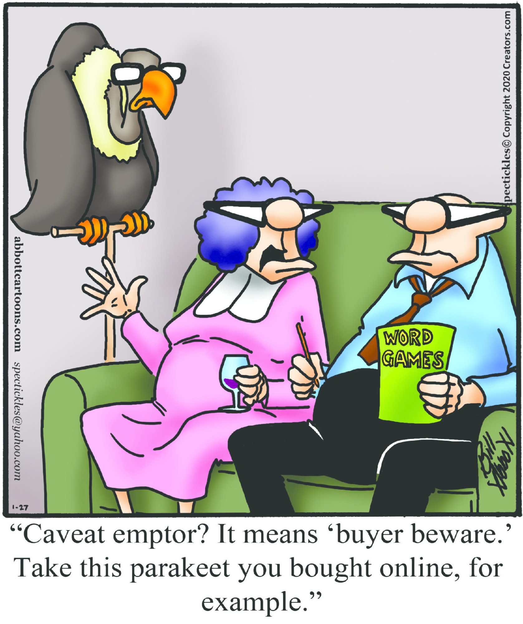 Spectickles, a cartoon primarily about a married couple with, to put it mildly, communication challenges, is an amalgamation of physical traits that author Bill Abbott finds humorous: the deadpan expression and gravity-tugged flesh of Walter Matthau, the powerful presence of Ethel Merman, the glasses of his great-grand-parents and a host of other subtleties. Creators Syndicate