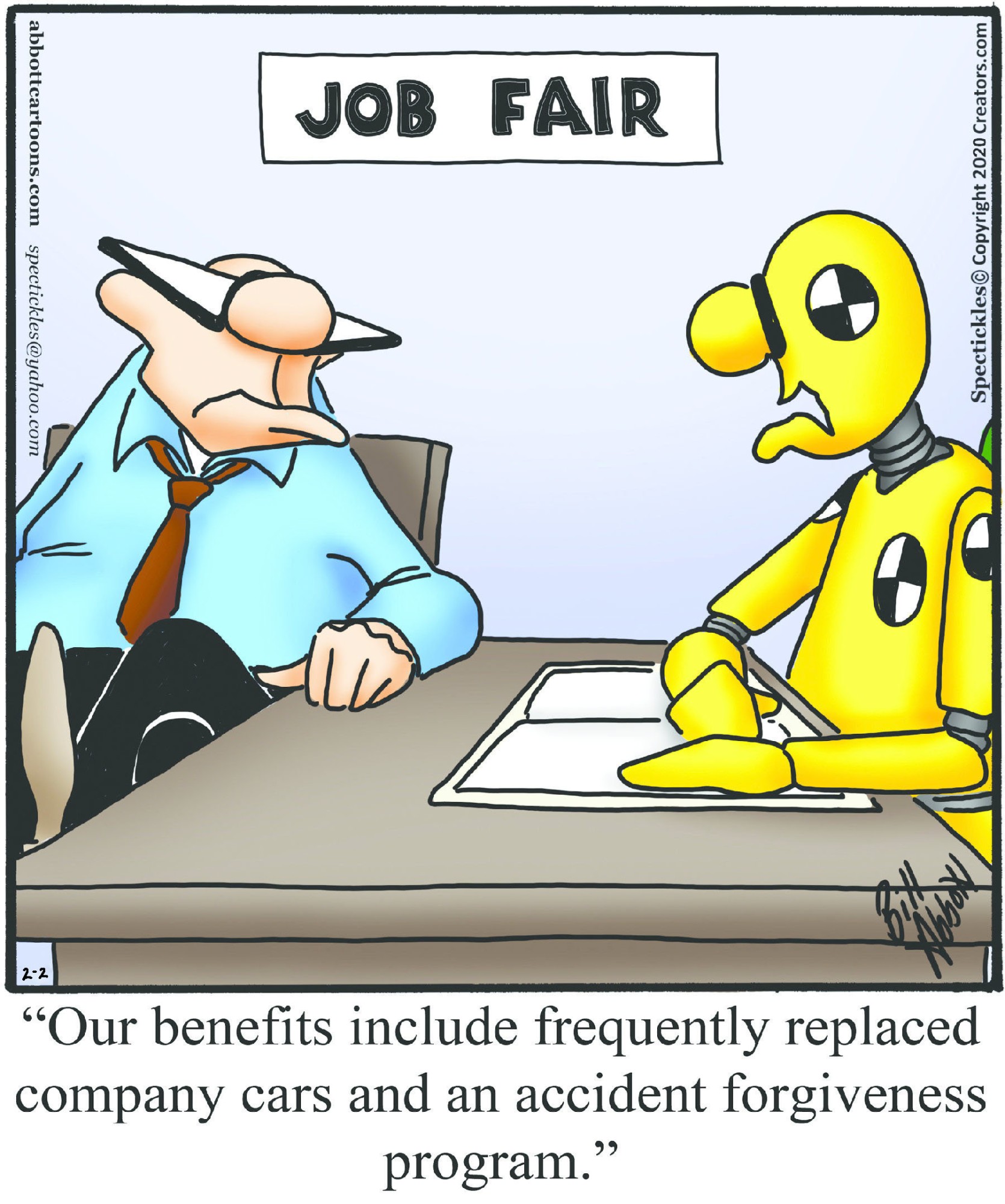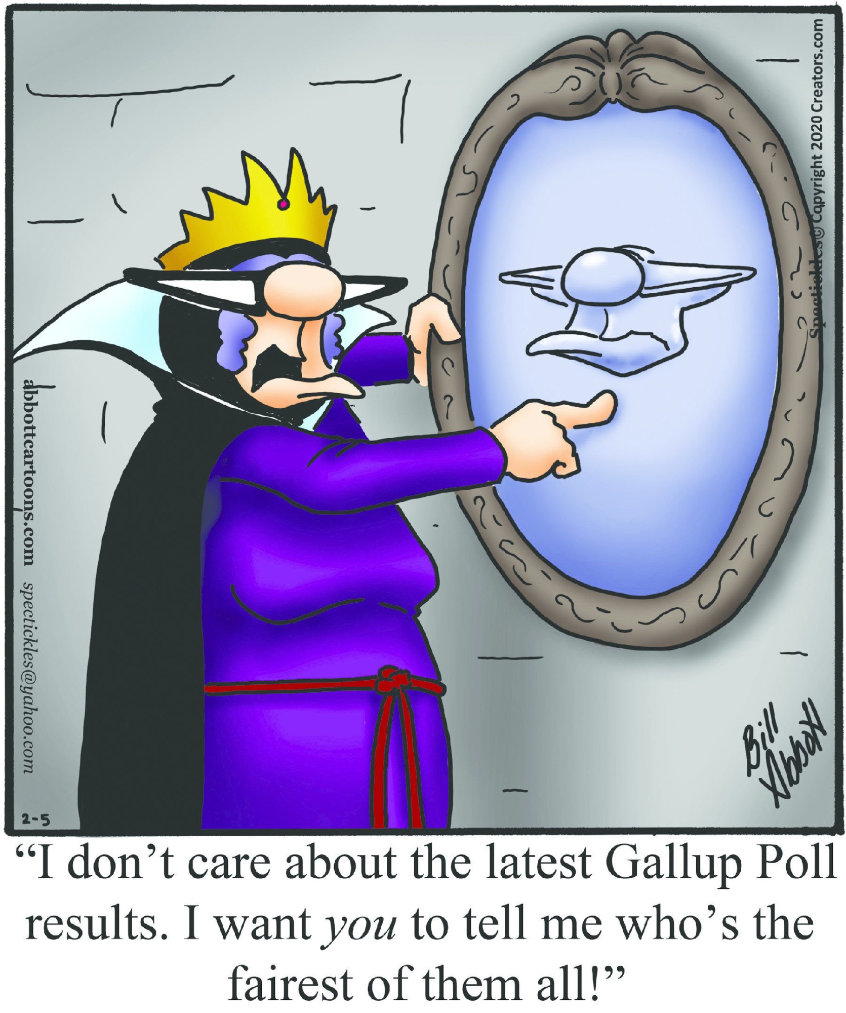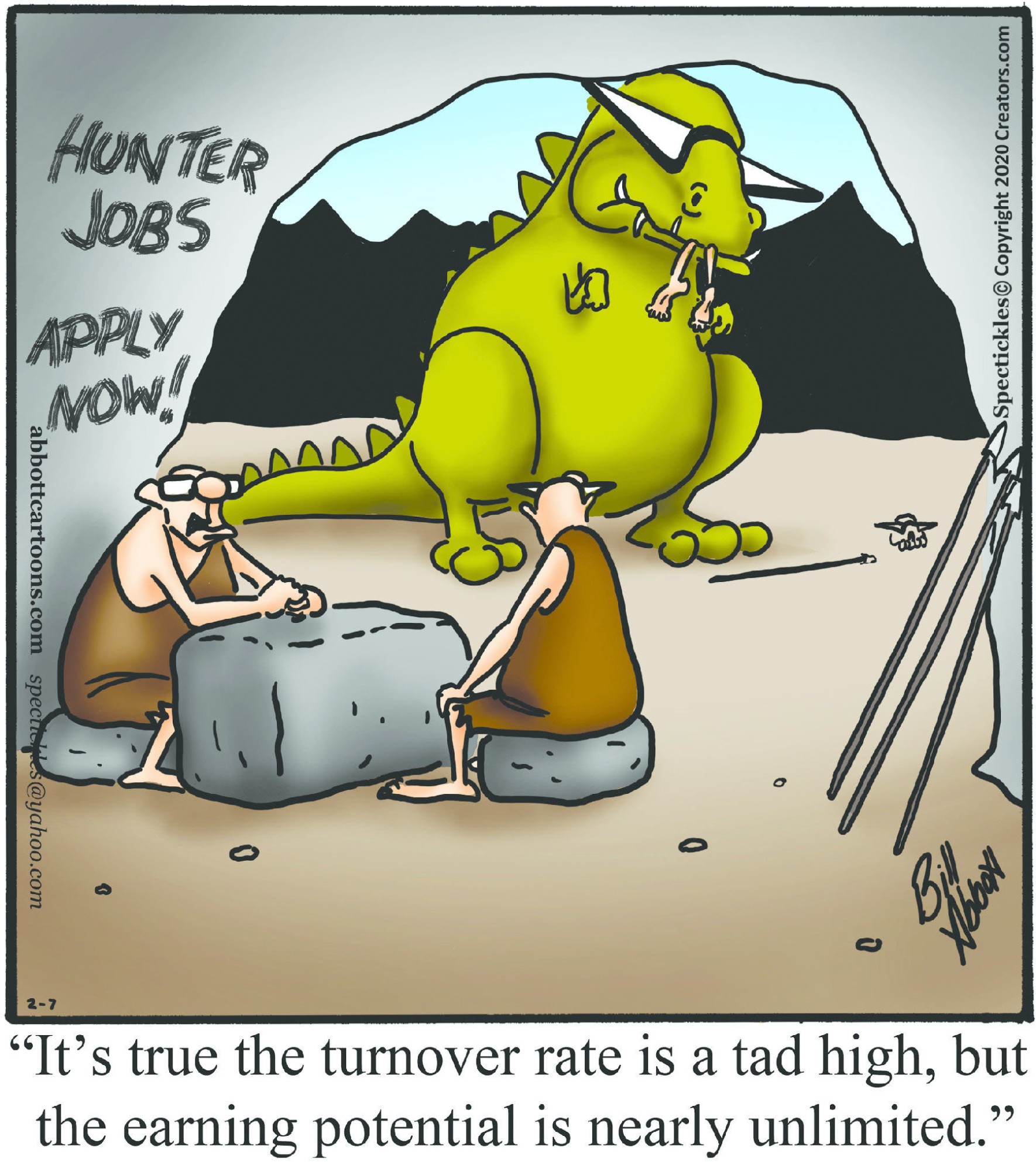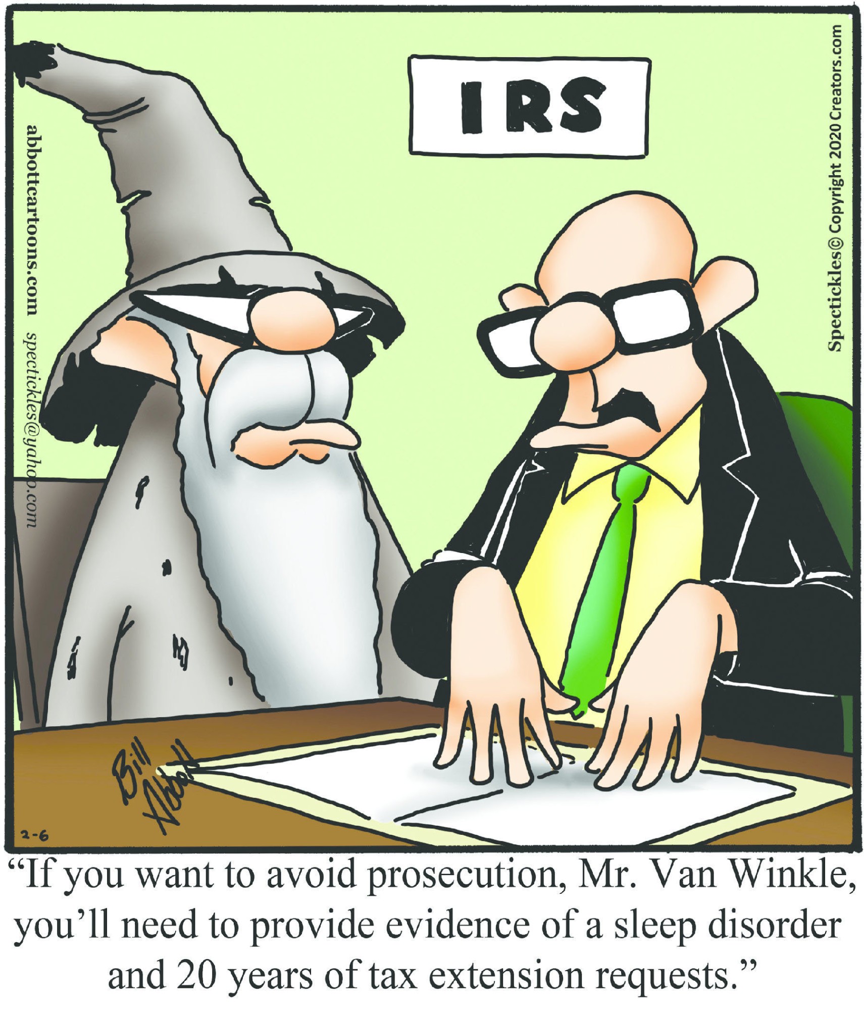 Spectickles, a cartoon primarily about a married couple with, to put it mildly, communication challenges, is an amalgamation of physical traits that author Bill Abbott finds humorous: the deadpan expression and gravity-tugged flesh of Walter Matthau, the powerful presence of Ethel Merman, the glasses of his great-grand-parents and a host of other subtleties. Creators Syndicate