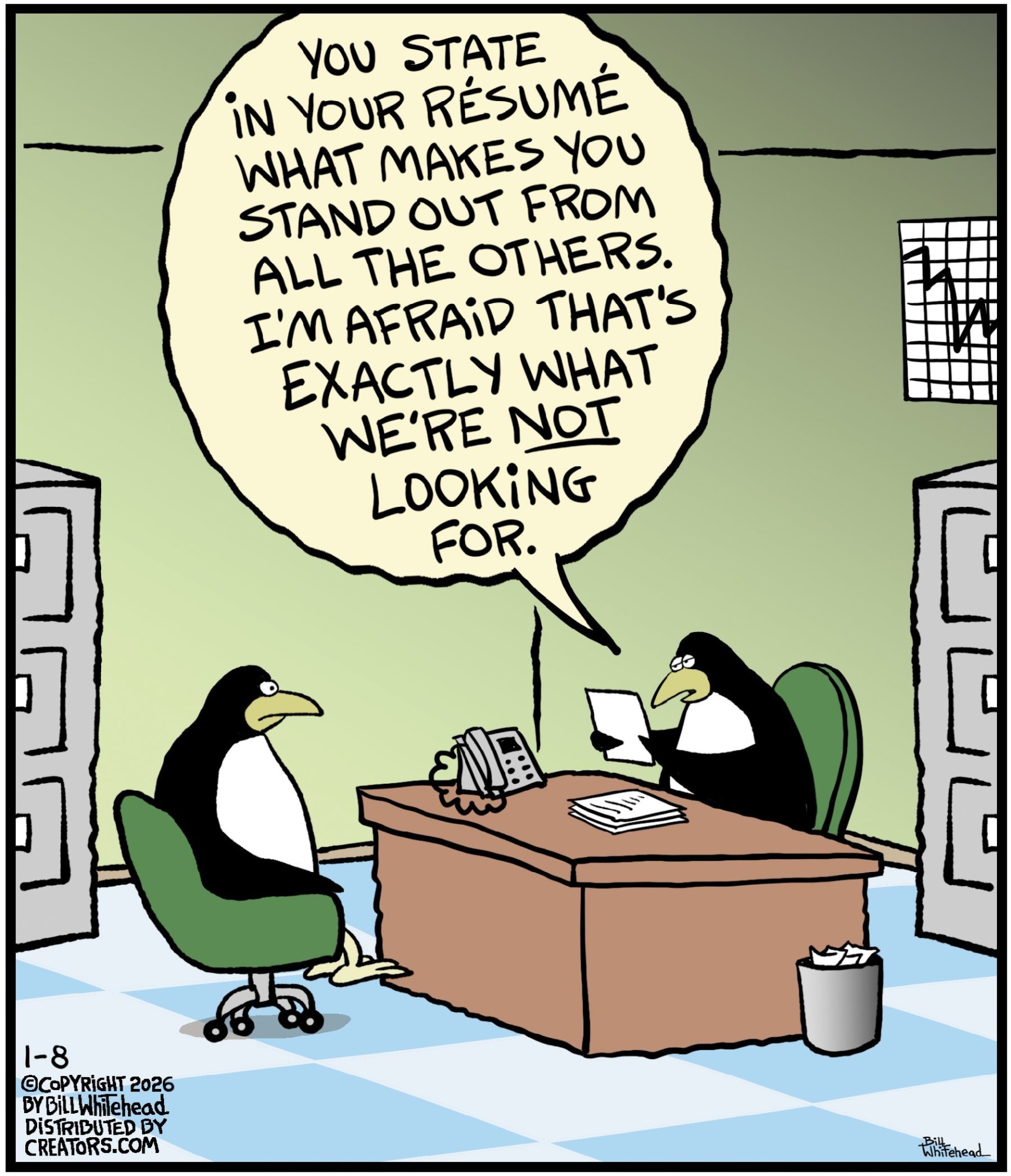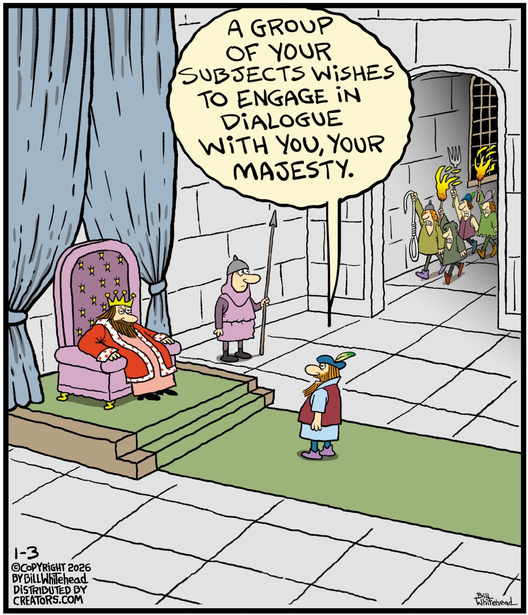 Bill’s career in cartooning started in the fifth grade, when he would copy drawings from comic strips, the New Yorker magazine and editorial cartoons. After a while he developed his own style, focusing primarily on the drawing. He soon realized his characters would need something to do and say, so he gave them their own odd little world to live in. Soon everyone around him became fair game. By college, Bill was cartooning for the school paper. Later, he created posters for book and record stores and freelanced for the Saturday Evening Post, Advertising Age, the Boston Phoenix, Wall Street Journal and King Features. In the '80s, he syndicated Sidelines, a sports panel cartoon. Creators Syndicate