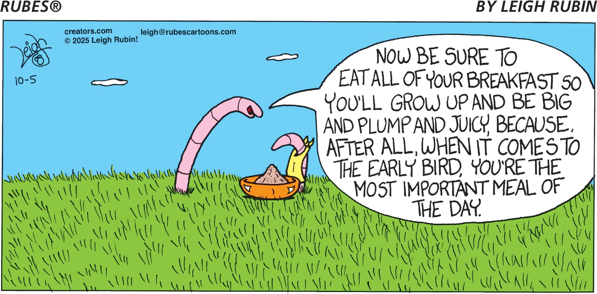 Talking cows, less-than-bright kids, and multiple varieties of flora and fauna make their appearance in the witty offbeat cartoon panel "Rubes" by Leigh Rubin. Rubin’s hilarious cast of characters and absurd view of the world have made "Rubes" a favorite with readers everywhere. Creators Syndicate