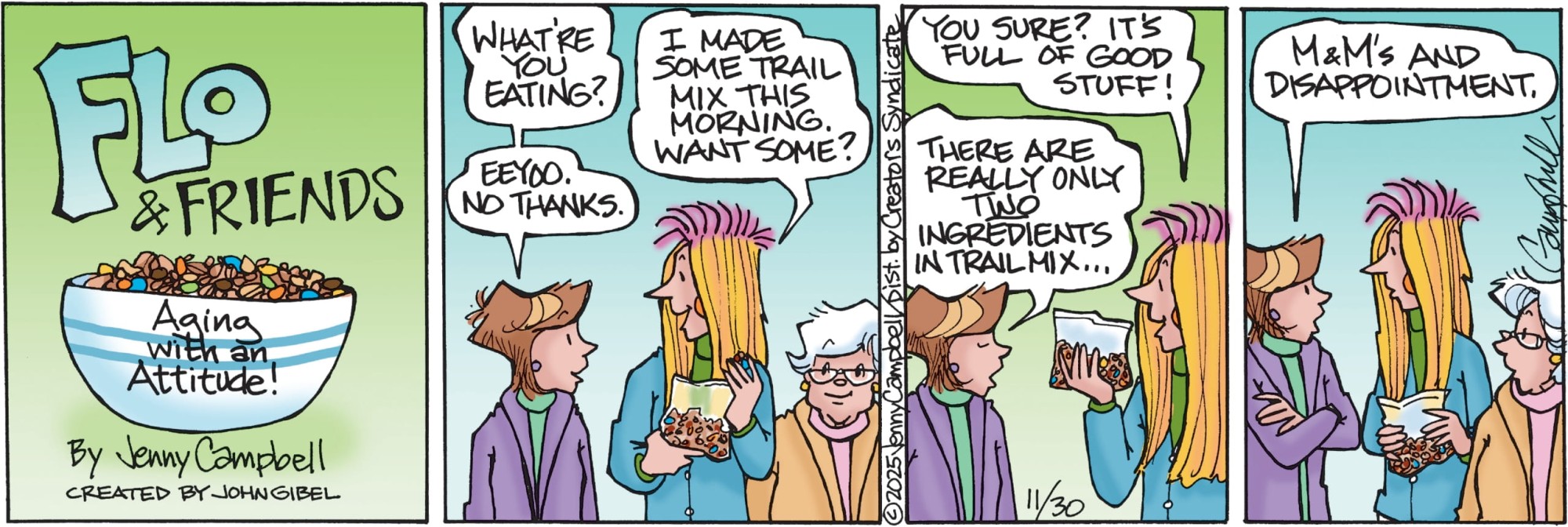Cartoonist Jenny Campbell has created a spirited and intelligent look at aging and the generation gap. This strip features a group of older women and men dealing with the perils and perks of being old, the rules of chocolate, and the challenges of families. “Flo and Friends” is graceful, poignant, and full of humor.