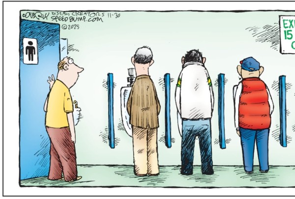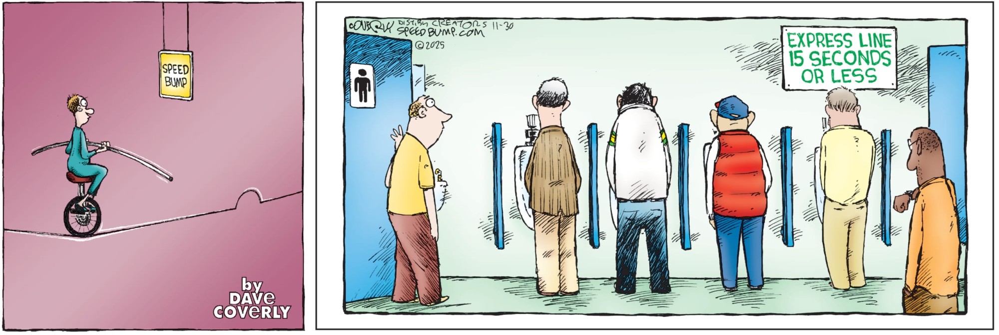 Dave Coverly admits there is no overriding theme, no tidy little philosophy that precisely describes what “Speed Bump” is about. “Basically,” he says, “if life were a movie, these would be the outtakes.”