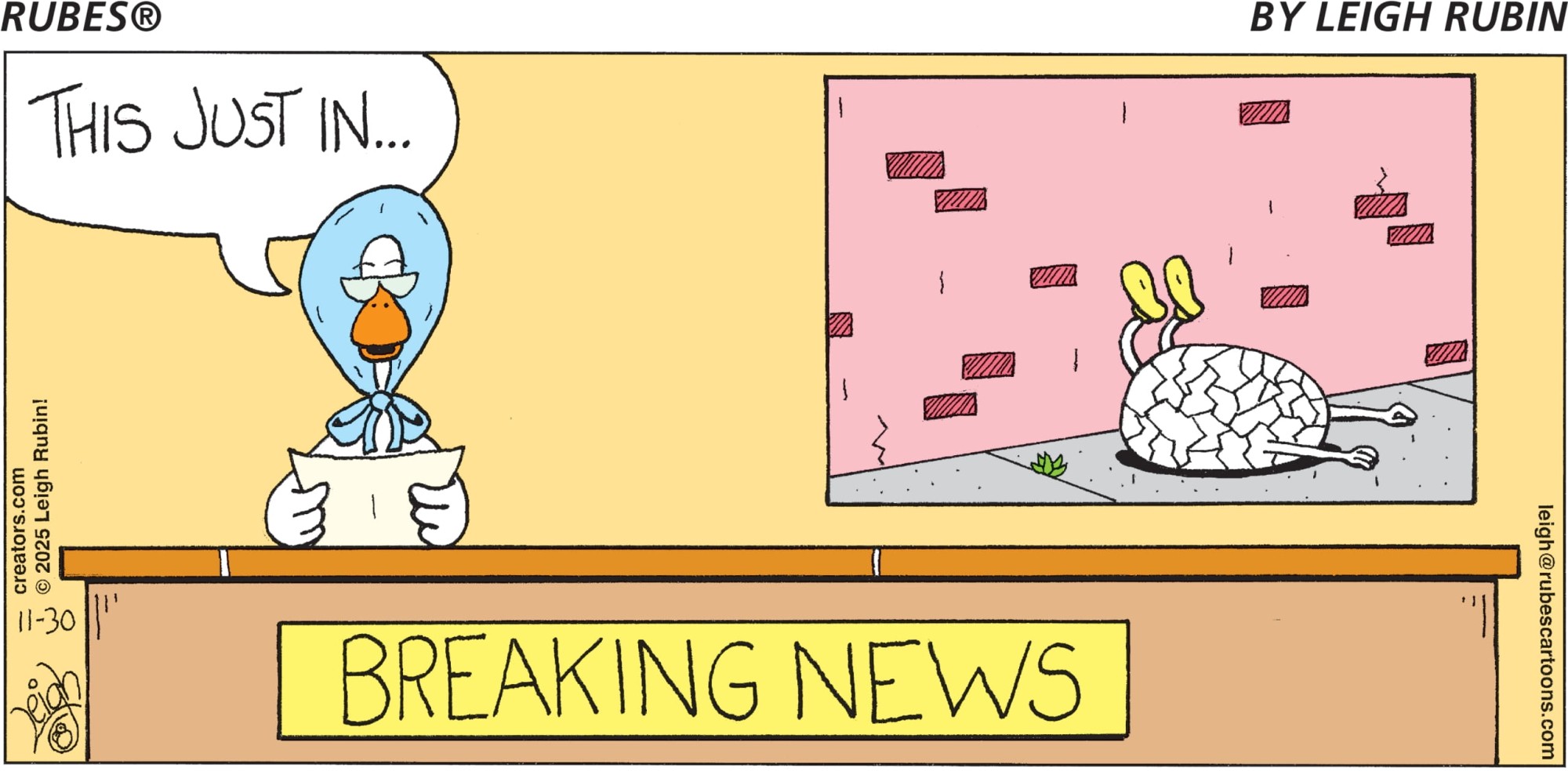 Talking cows, less-than-bright kids, and multiple varieties of flora and fauna make their appearance in the witty offbeat cartoon panel “Rubes” by Leigh Rubin. Rubin’s hilarious cast of characters and absurd view of the world have made “Rubes” a favorite with readers everywhere.