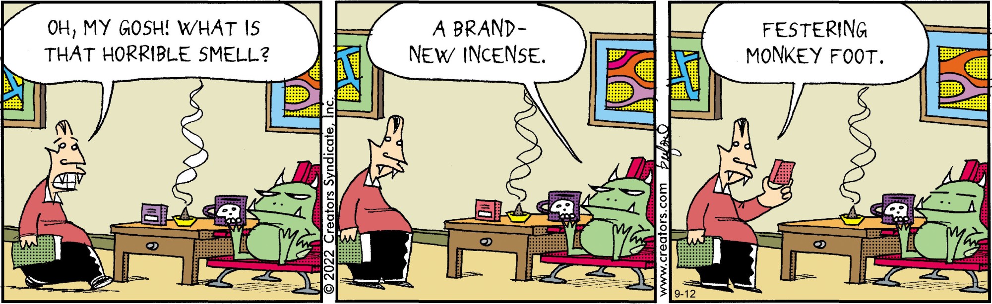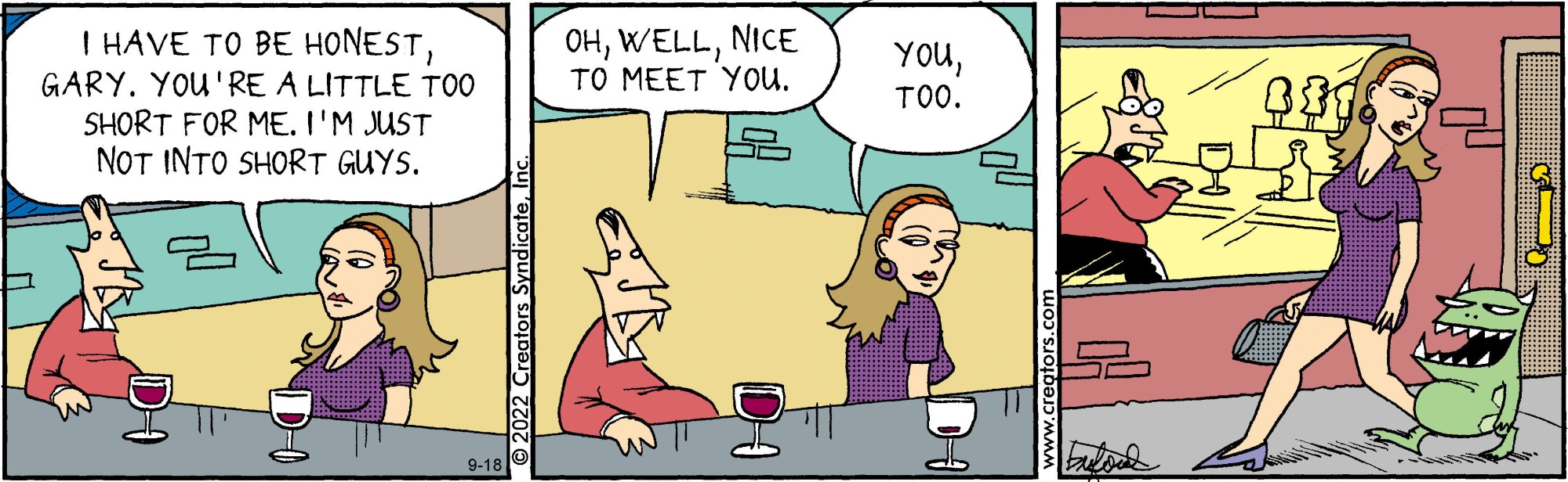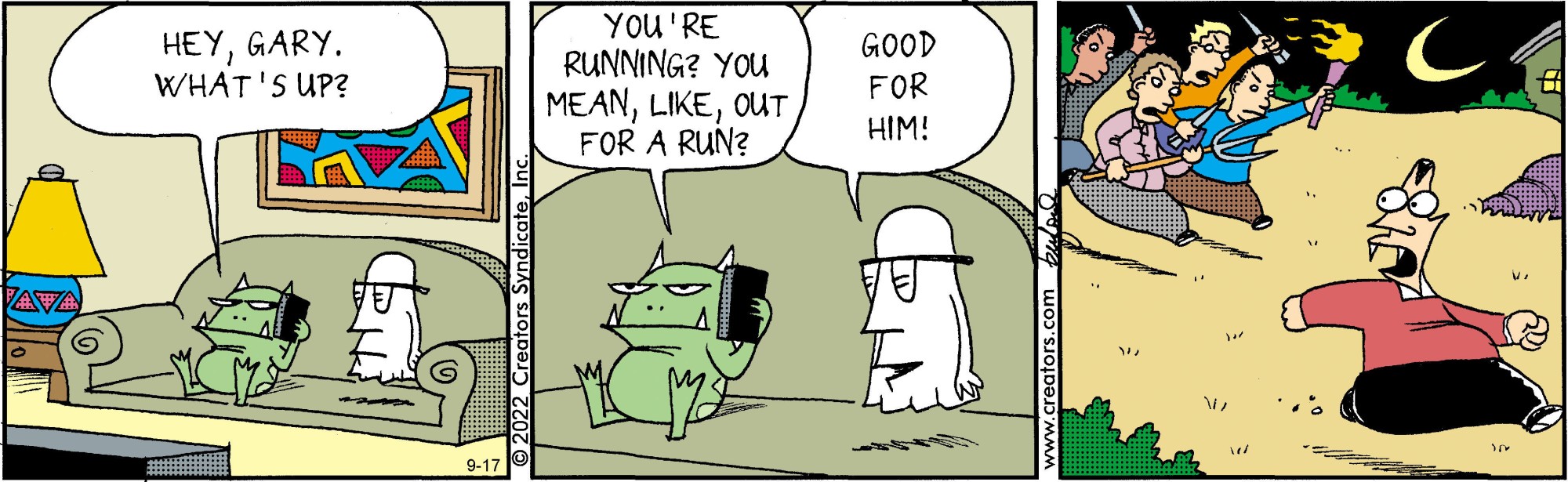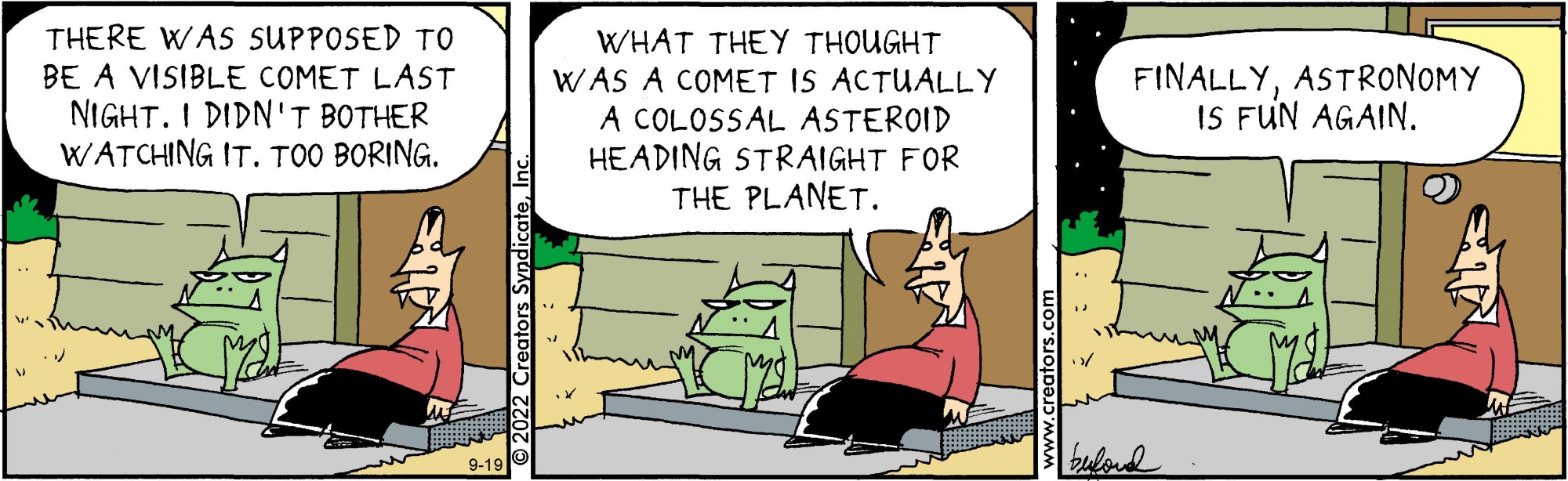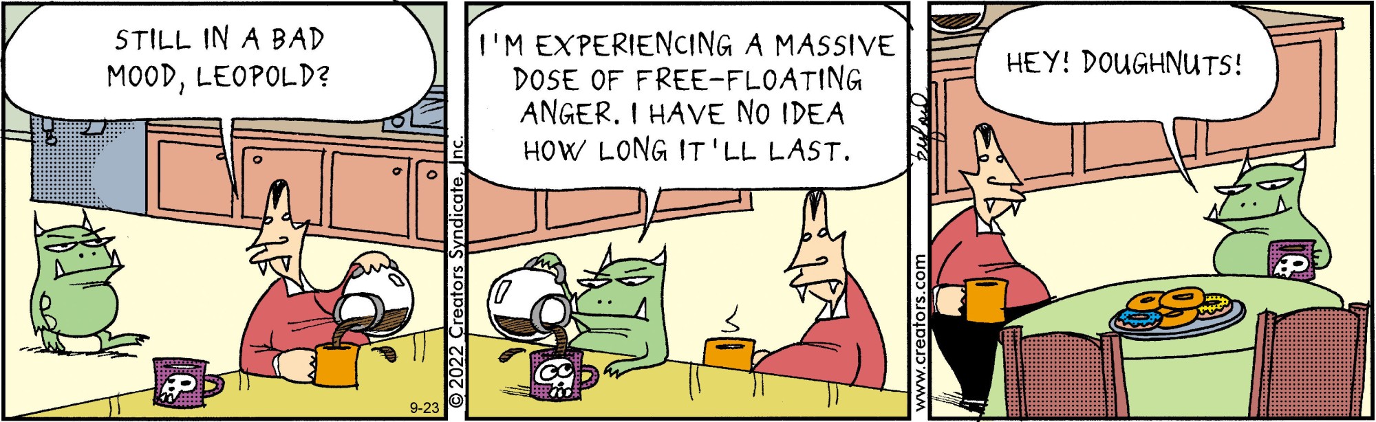Mark Buford's "Scary Gary" presents an all-too-common problem: vampires in the suburbs. But this vampire isn't out for blood; Gary has turned over a new leaf. Hanging up his cape for good, Gary takes up residence in a quiet community, dragging his less-than-thrilled assistant, Leopold, with him. While Gary embraces the serenity of suburban life, Leopold is always cooking up one plan or another to terrorize the neighborhood. Creators Syndicate