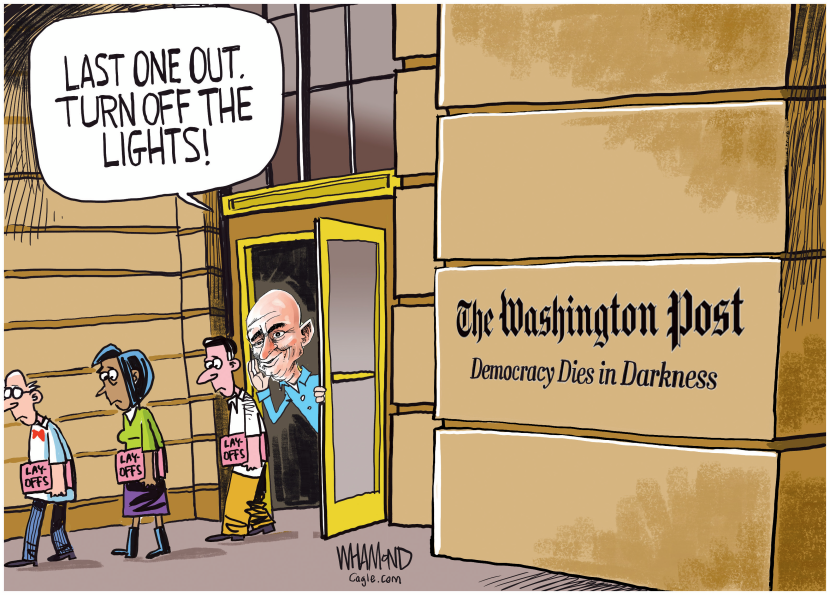 At least the Post didn’t lay off their staff cartoonist – she quit last year, when her editor tried to kill a cartoon going after Bezos and other billionaires for sucking up to Trump. Doesn’t look like much has changed.