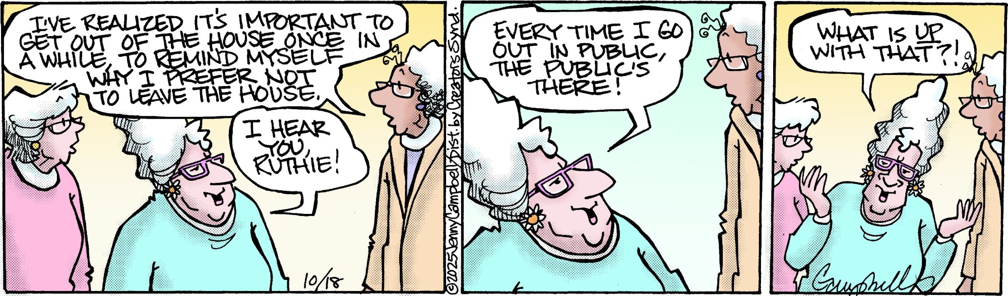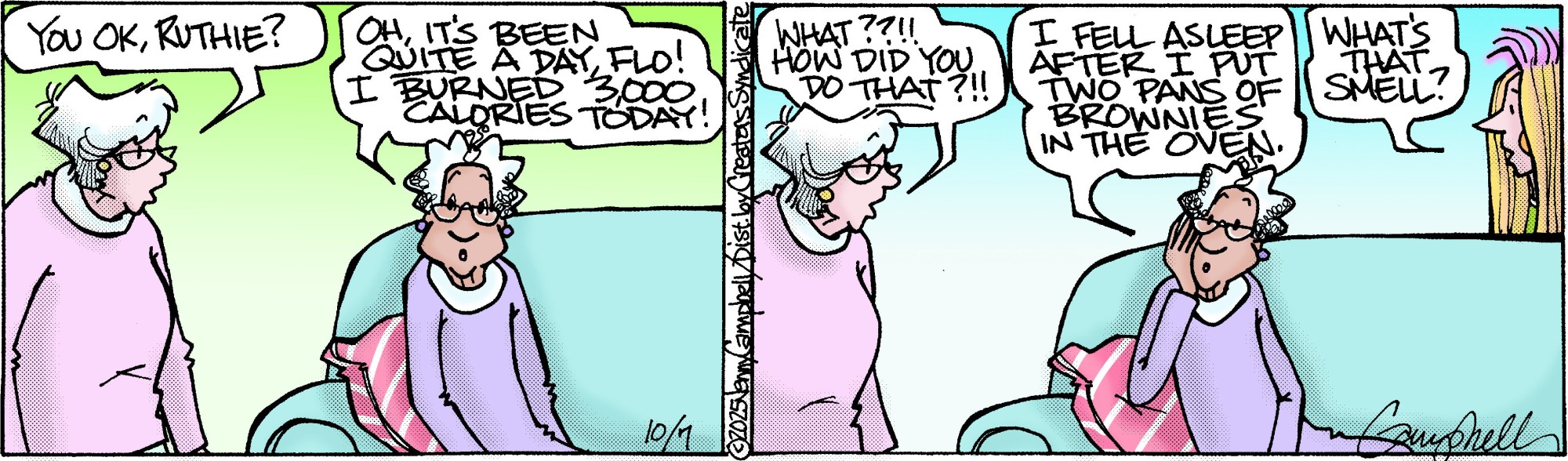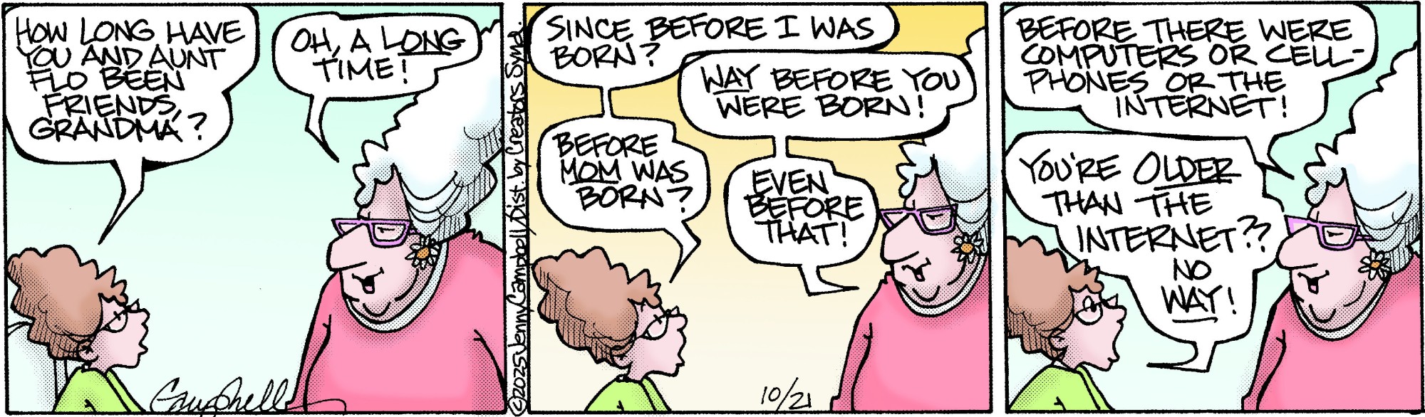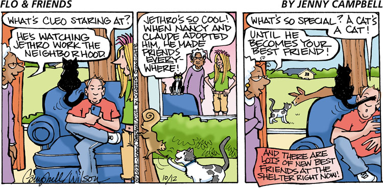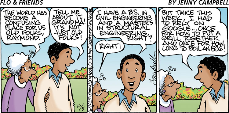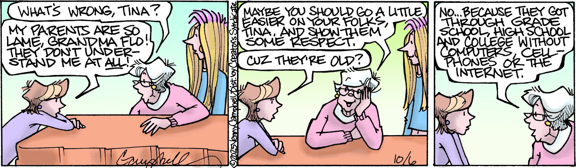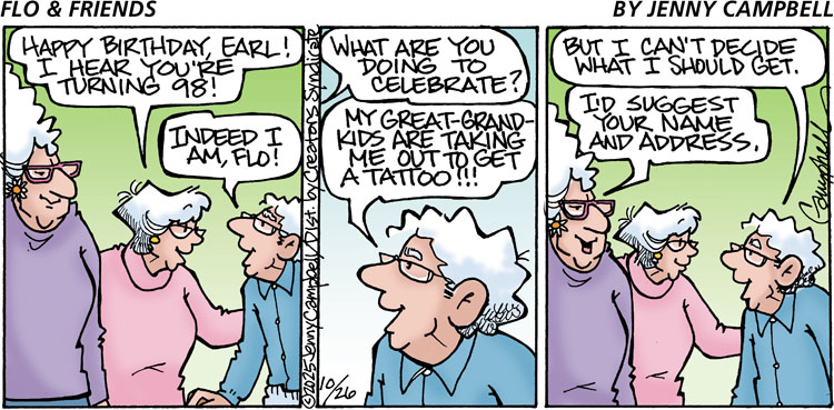 Cartoonist Jenny Campbell has created a spirited and intelligent look at aging and the generation gap. This strip features a group of older women and men dealing with the perils and perks of being old, the rules of chocolate, and the challenges of families. "Flo and Friends" is graceful, poignant, and full of humor. Creators Syndicate