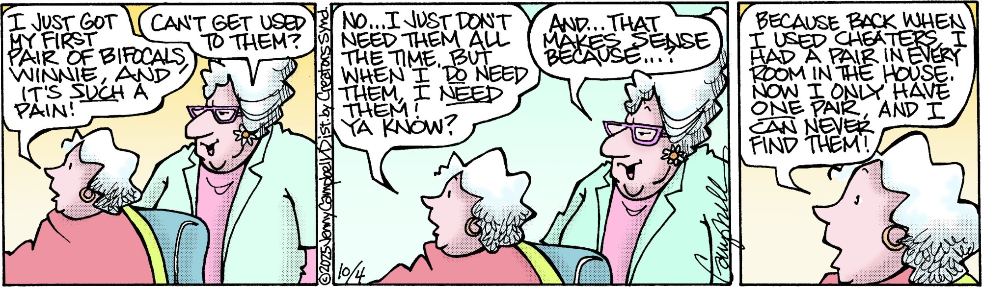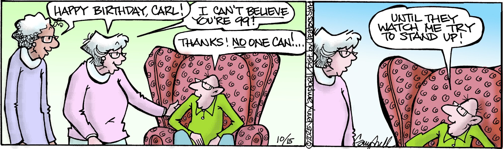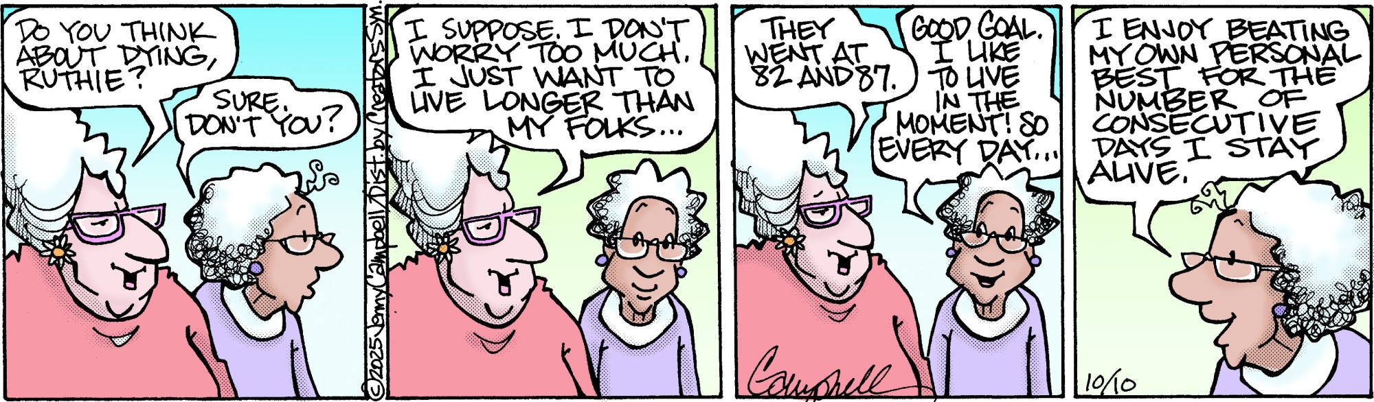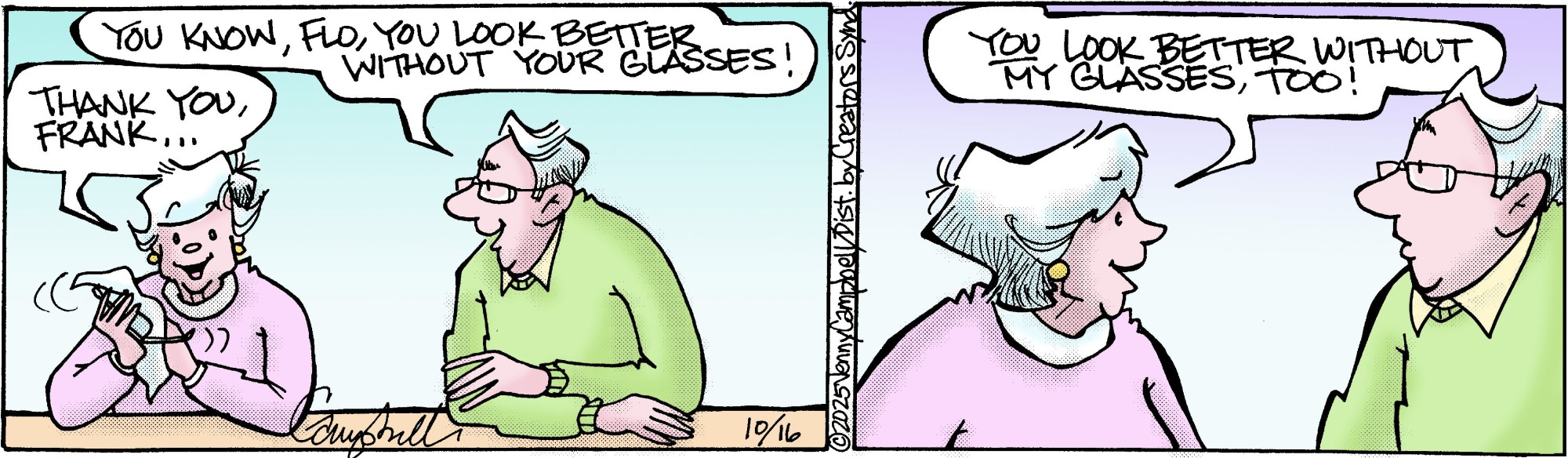 Cartoonist Jenny Campbell has created a spirited and intelligent look at aging and the generation gap. This strip features a group of older women and men dealing with the perils and perks of being old, the rules of chocolate, and the challenges of families. "Flo and Friends" is graceful, poignant, and full of humor. Creators Syndicate
