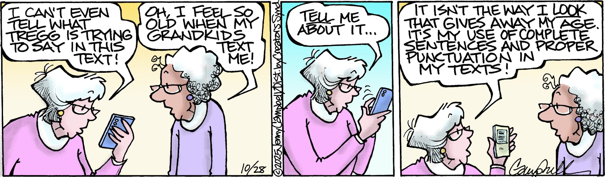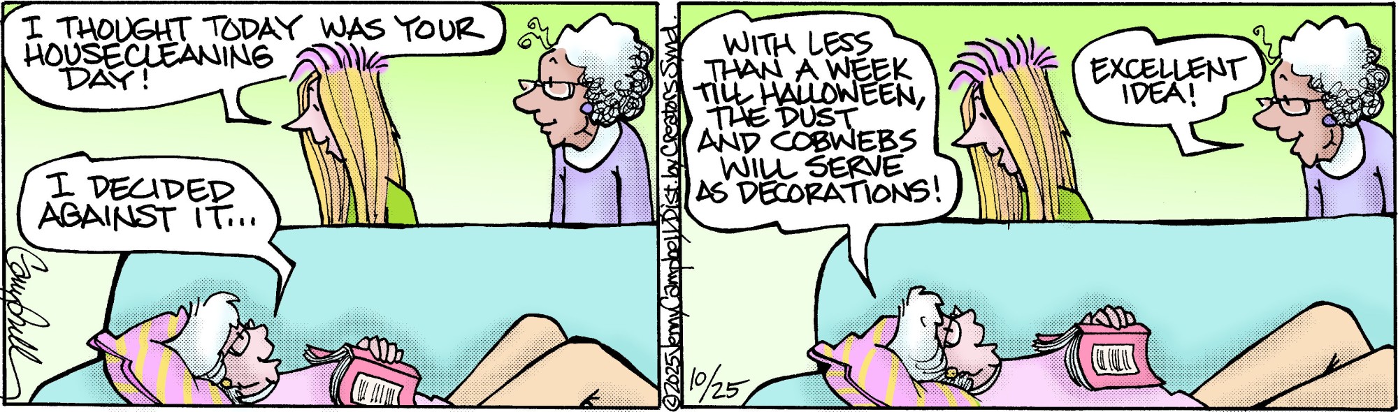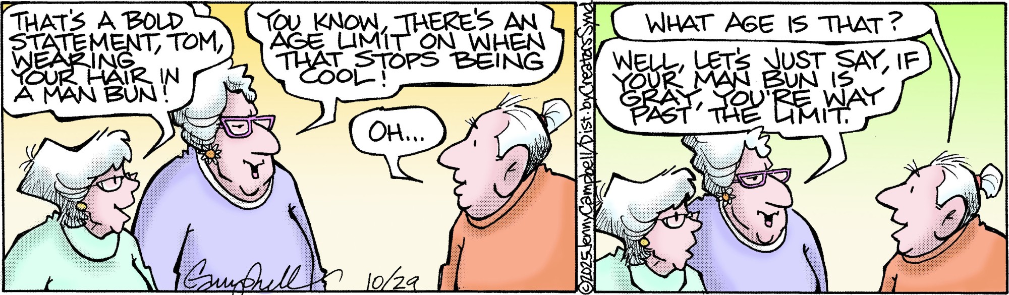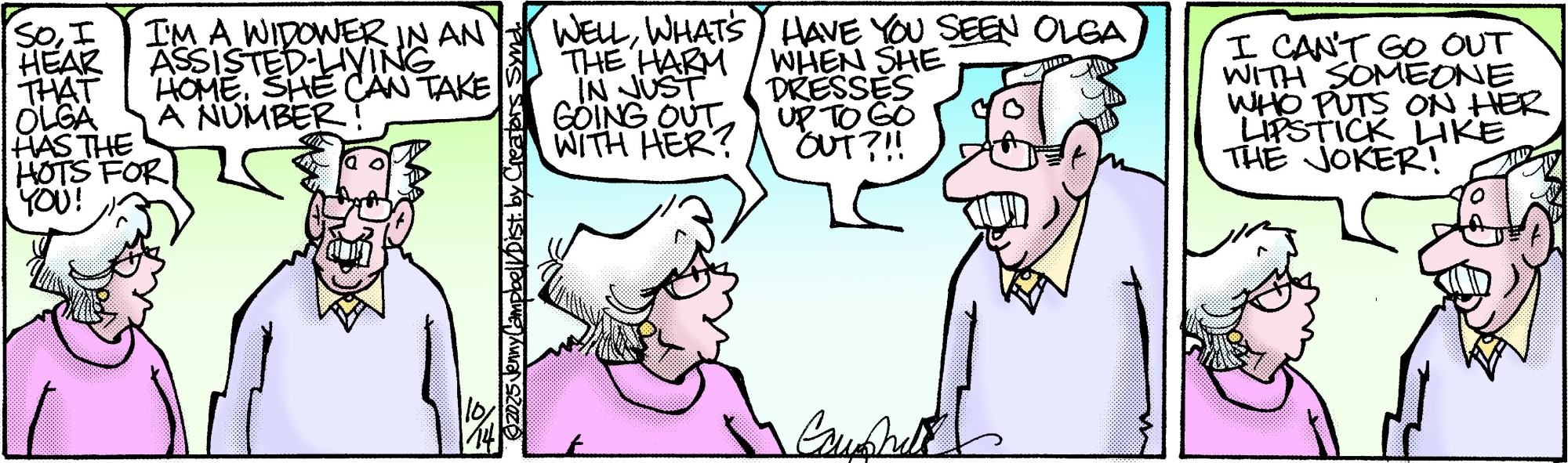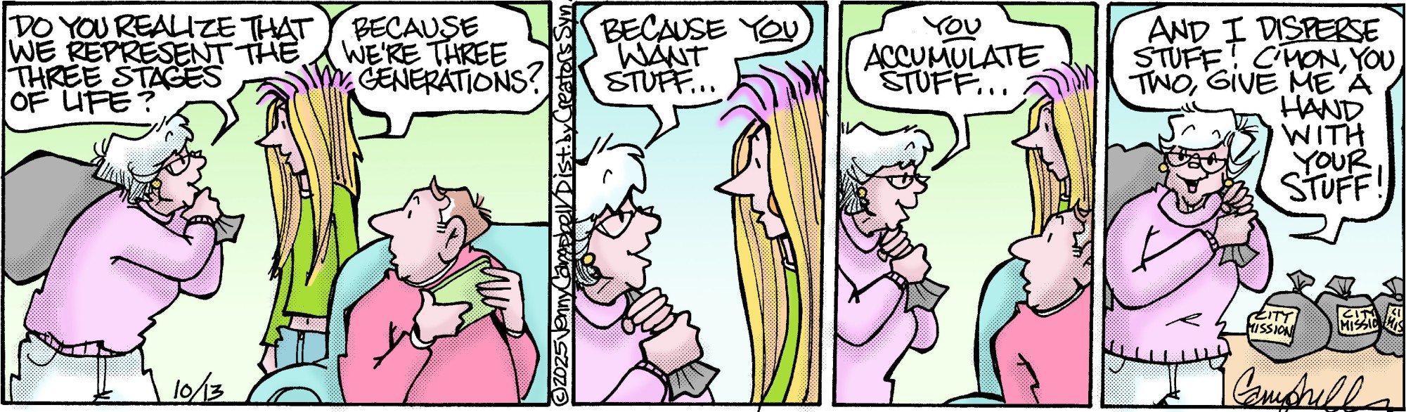 Cartoonist Jenny Campbell has created a spirited and intelligent look at aging and the generation gap. This strip features a group of older women and men dealing with the perils and perks of being old, the rules of chocolate, and the challenges of families. "Flo and Friends" is graceful, poignant, and full of humor. Creators Syndicate