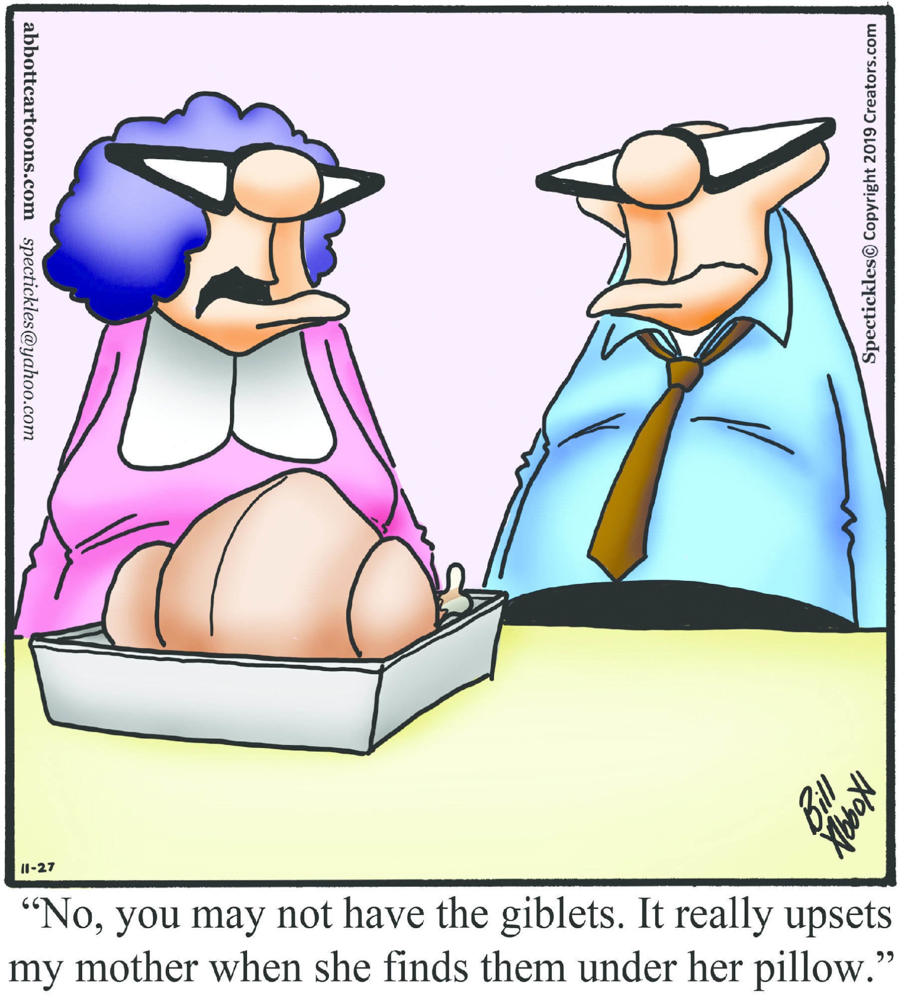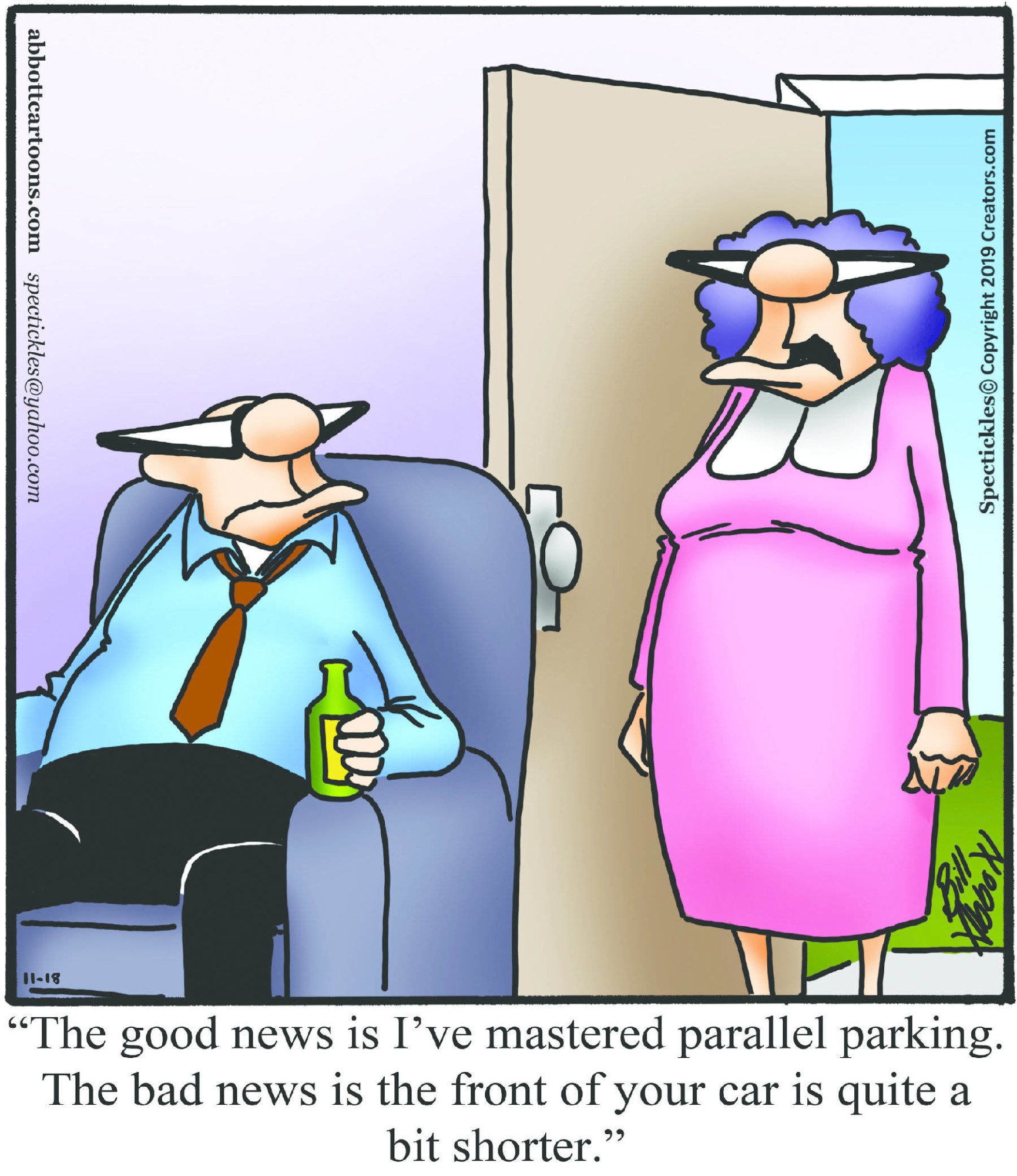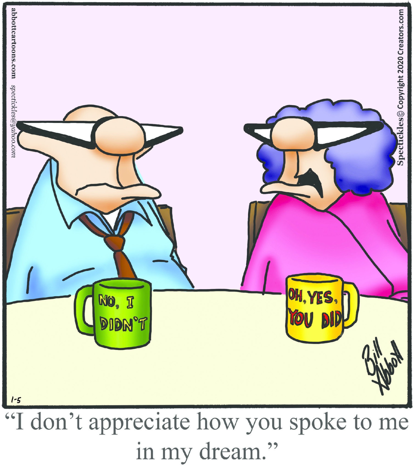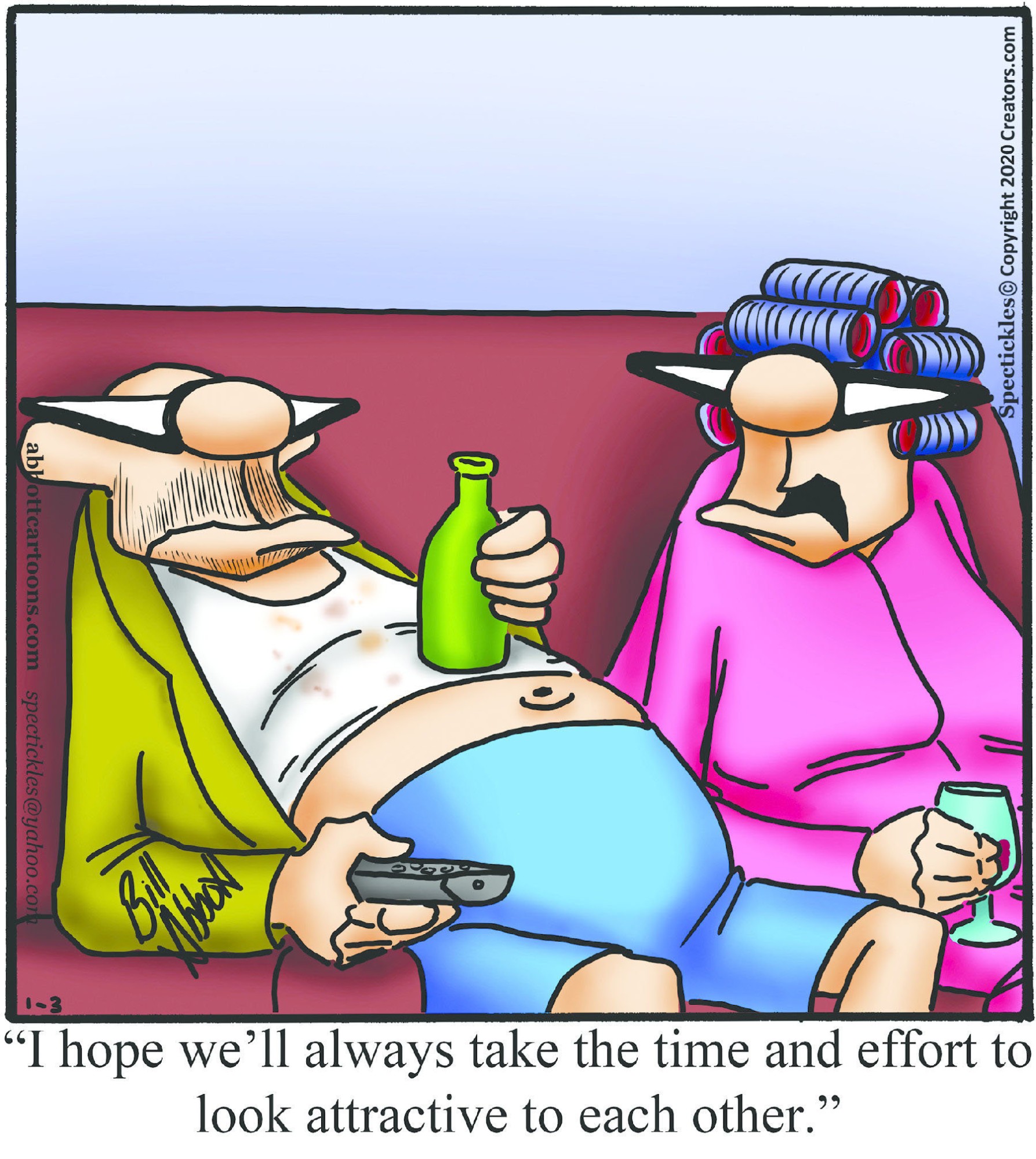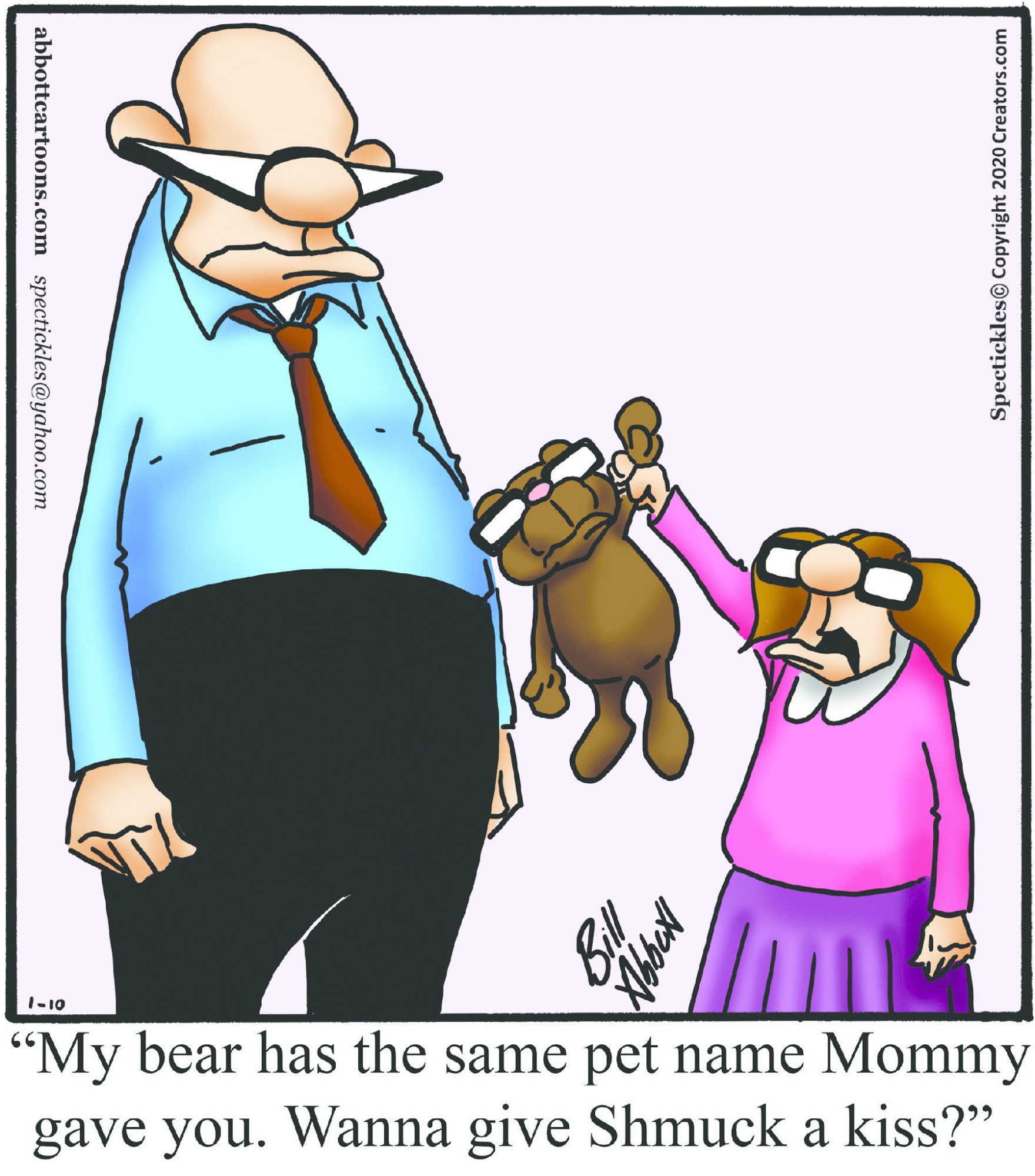 Spectickles, a cartoon primarily about a married couple with, to put it mildly, communication challenges, is an amalgamation of physical traits that author Bill Abbott finds humorous: the deadpan expression and gravity-tugged flesh of Walter Matthau, the powerful presence of Ethel Merman, the glasses of his great-grand-parents and a host of other subtleties. Creators Syndicate