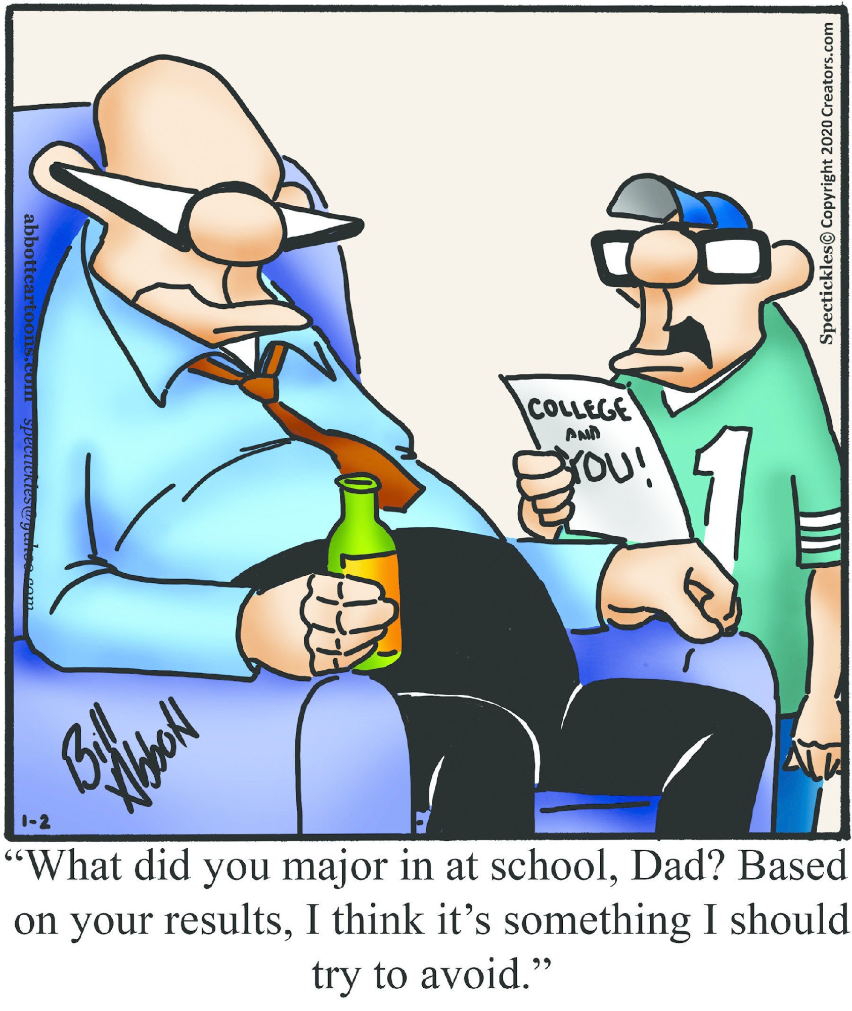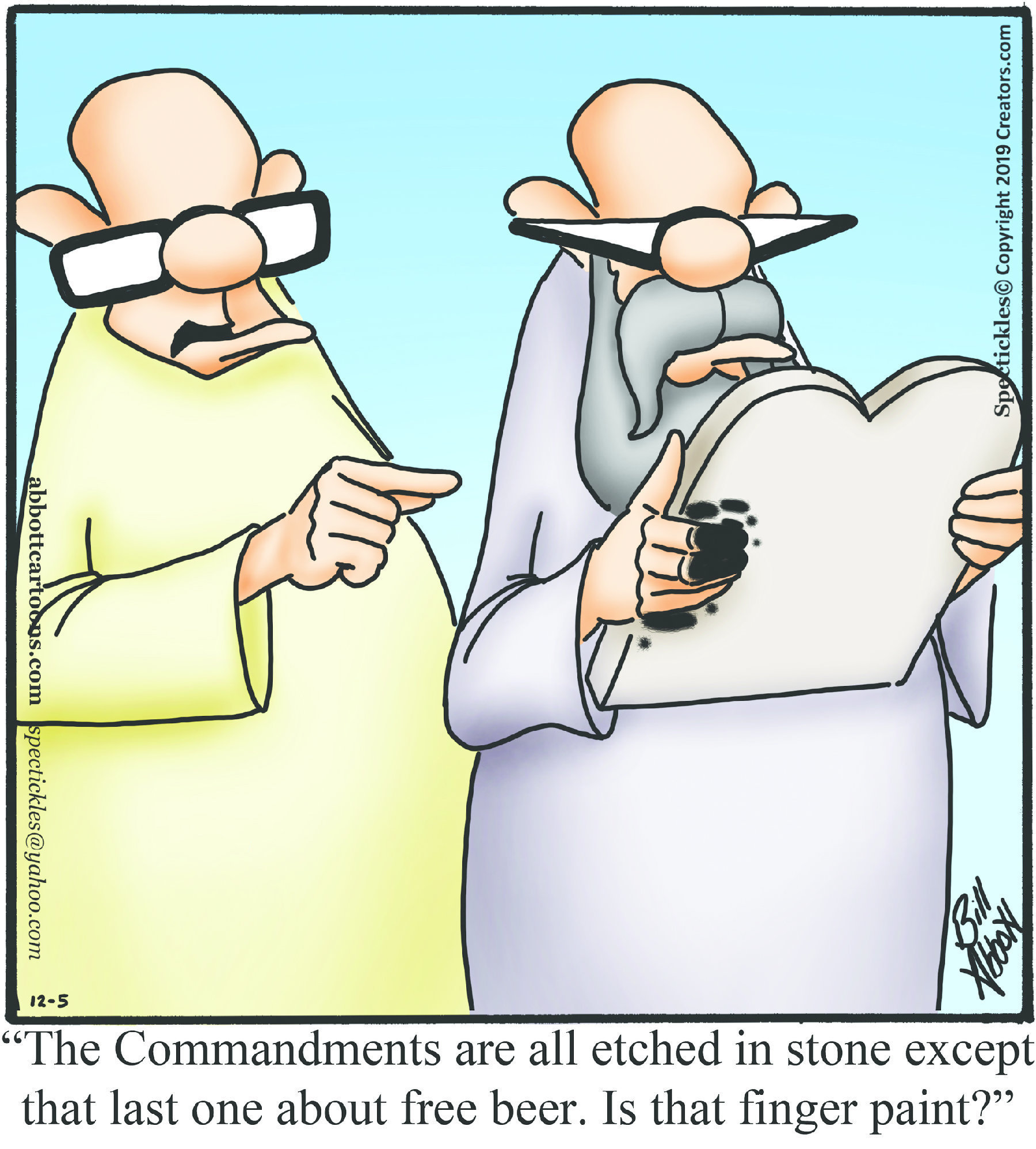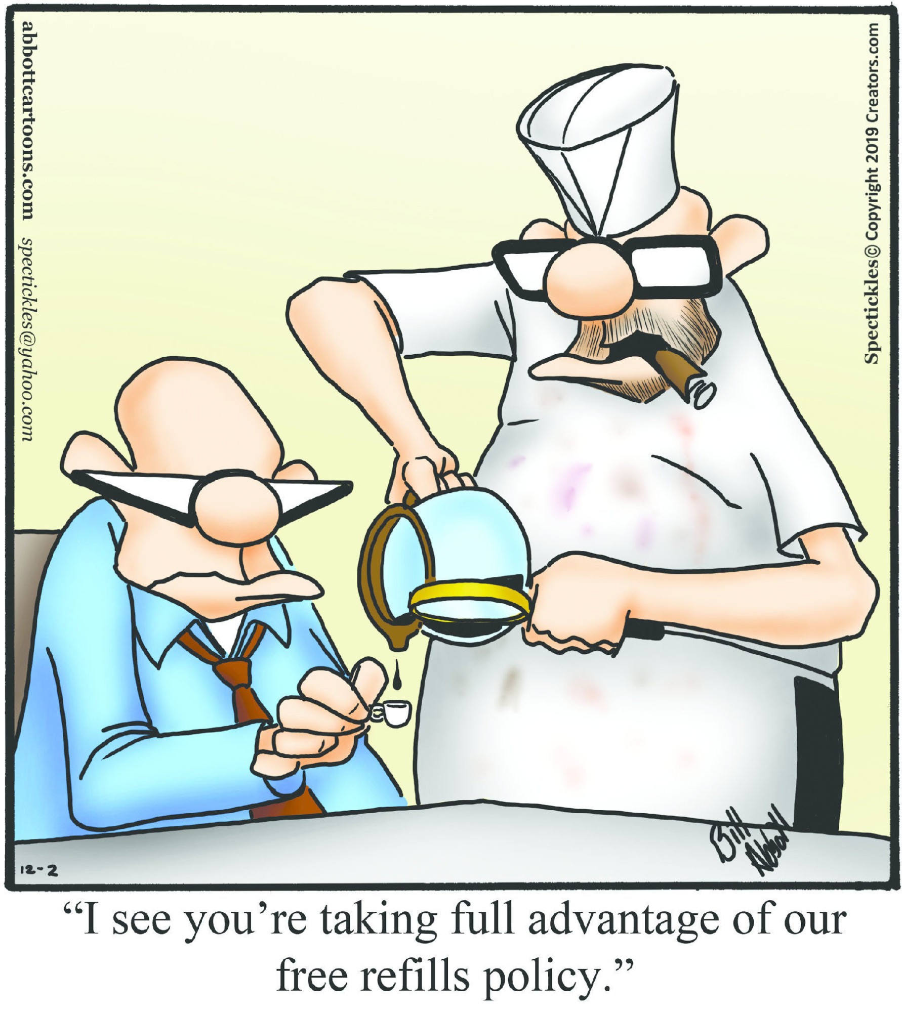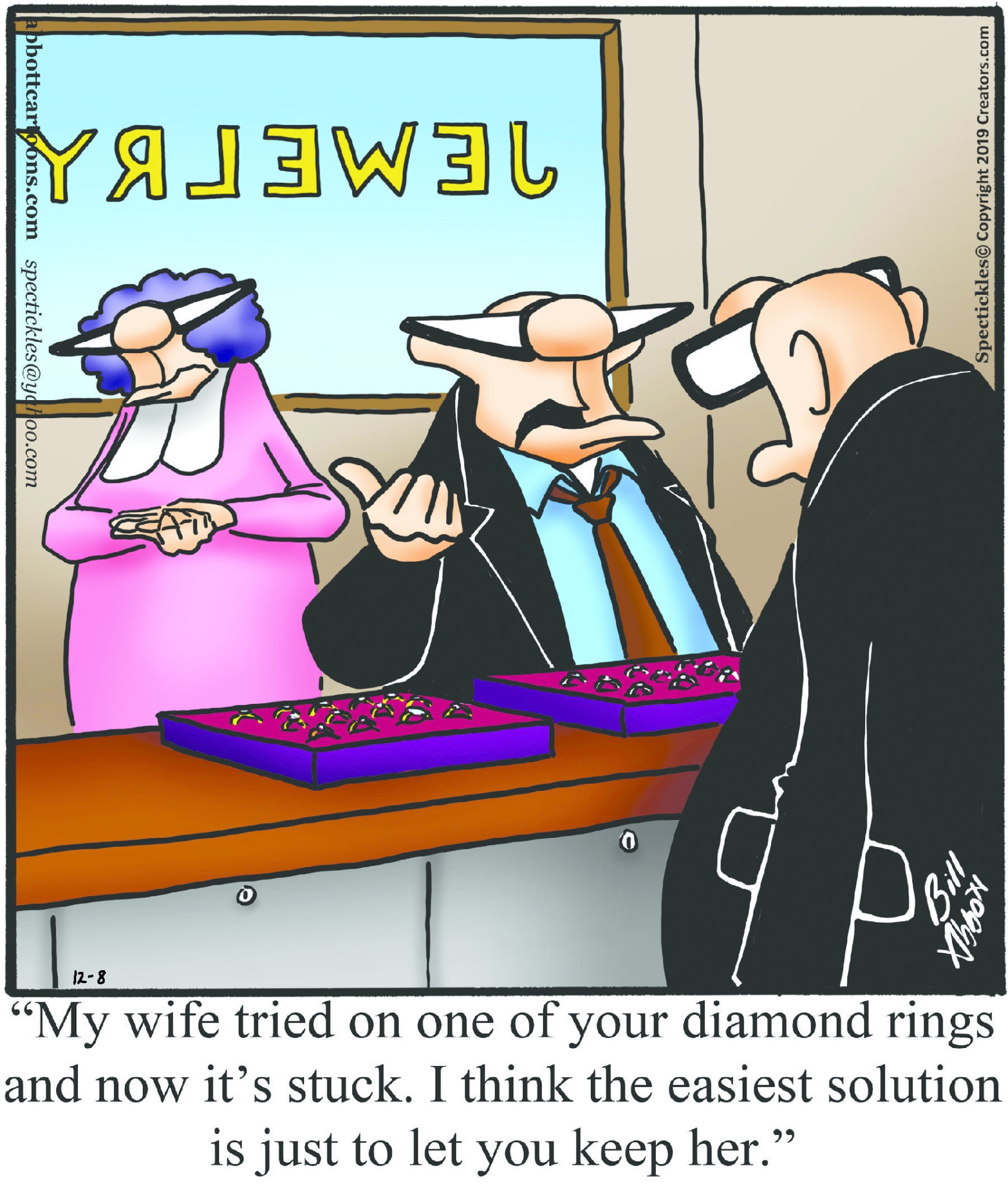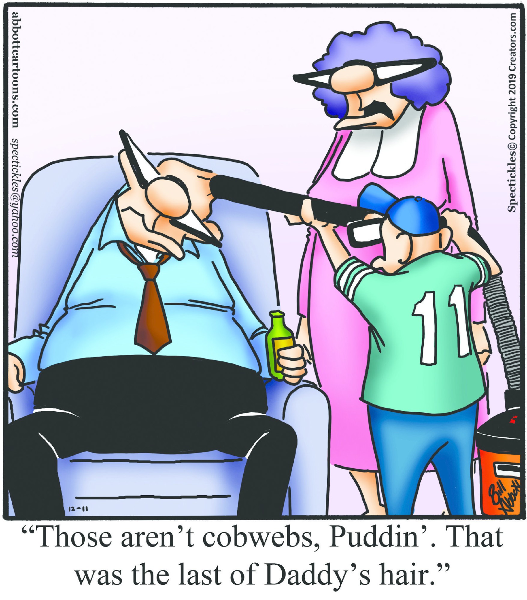 Spectickles, a cartoon primarily about a married couple with, to put it mildly, communication challenges, is an amalgamation of physical traits that author Bill Abbott finds humorous: the deadpan expression and gravity-tugged flesh of Walter Matthau, the powerful presence of Ethel Merman, the glasses of his great-grand-parents and a host of other subtleties. Creators Syndicate