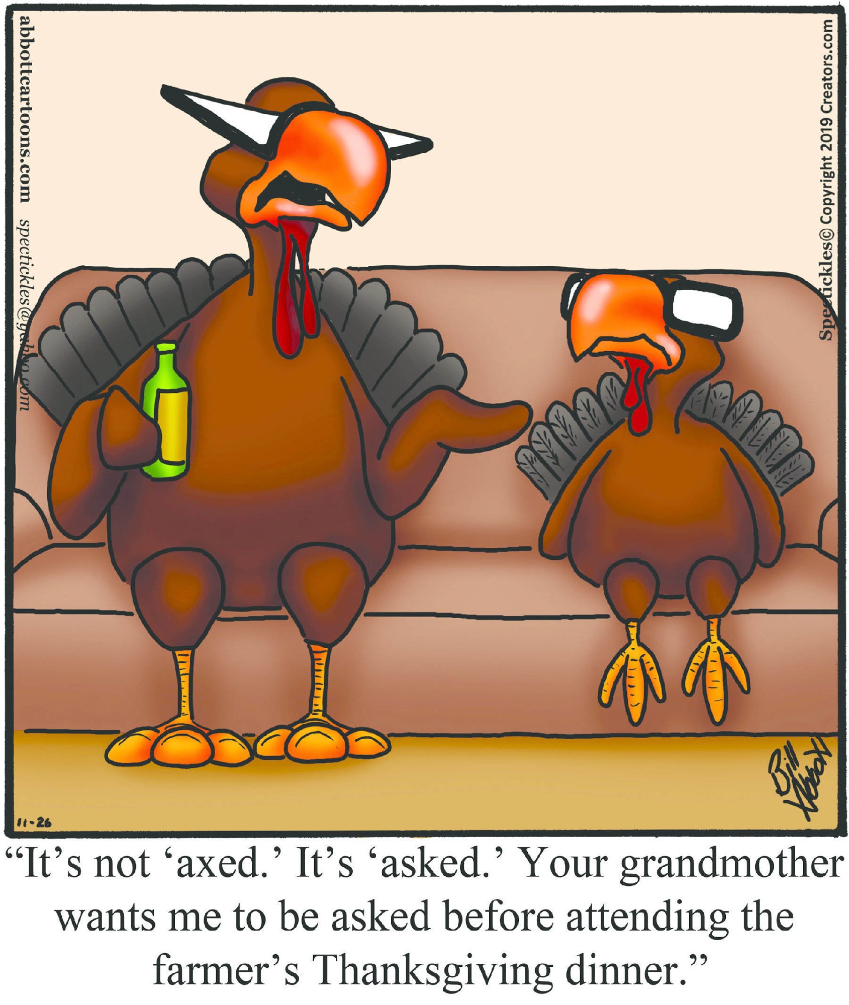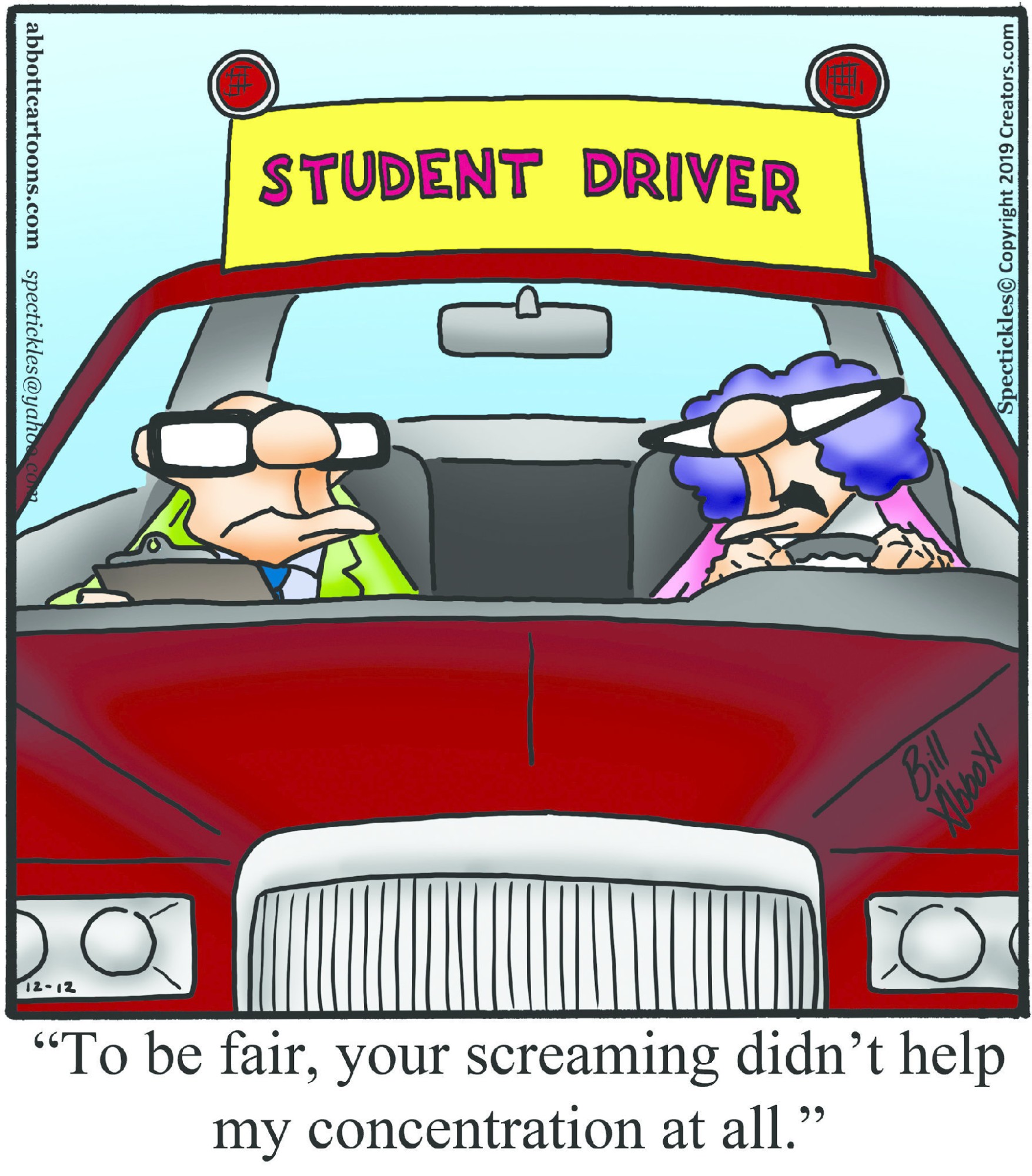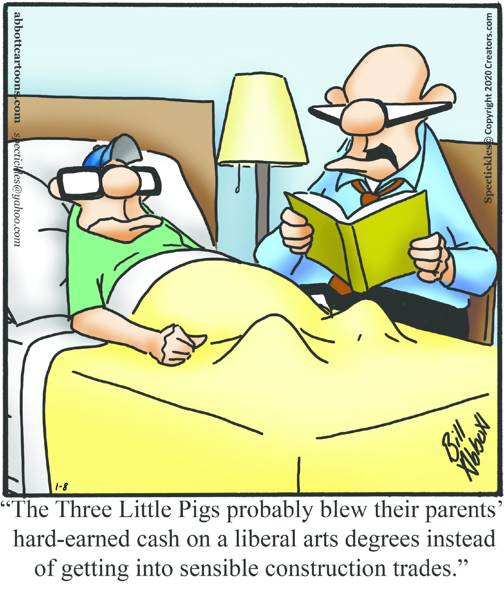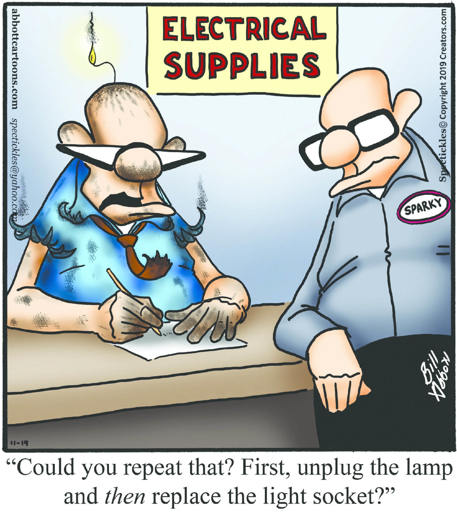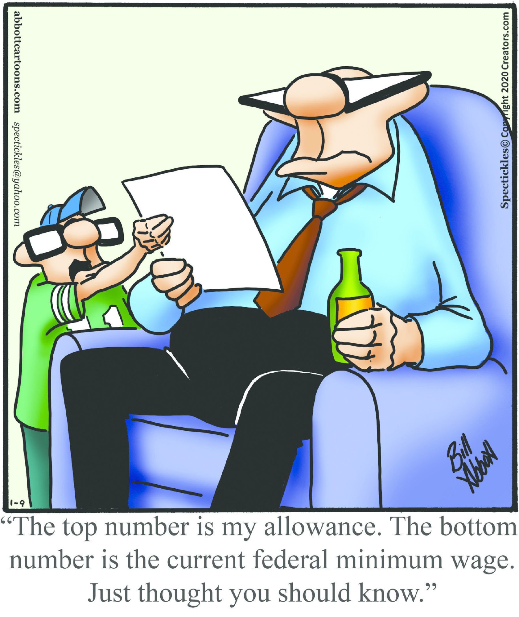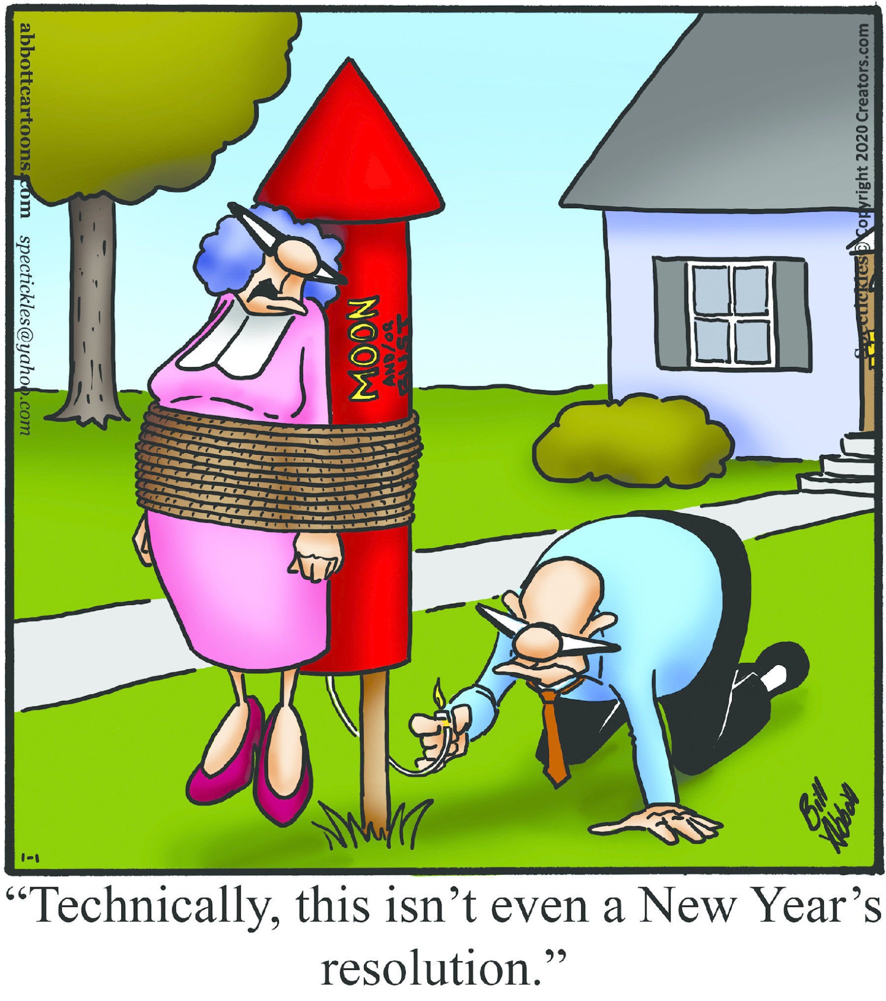 Spectickles, a cartoon primarily about a married couple with, to put it mildly, communication challenges, is an amalgamation of physical traits that author Bill Abbott finds humorous: the deadpan expression and gravity-tugged flesh of Walter Matthau, the powerful presence of Ethel Merman, the glasses of his great-grand-parents and a host of other subtleties. Creators Syndicate