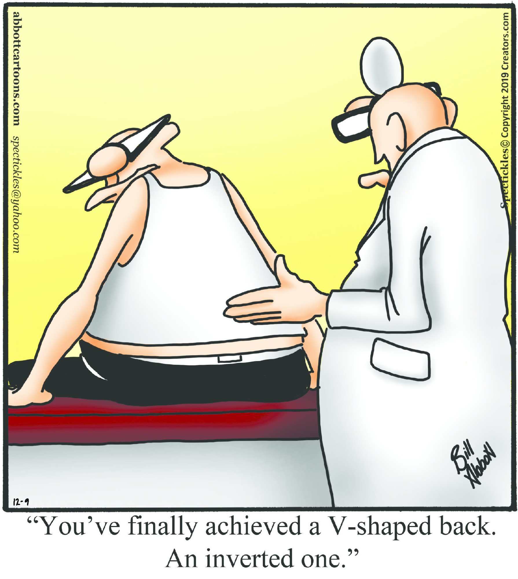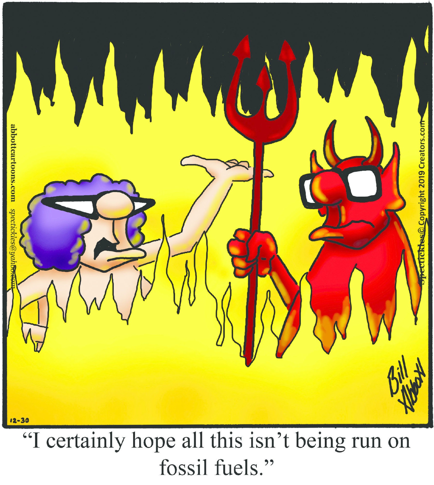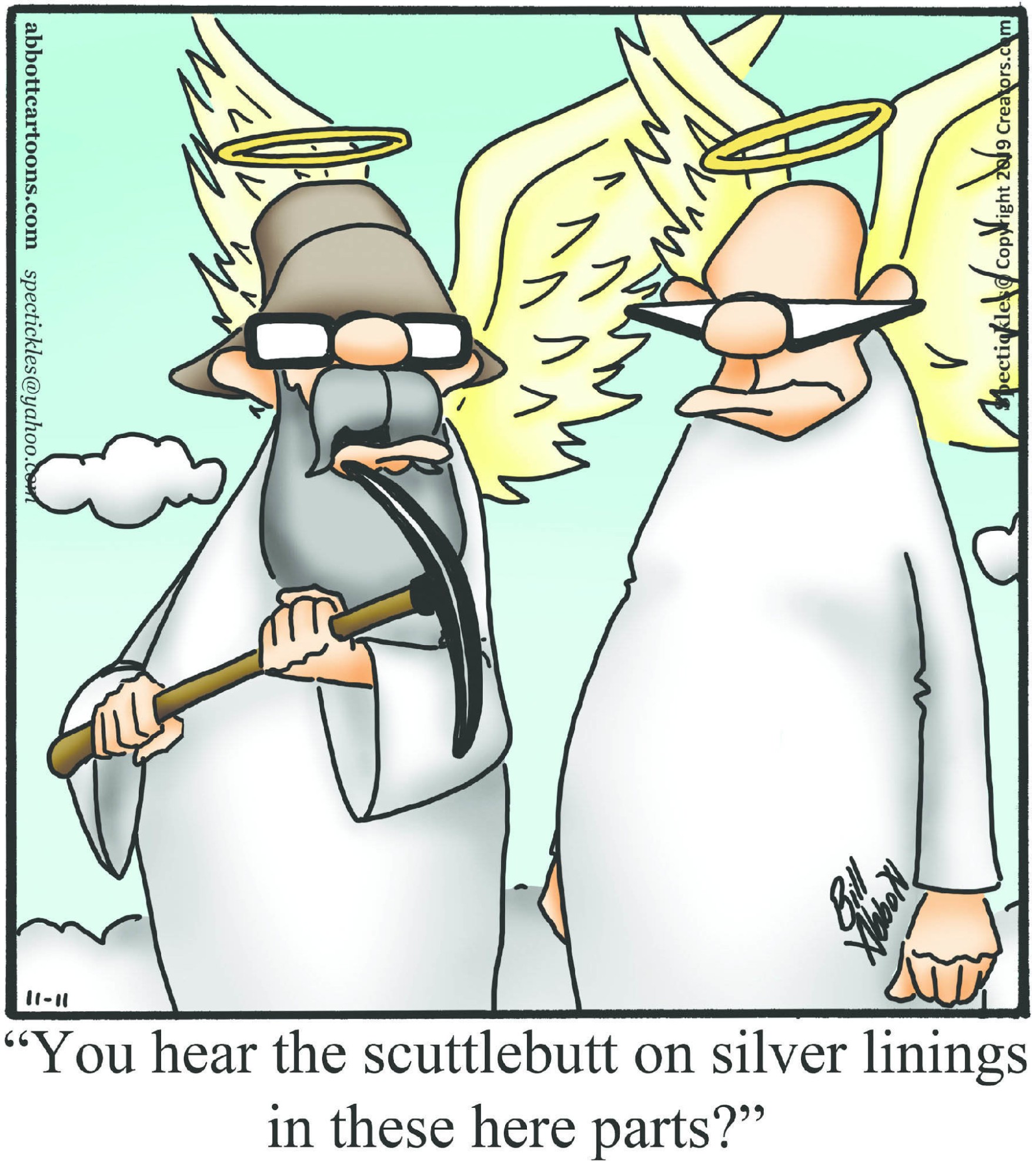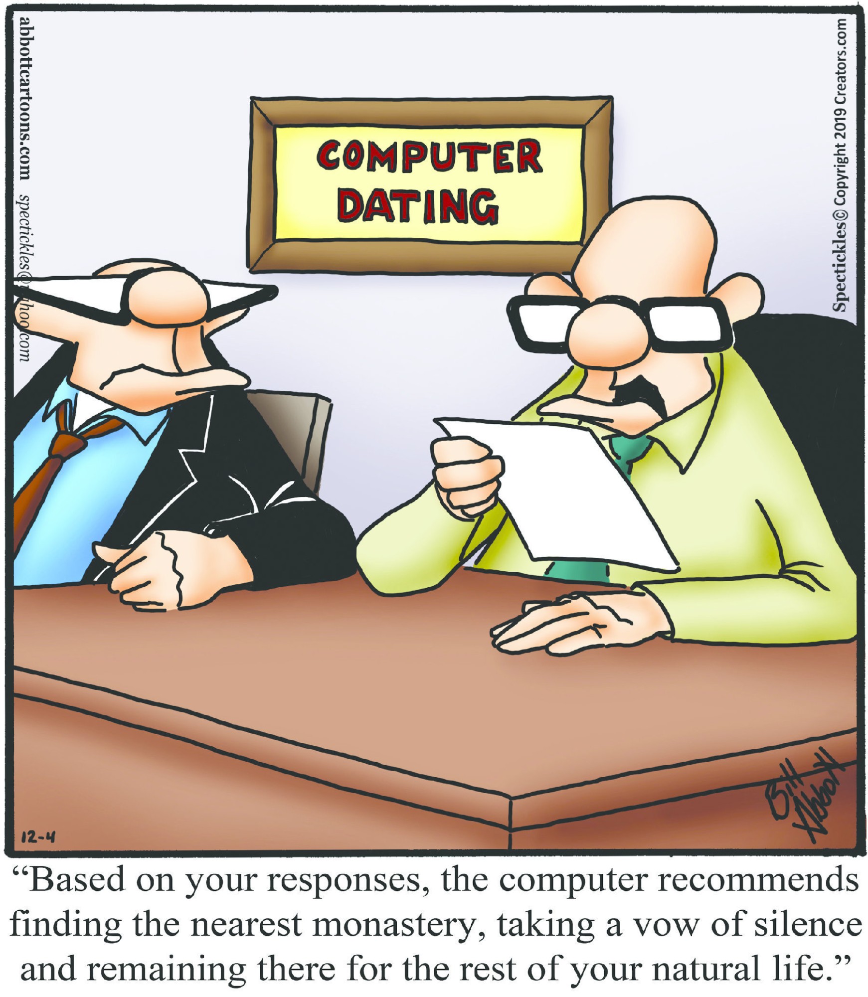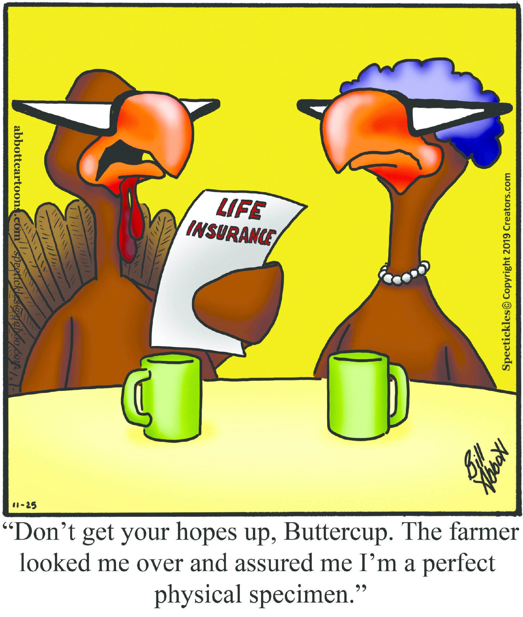 Spectickles, a cartoon primarily about a married couple with, to put it mildly, communication challenges, is an amalgamation of physical traits that author Bill Abbott finds humorous: the deadpan expression and gravity-tugged flesh of Walter Matthau, the powerful presence of Ethel Merman, the glasses of his great-grand-parents and a host of other subtleties. Creators Syndicate