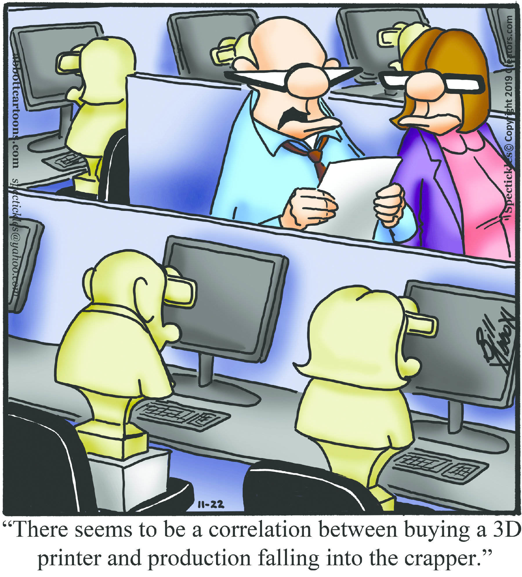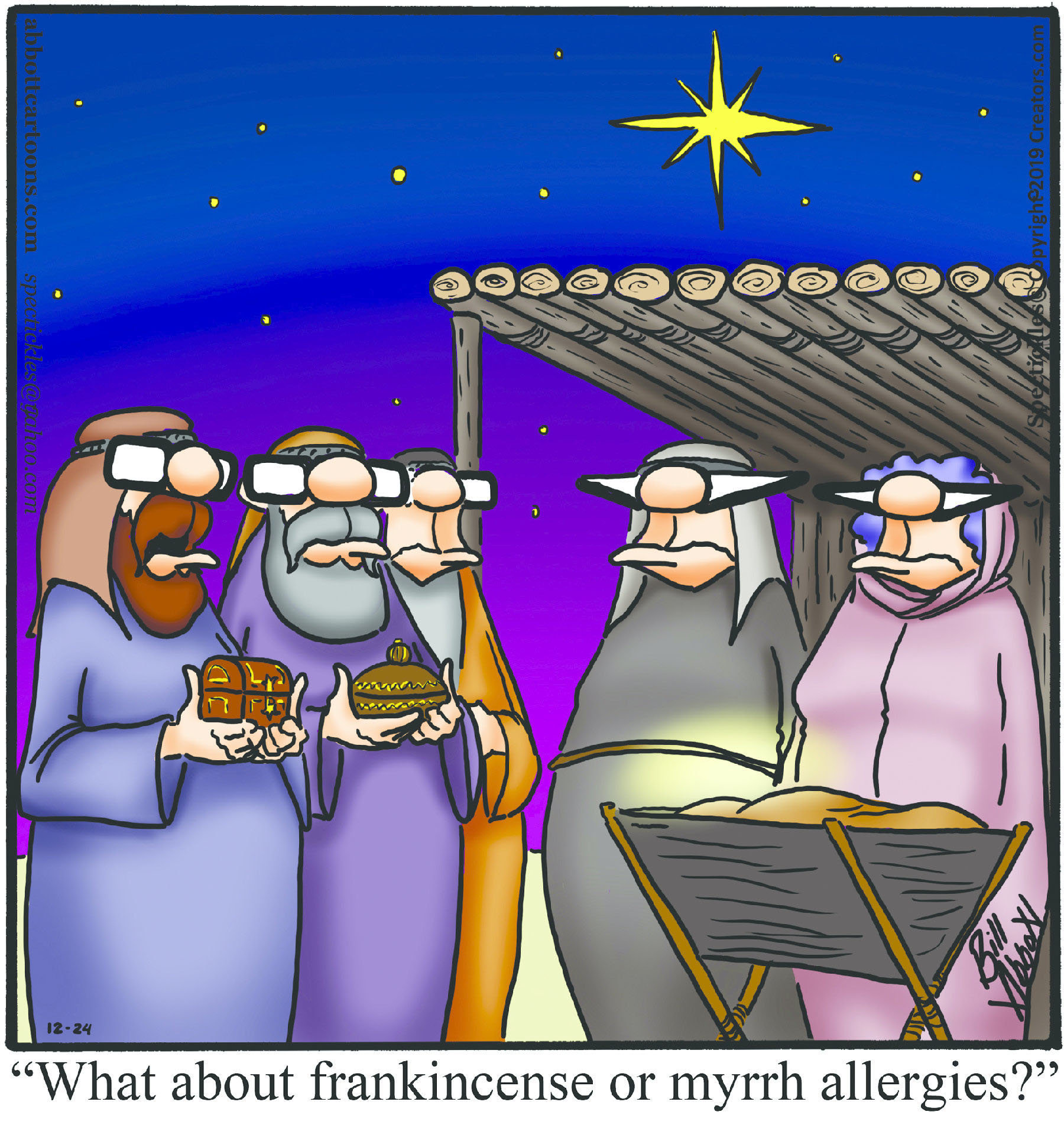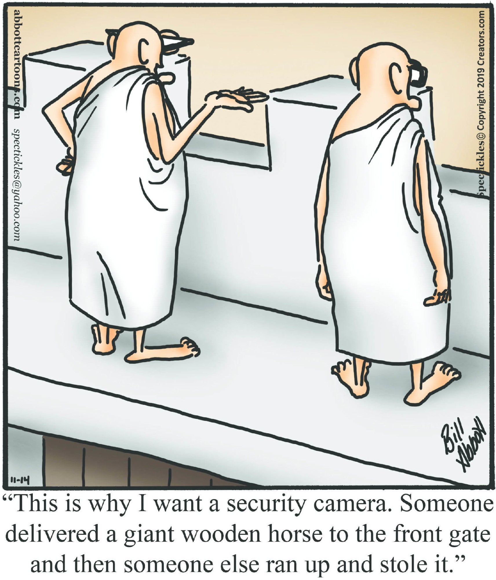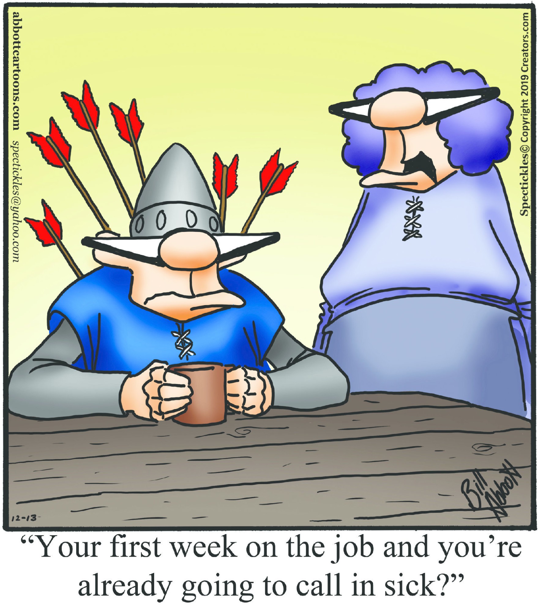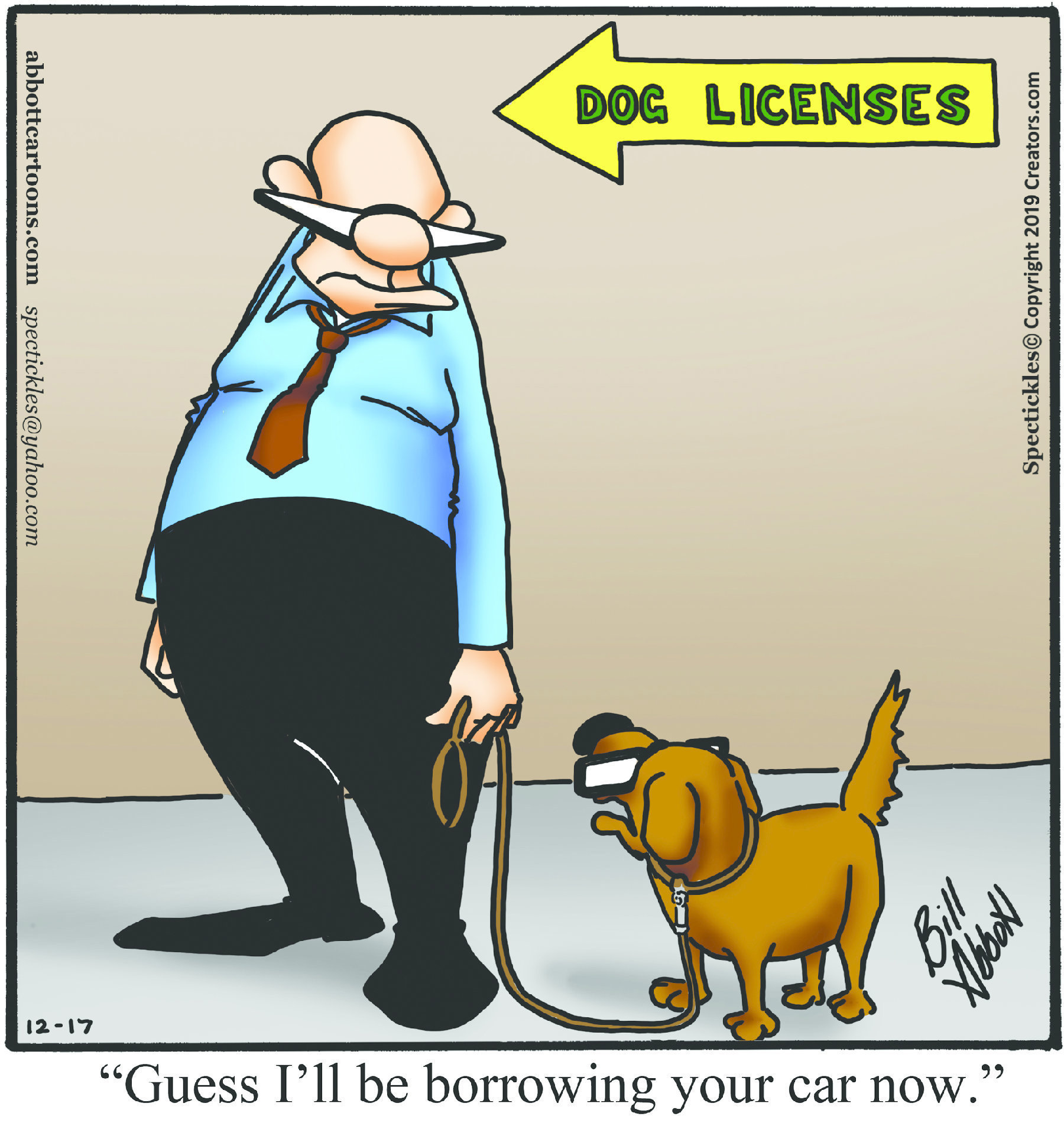 Spectickles, a cartoon primarily about a married couple with, to put it mildly, communication challenges, is an amalgamation of physical traits that author Bill Abbott finds humorous: the deadpan expression and gravity-tugged flesh of Walter Matthau, the powerful presence of Ethel Merman, the glasses of his great-grand-parents and a host of other subtleties. Creators Syndicate