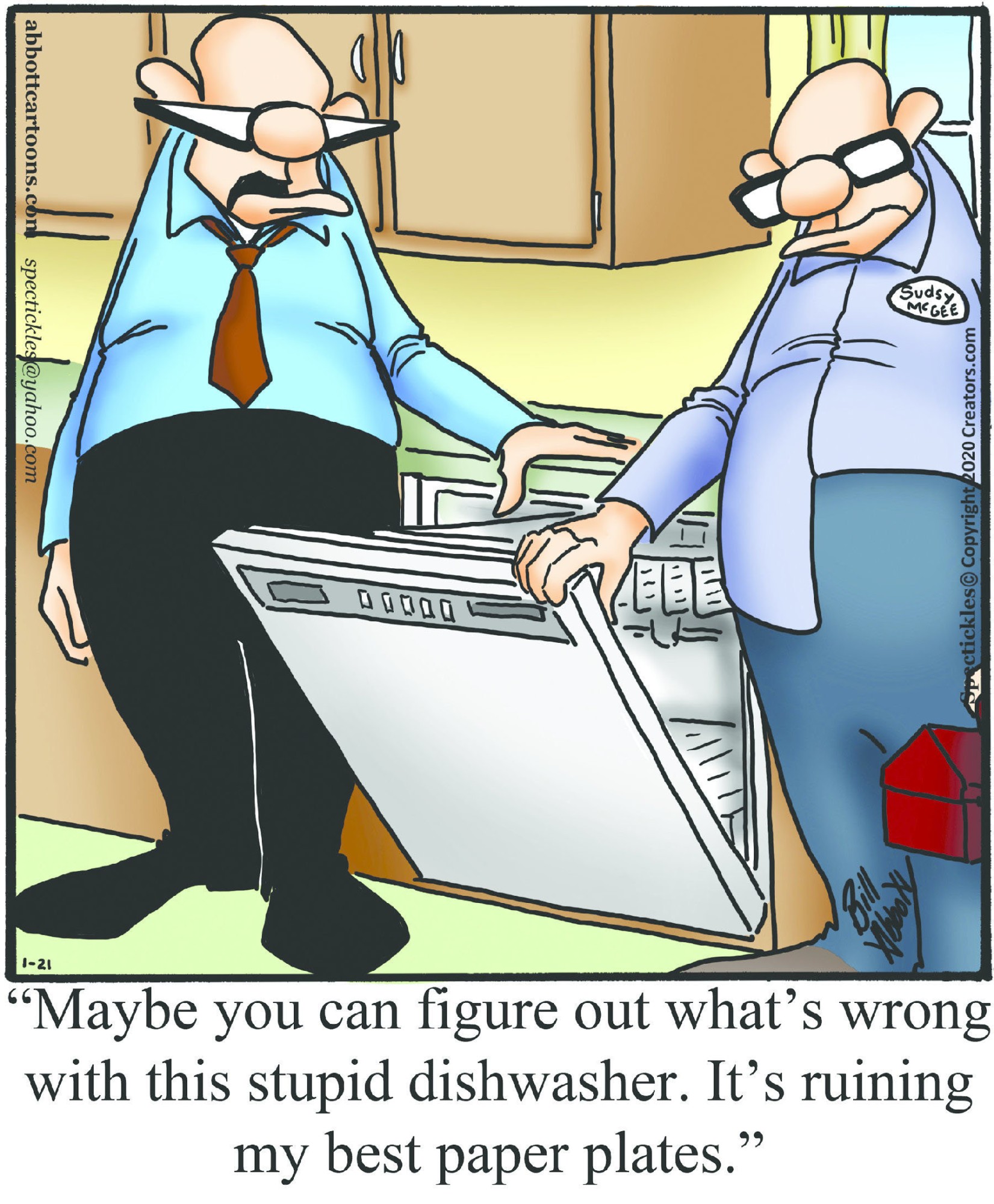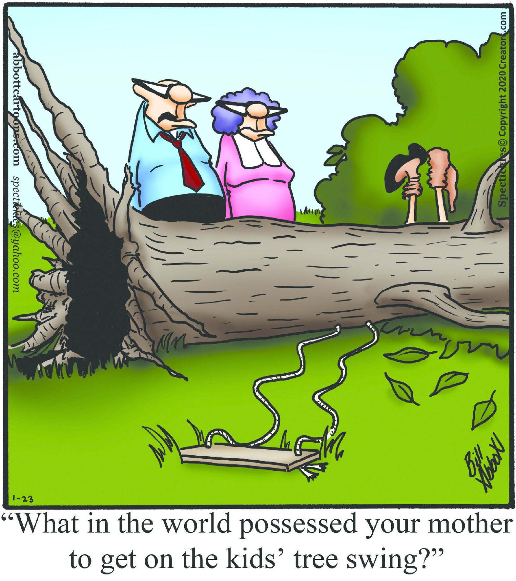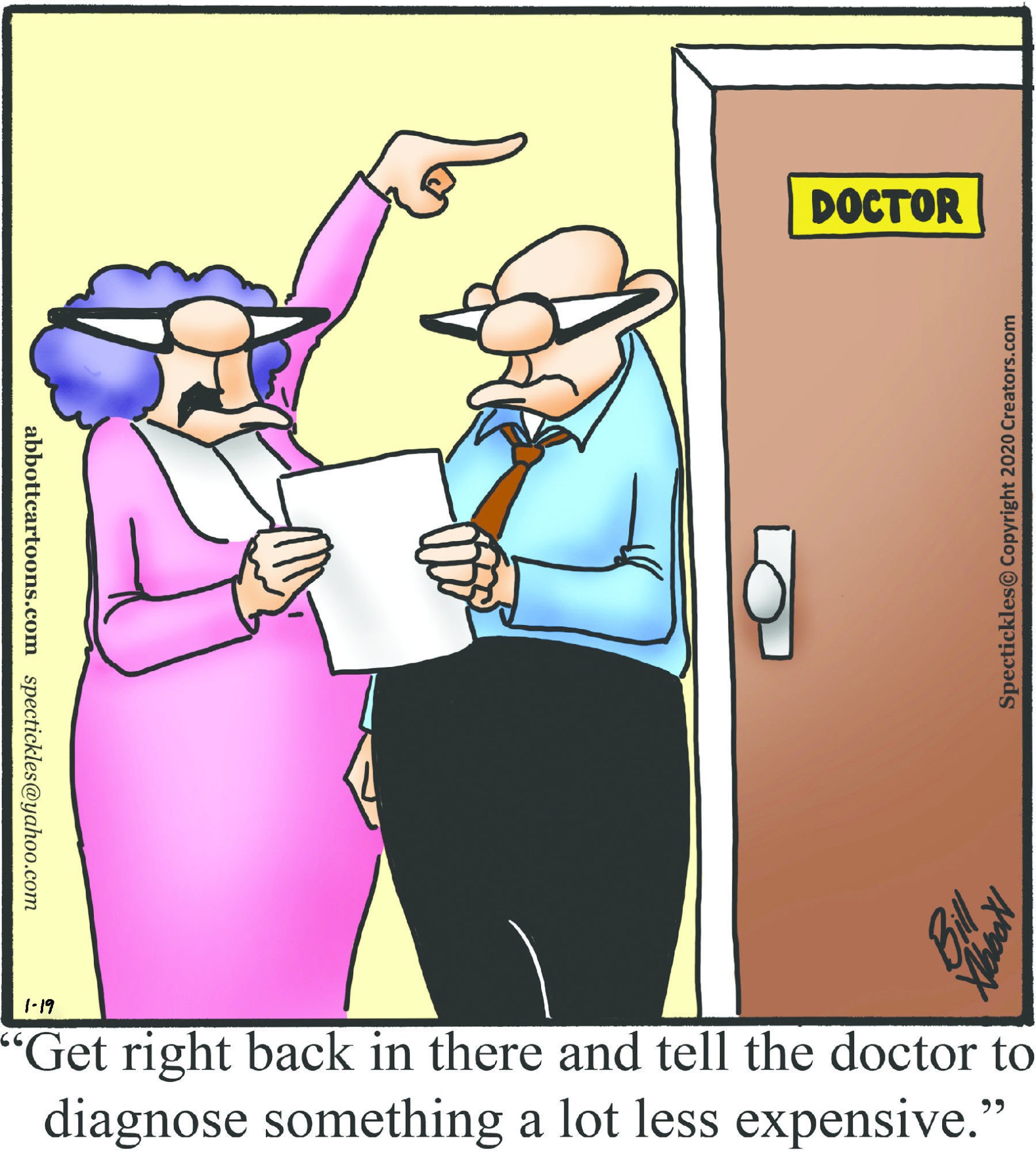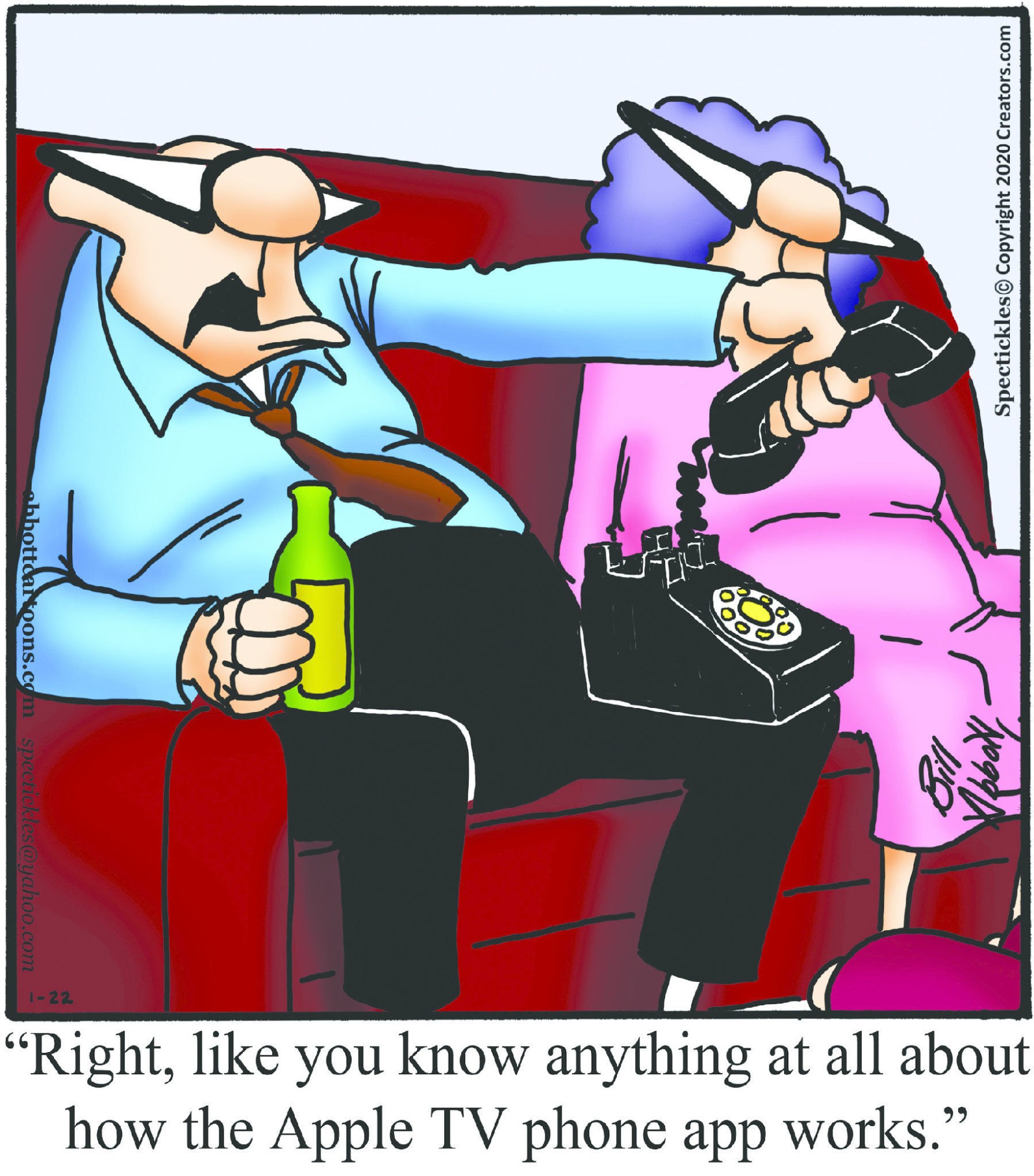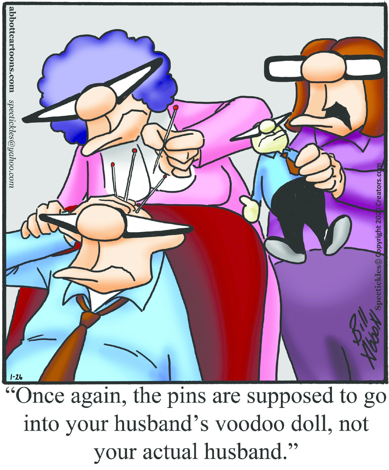 Spectickles, a cartoon primarily about a married couple with, to put it mildly, communication challenges, is an amalgamation of physical traits that author Bill Abbott finds humorous: the deadpan expression and gravity-tugged flesh of Walter Matthau, the powerful presence of Ethel Merman, the glasses of his great-grand-parents and a host of other subtleties. Creators Syndicate