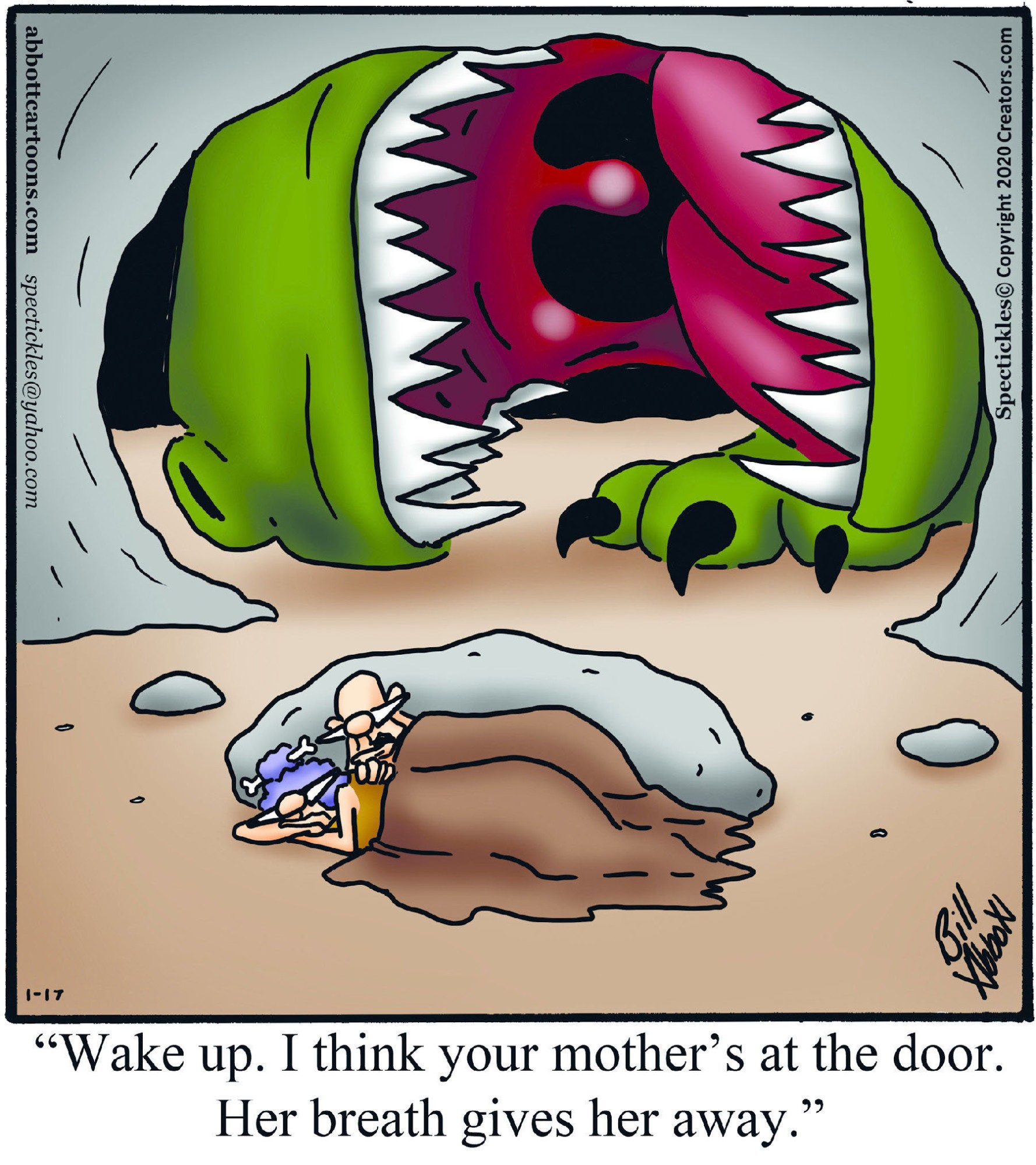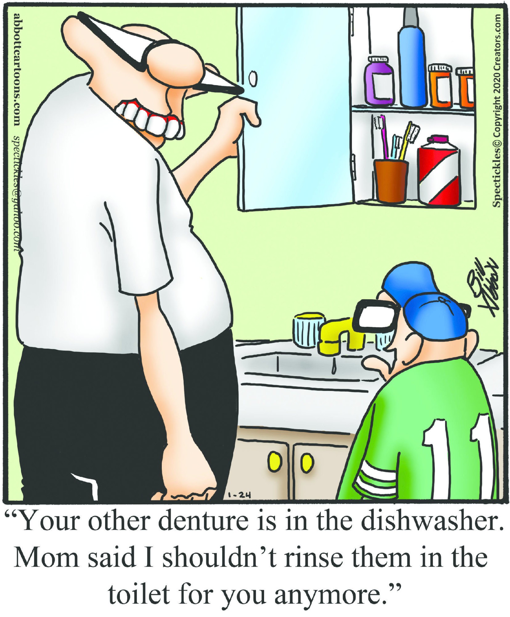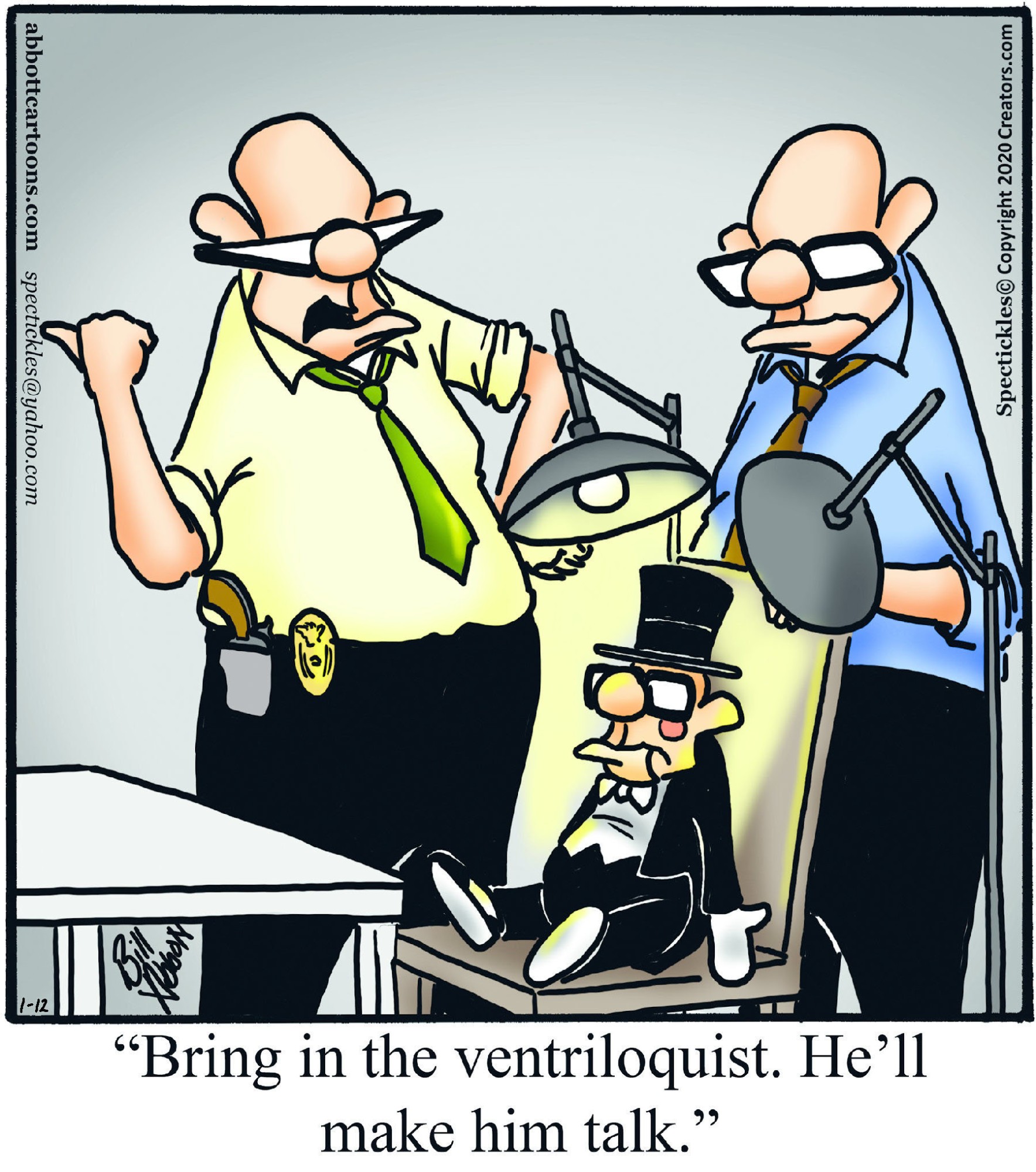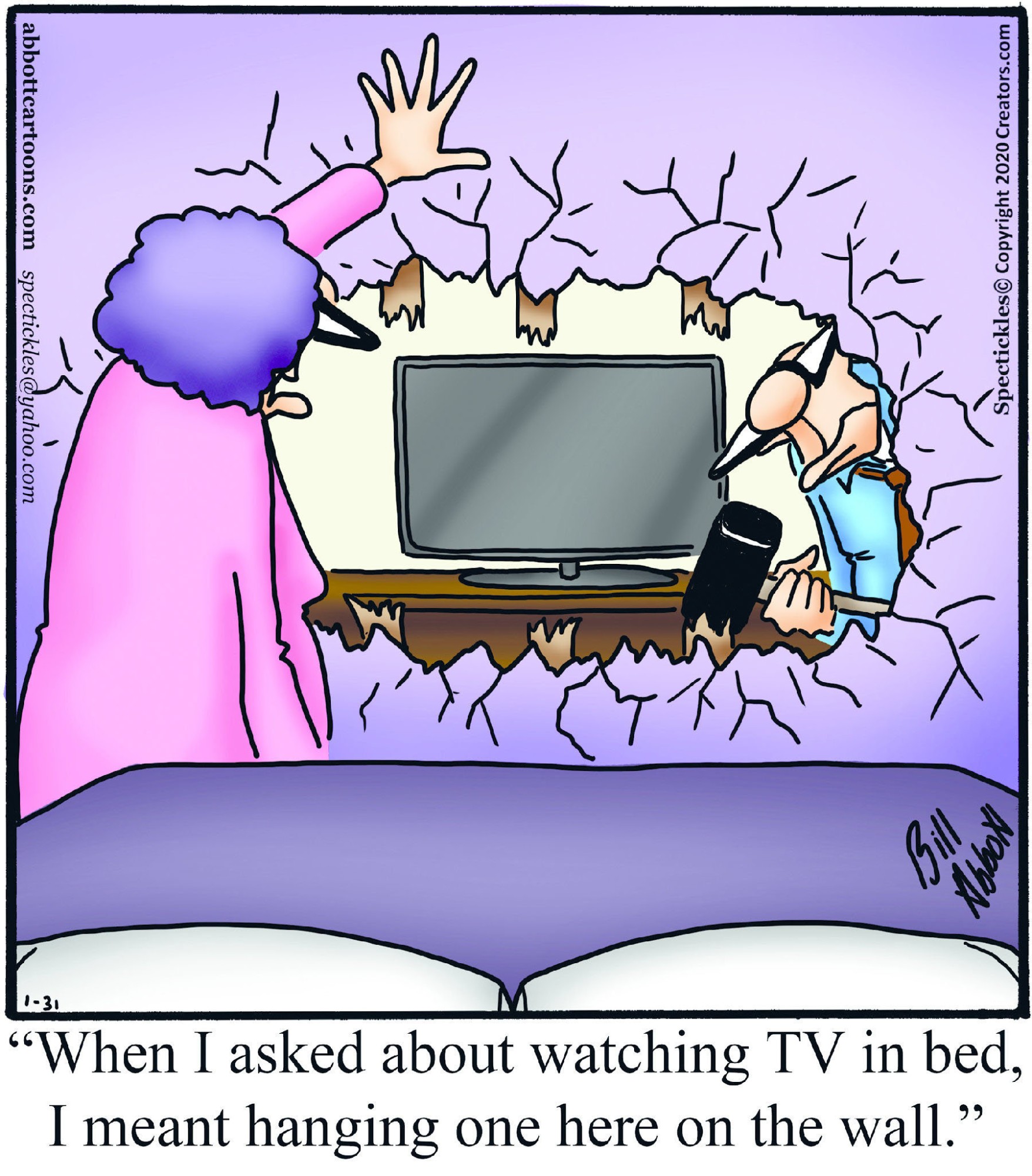 Spectickles, a cartoon primarily about a married couple with, to put it mildly, communication challenges, is an amalgamation of physical traits that author Bill Abbott finds humorous: the deadpan expression and gravity-tugged flesh of Walter Matthau, the powerful presence of Ethel Merman, the glasses of his great-grand-parents and a host of other subtleties. Creators Syndicate
