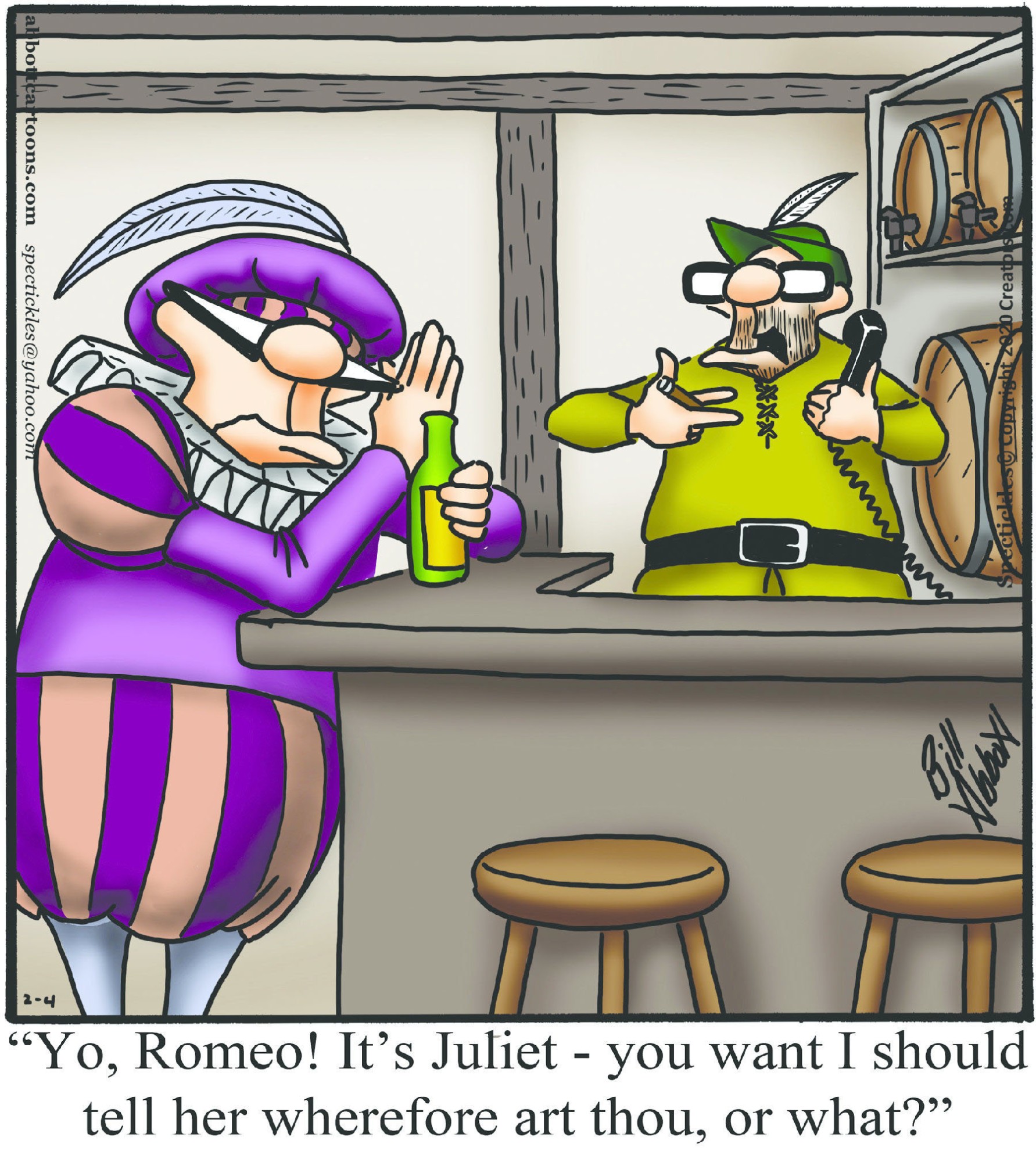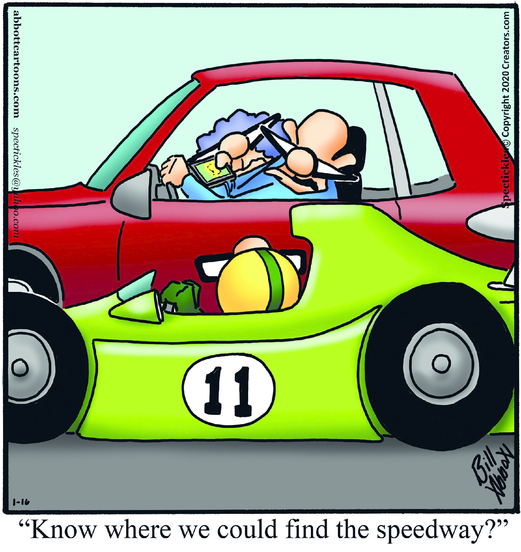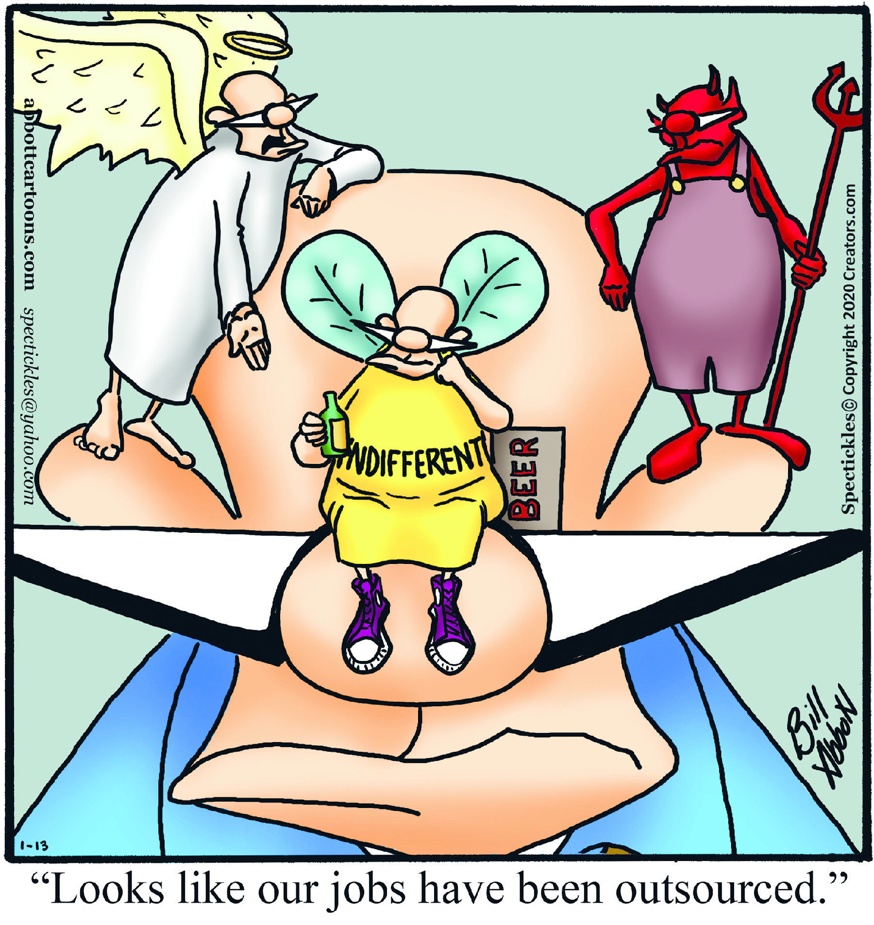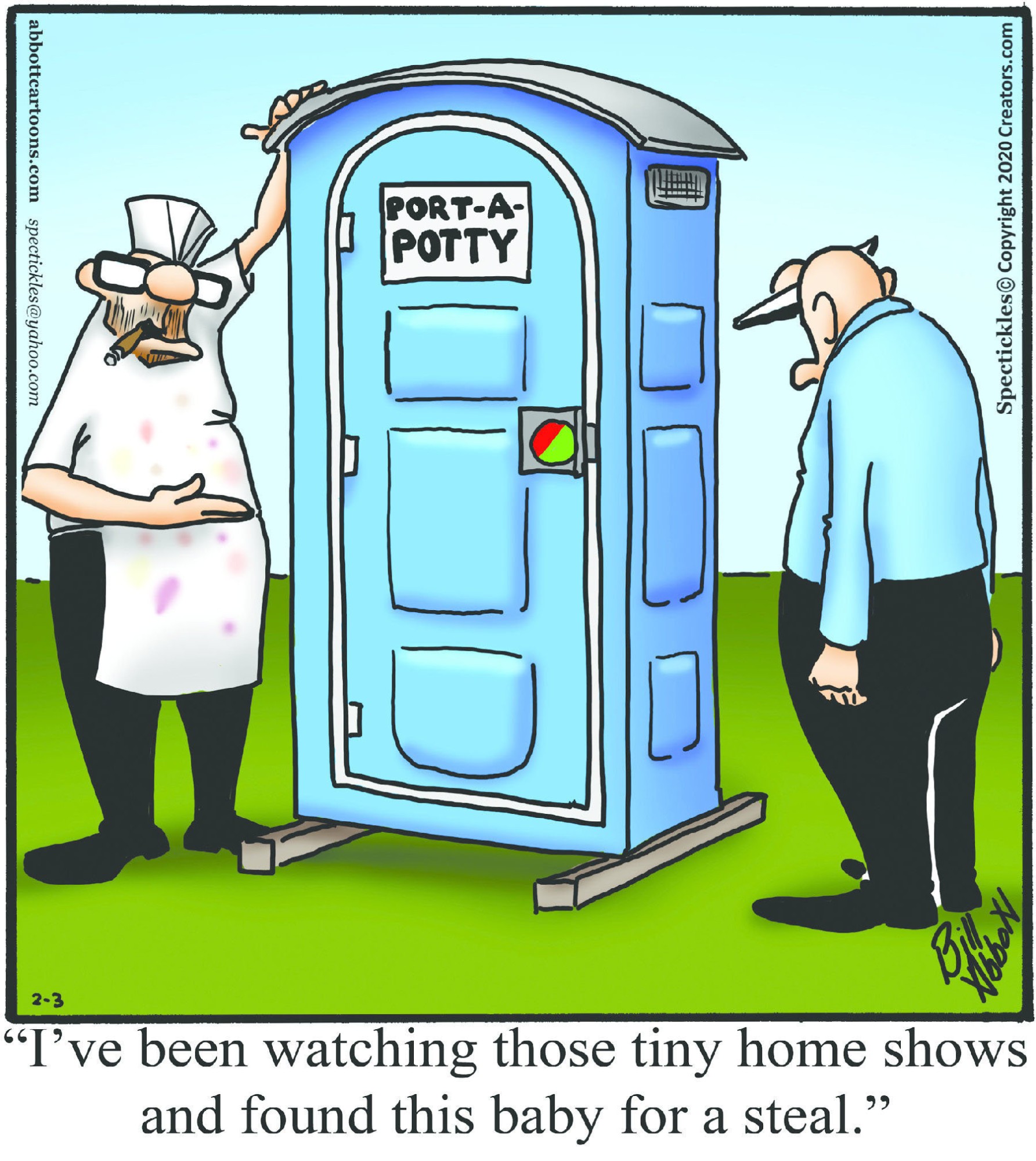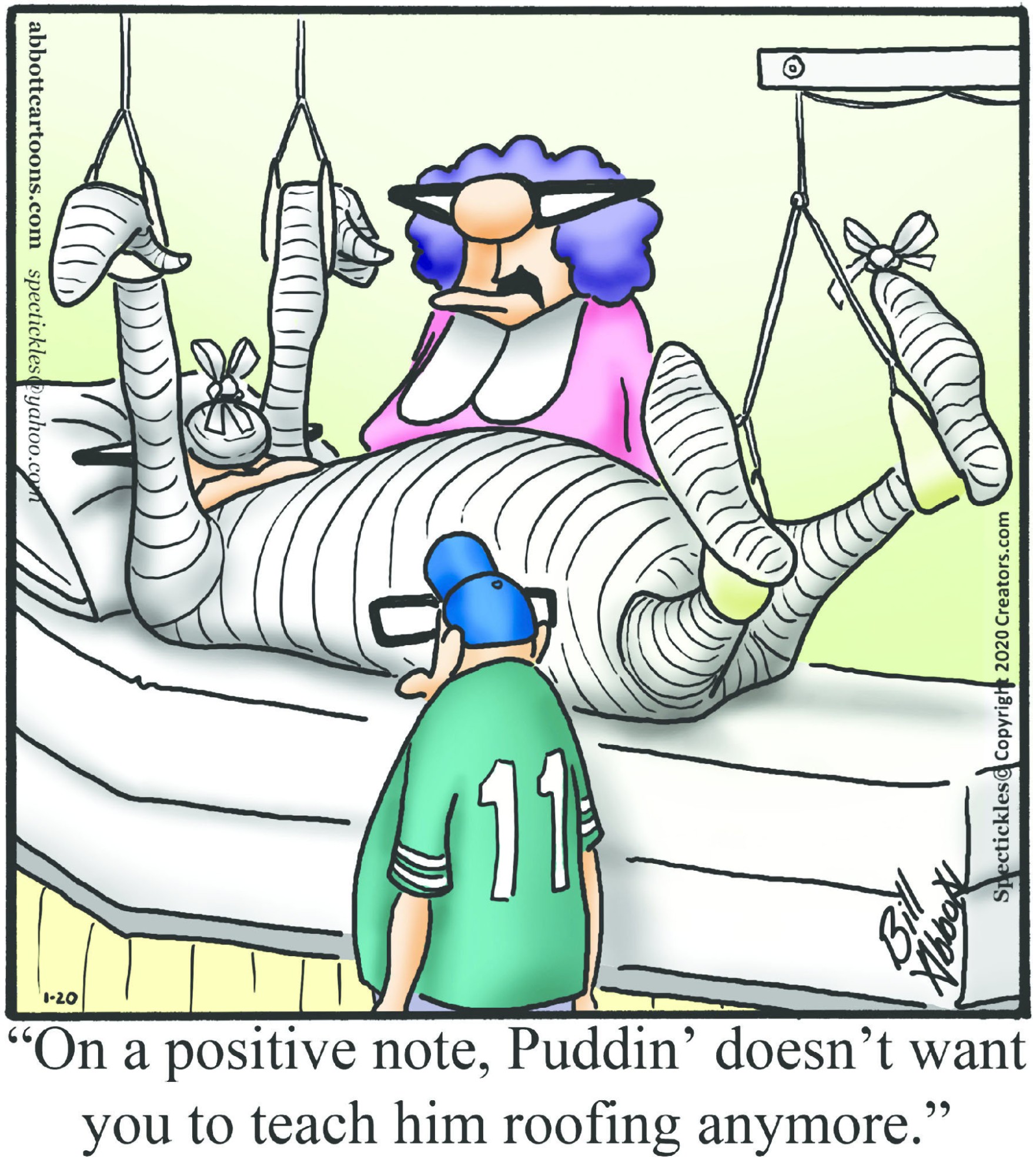 Spectickles, a cartoon primarily about a married couple with, to put it mildly, communication challenges, is an amalgamation of physical traits that author Bill Abbott finds humorous: the deadpan expression and gravity-tugged flesh of Walter Matthau, the powerful presence of Ethel Merman, the glasses of his great-grand-parents and a host of other subtleties. Creators Syndicate