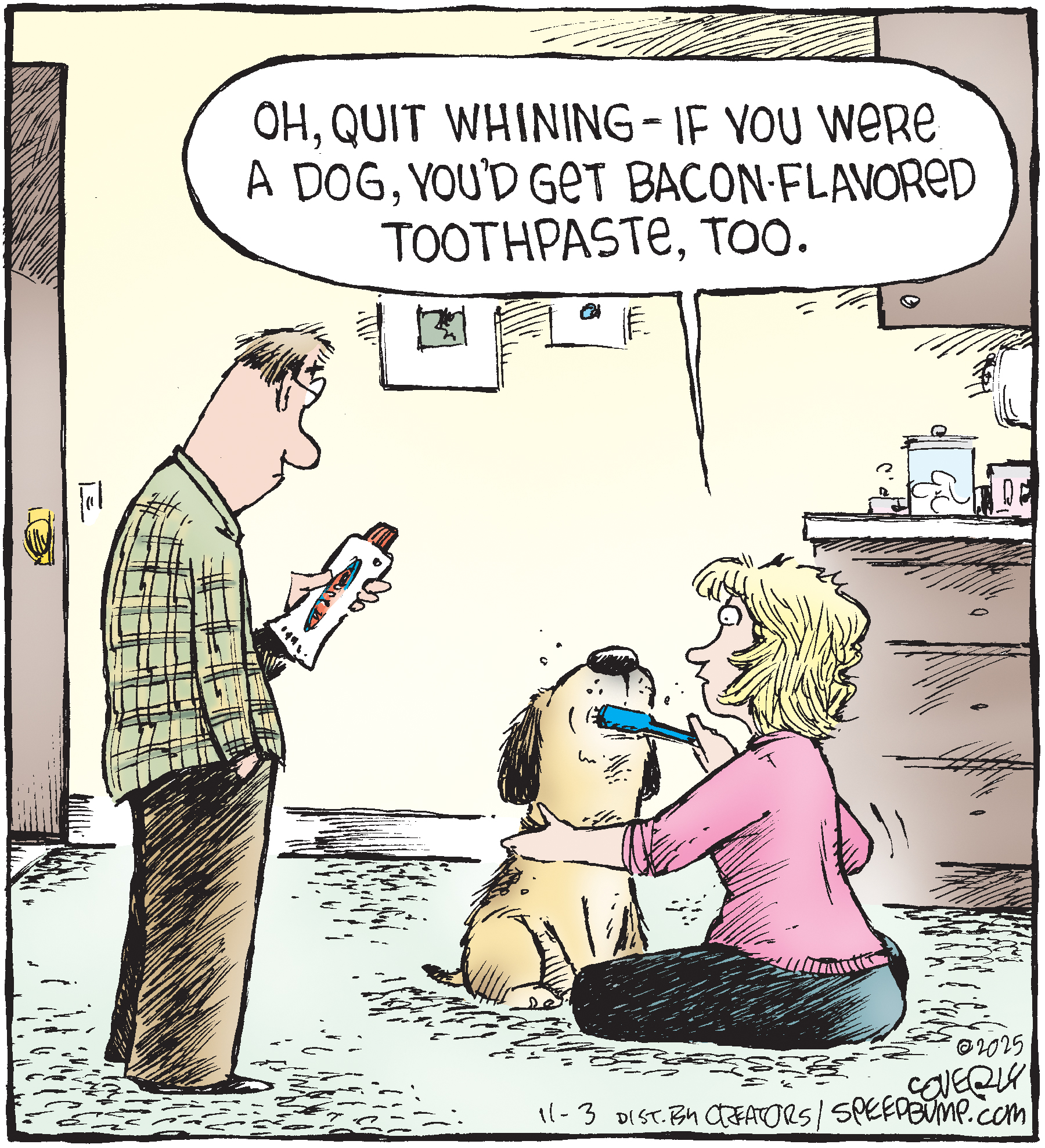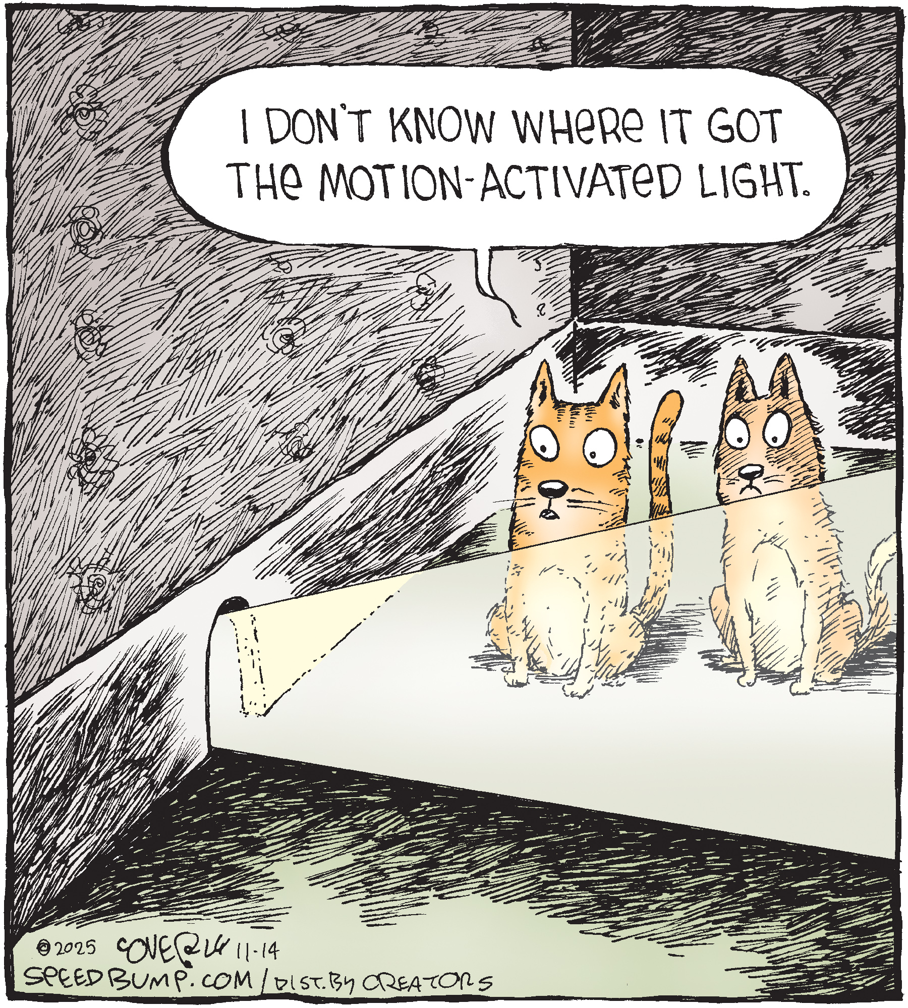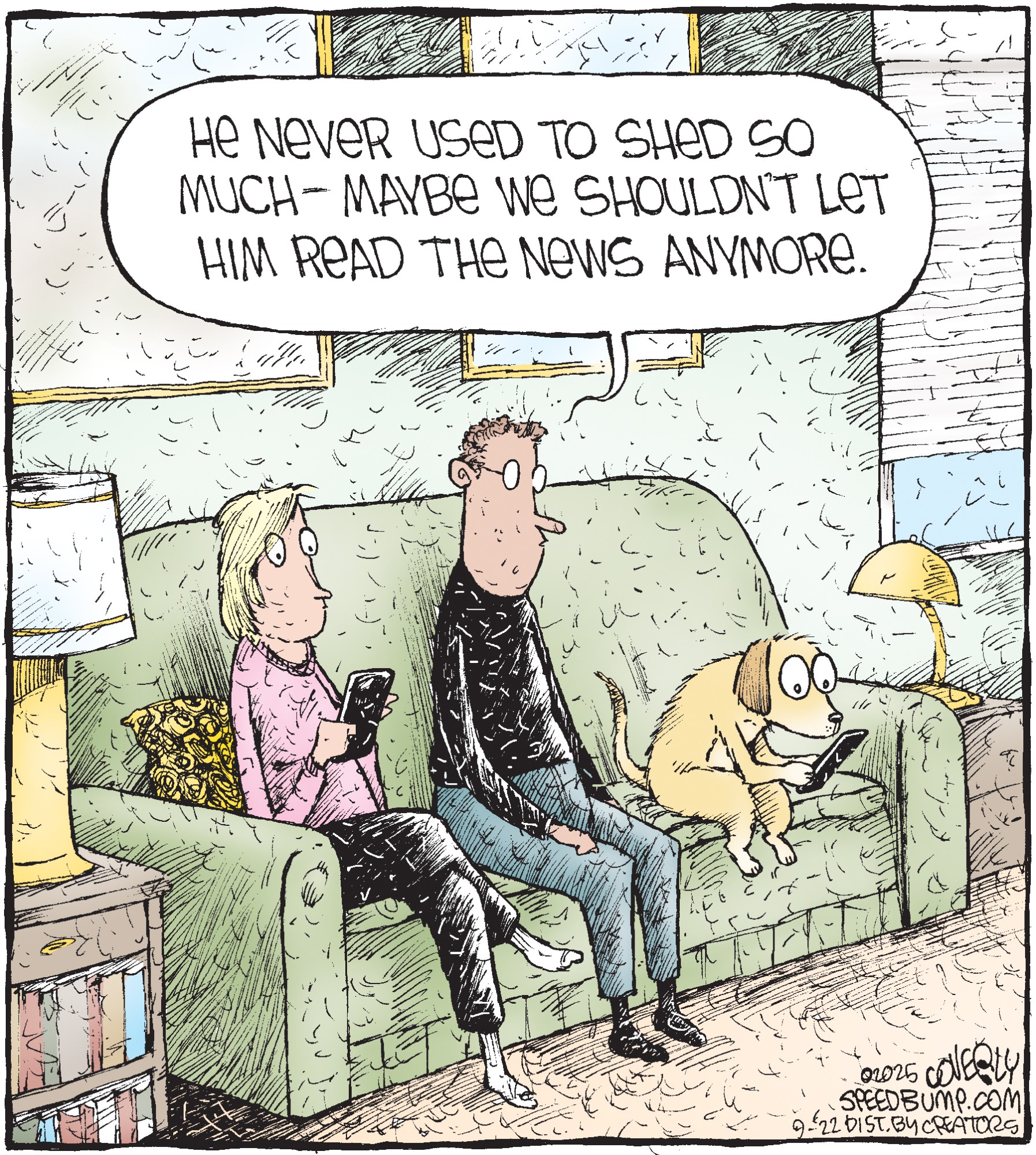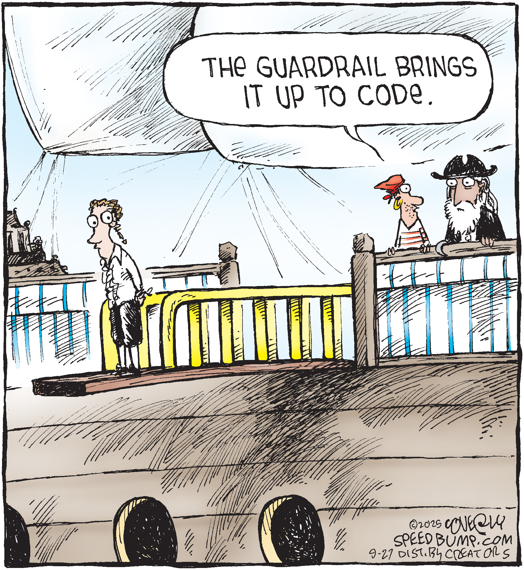 Dave Coverly admits there is no overriding theme, no tidy little philosophy that precisely describes what "Speed Bump" is about. "Basically," he says, "if life were a movie, these would be the outtakes." Creators Syndicate