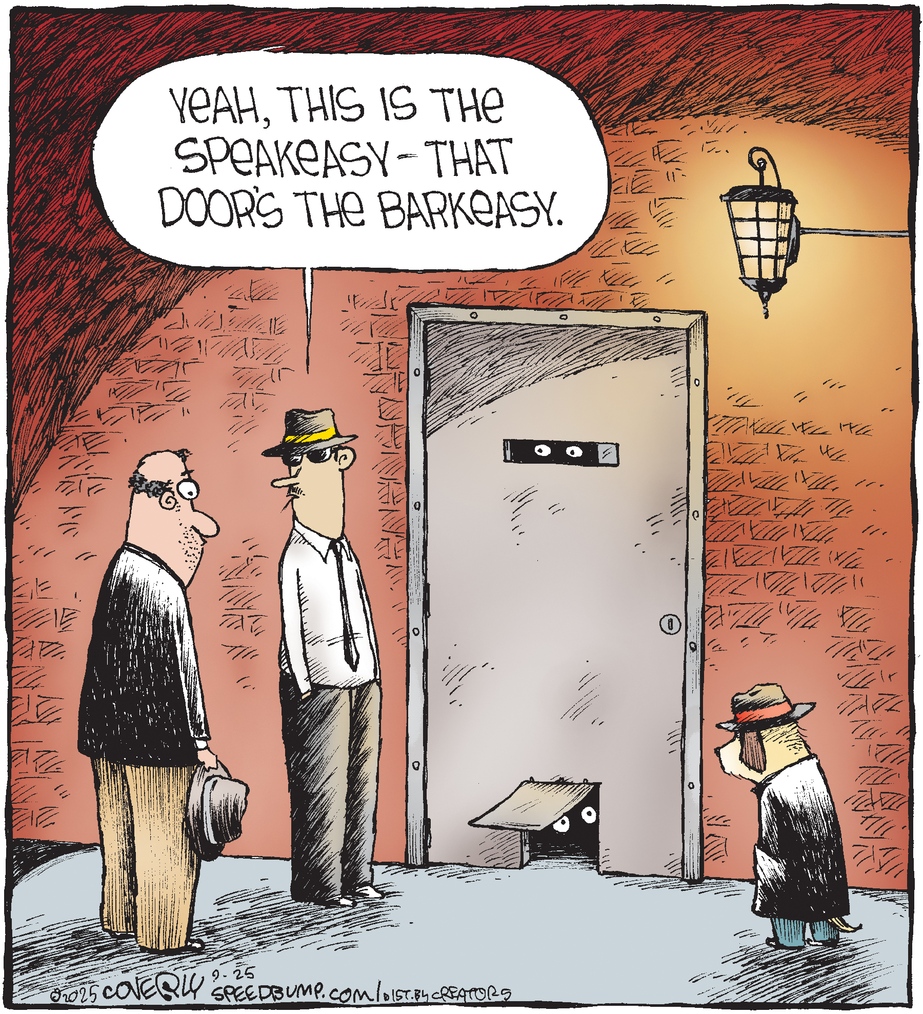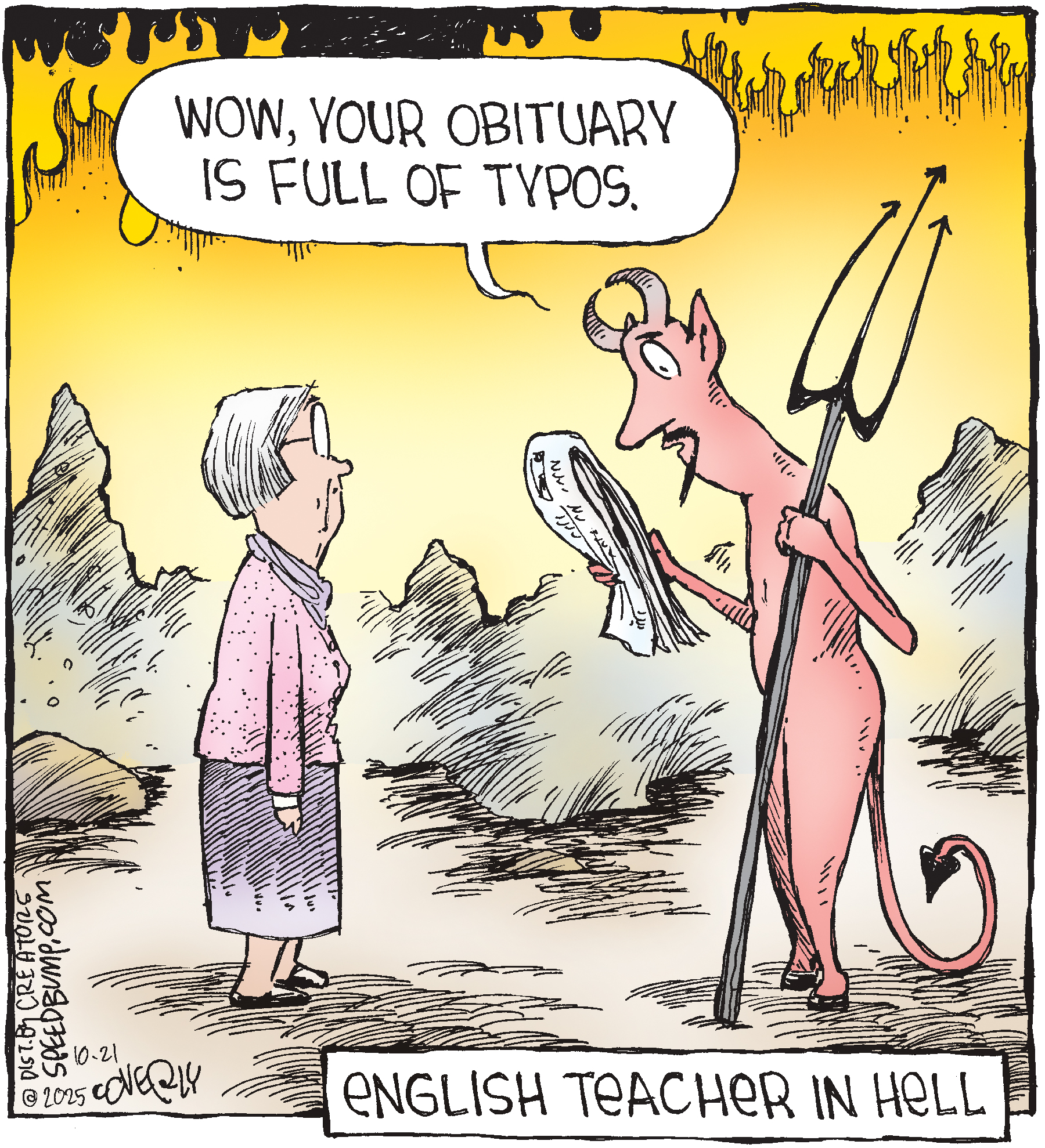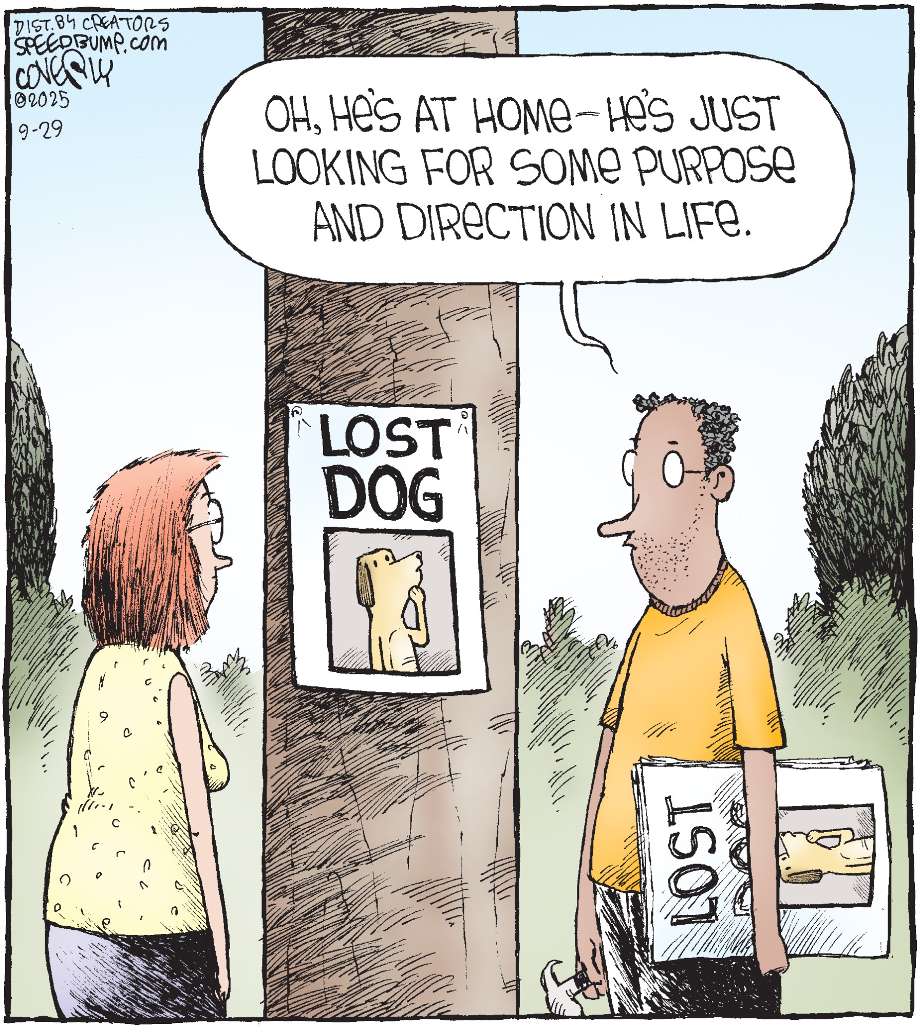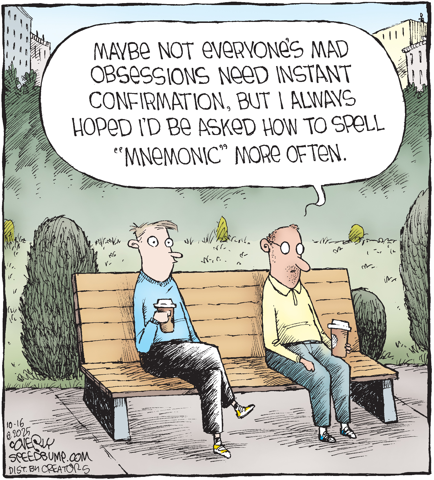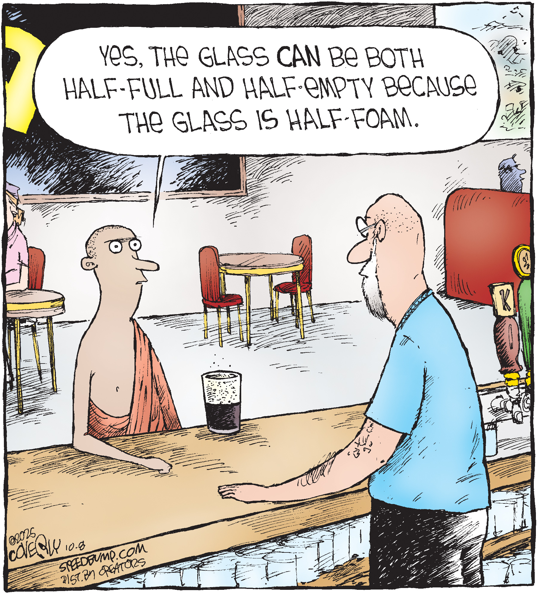 Dave Coverly admits there is no overriding theme, no tidy little philosophy that precisely describes what "Speed Bump" is about. "Basically," he says, "if life were a movie, these would be the outtakes." Creators Syndicate