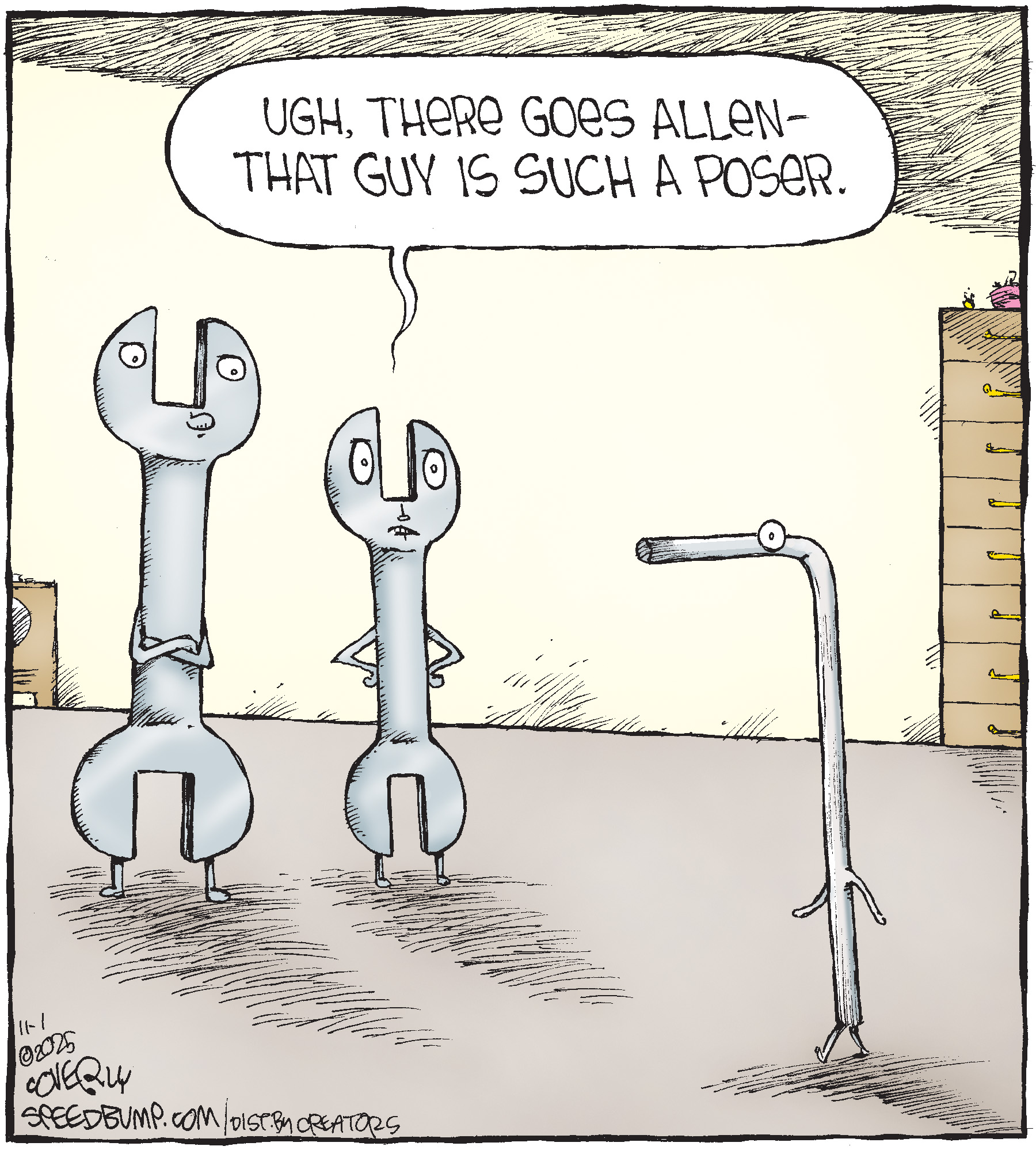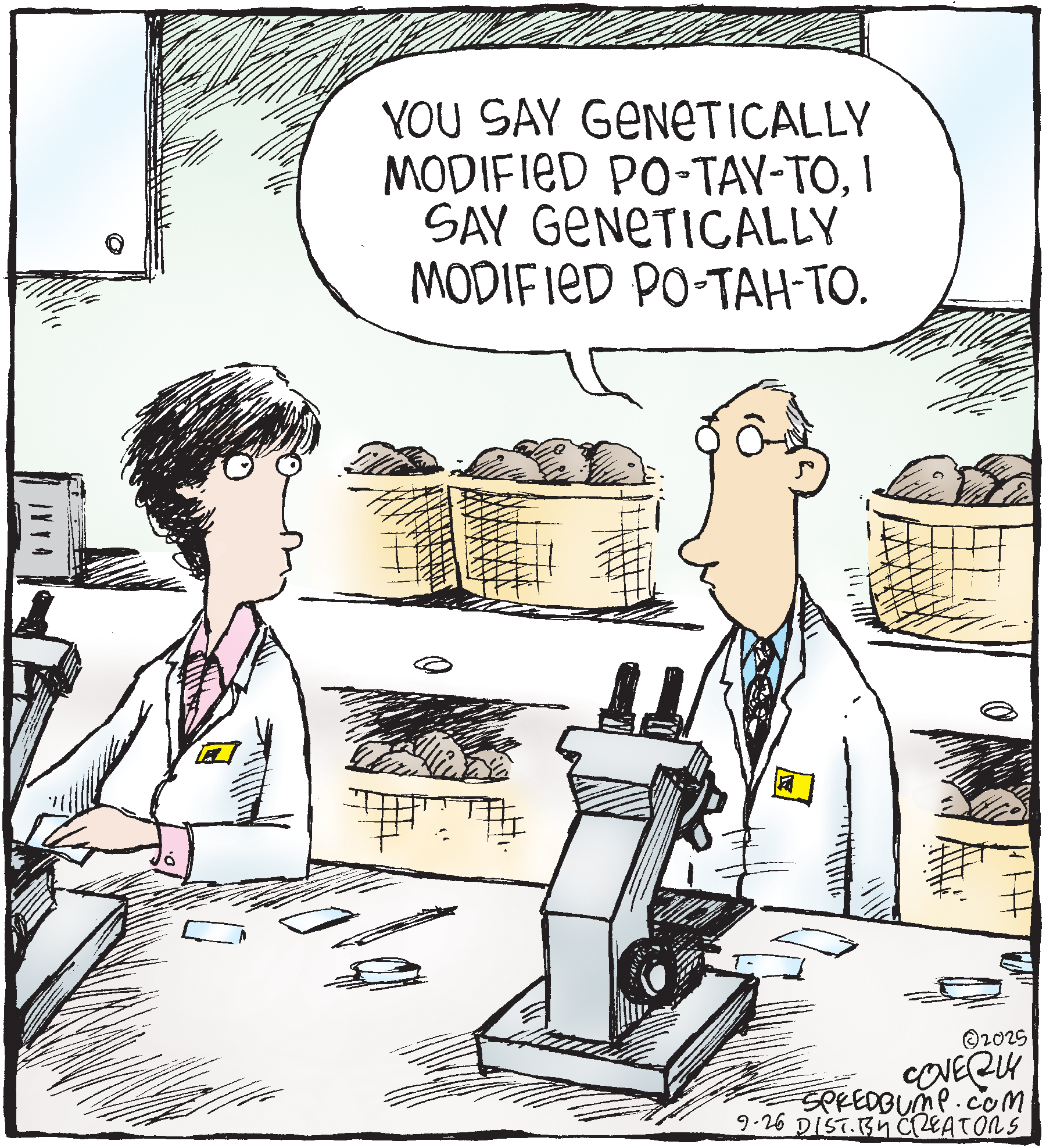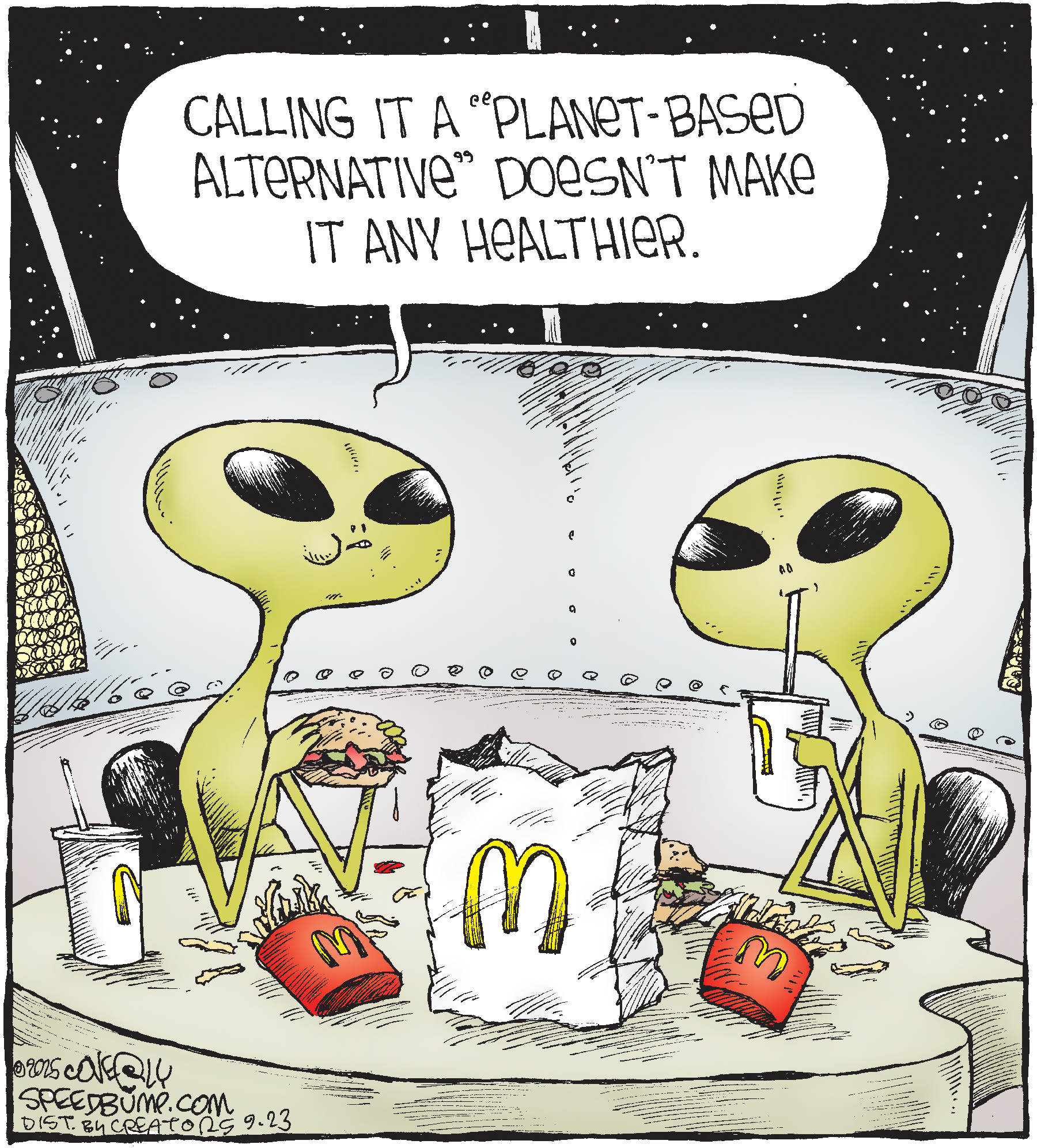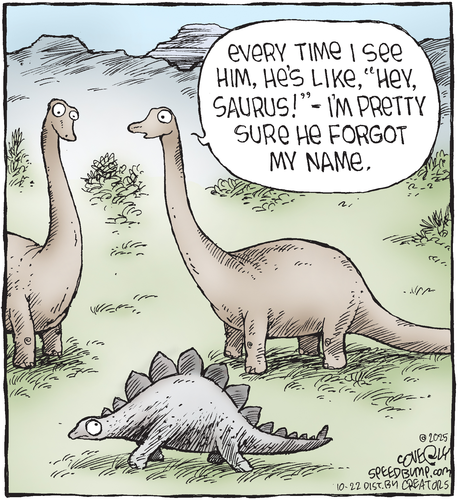 Dave Coverly admits there is no overriding theme, no tidy little philosophy that precisely describes what "Speed Bump" is about. "Basically," he says, "if life were a movie, these would be the outtakes." Creators Syndicate