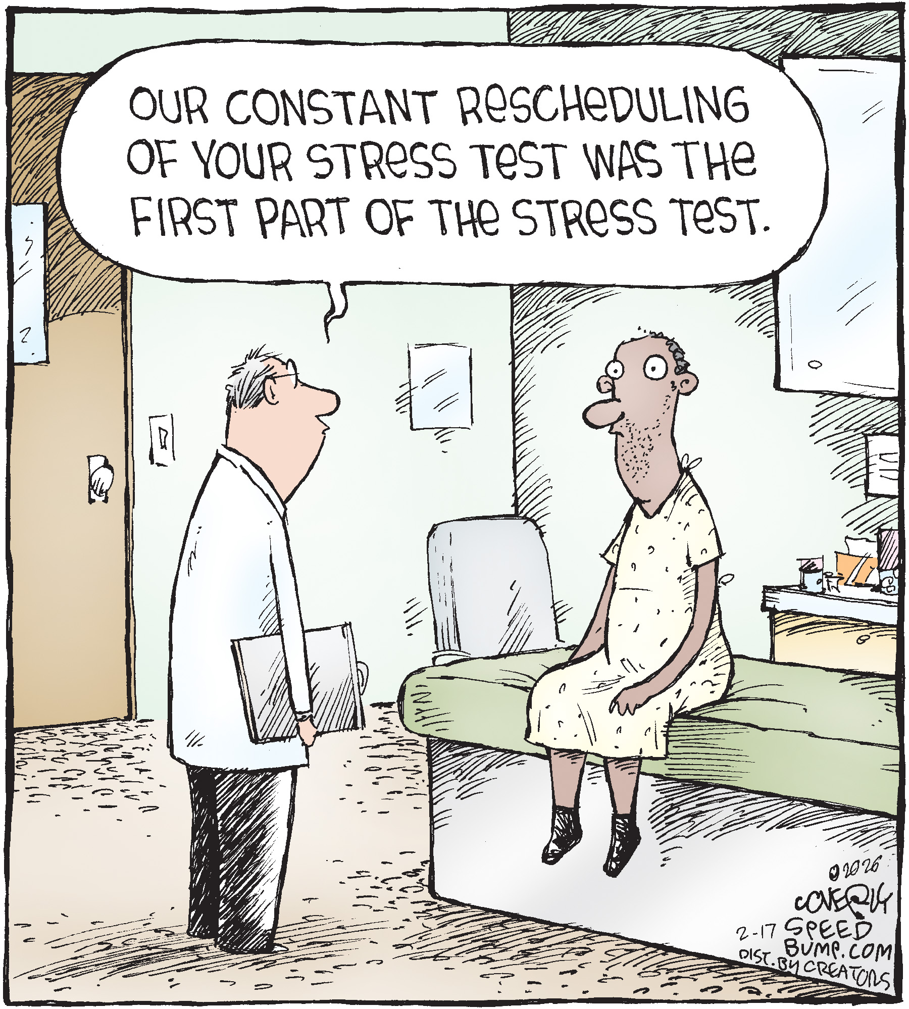 Dave Coverly admits there is no overriding theme, no tidy little philosophy that precisely describes what "Speed Bump" is about. "Basically," he says, "if life were a movie, these would be the outtakes." Creators Syndicate