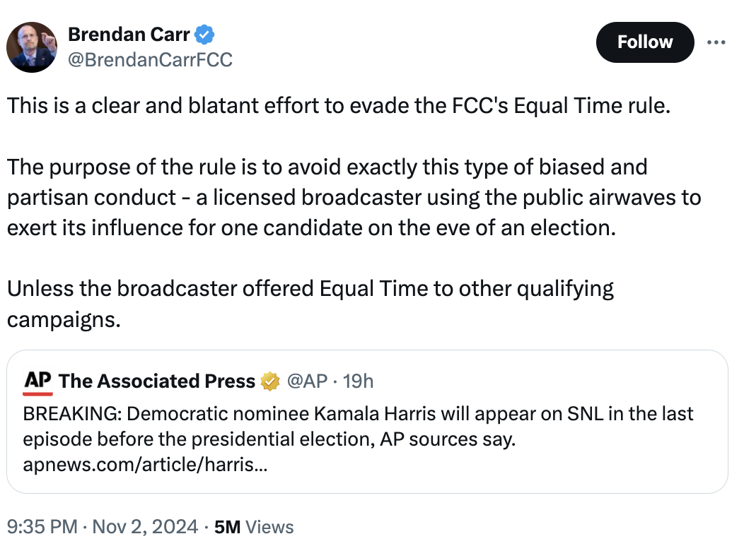 Carr expressed his concerns on social media platform X, stating: "This is a clear and blatant effort to evade the FCC's Equal Time rule. The purpose of the rule is to avoid exactly this type of biased and partisan conduct — a licensed broadcaster using the public airwaves to exert its influence for one candidate on the eve of an election." @BrendanCarrFCC / X