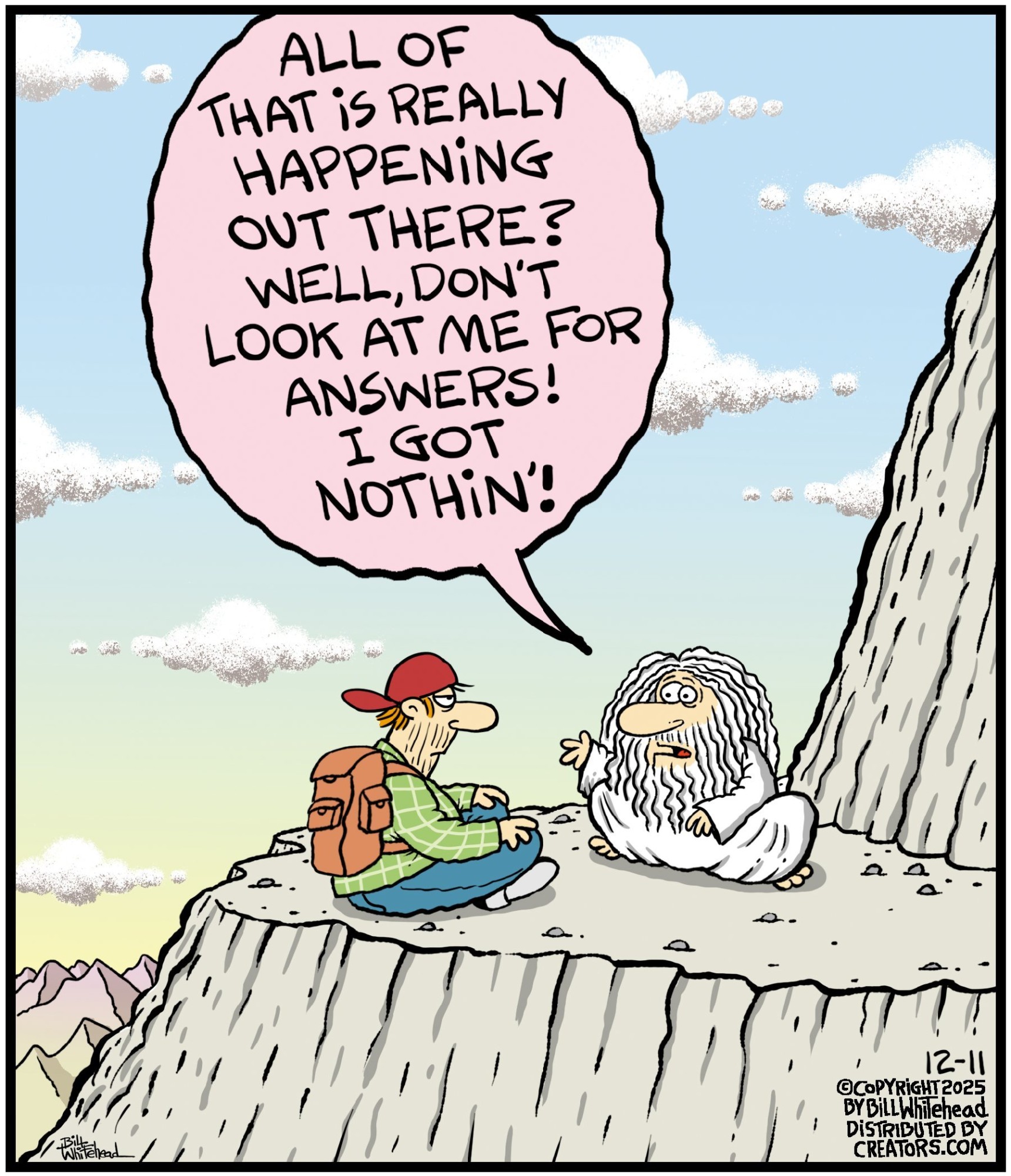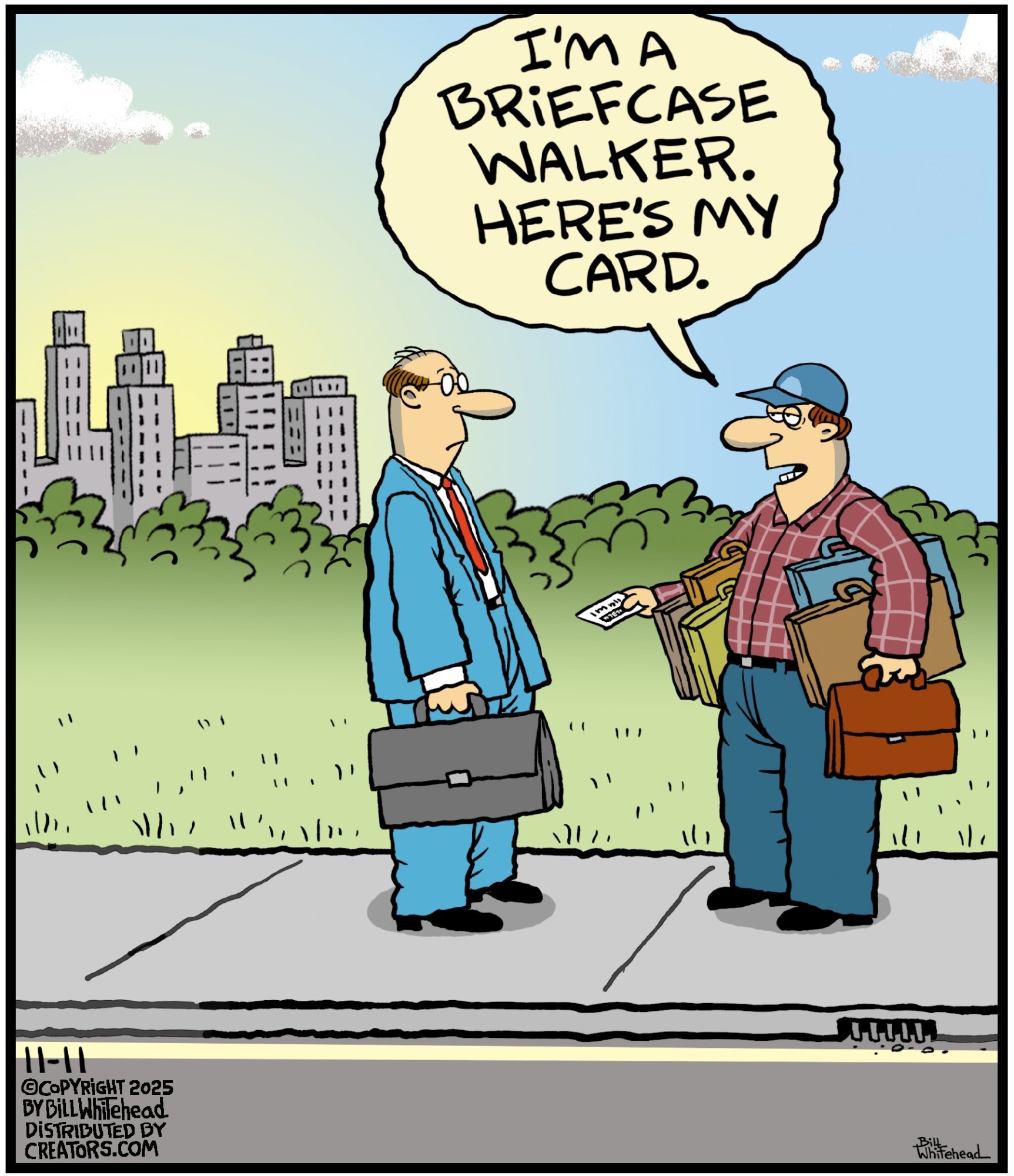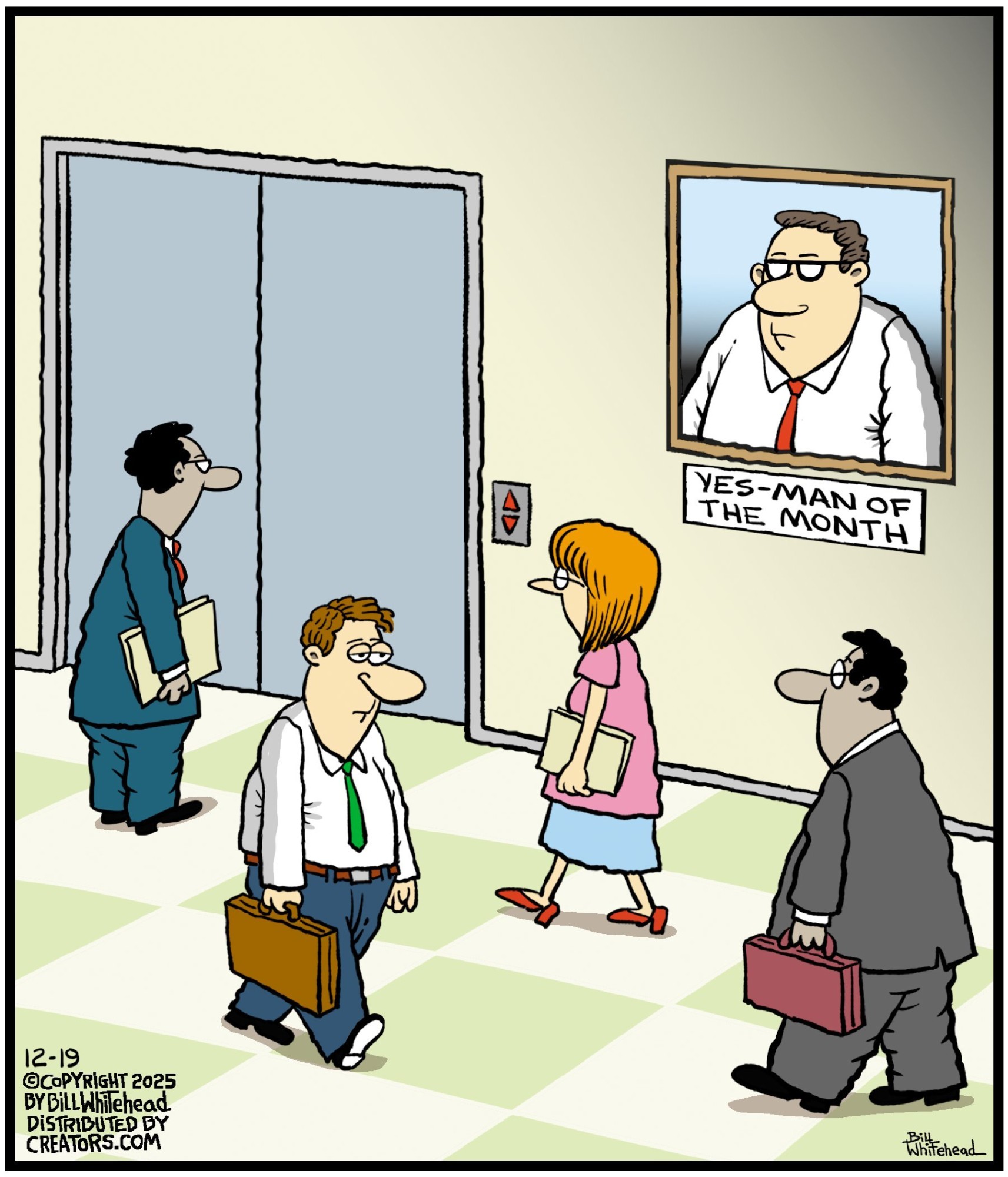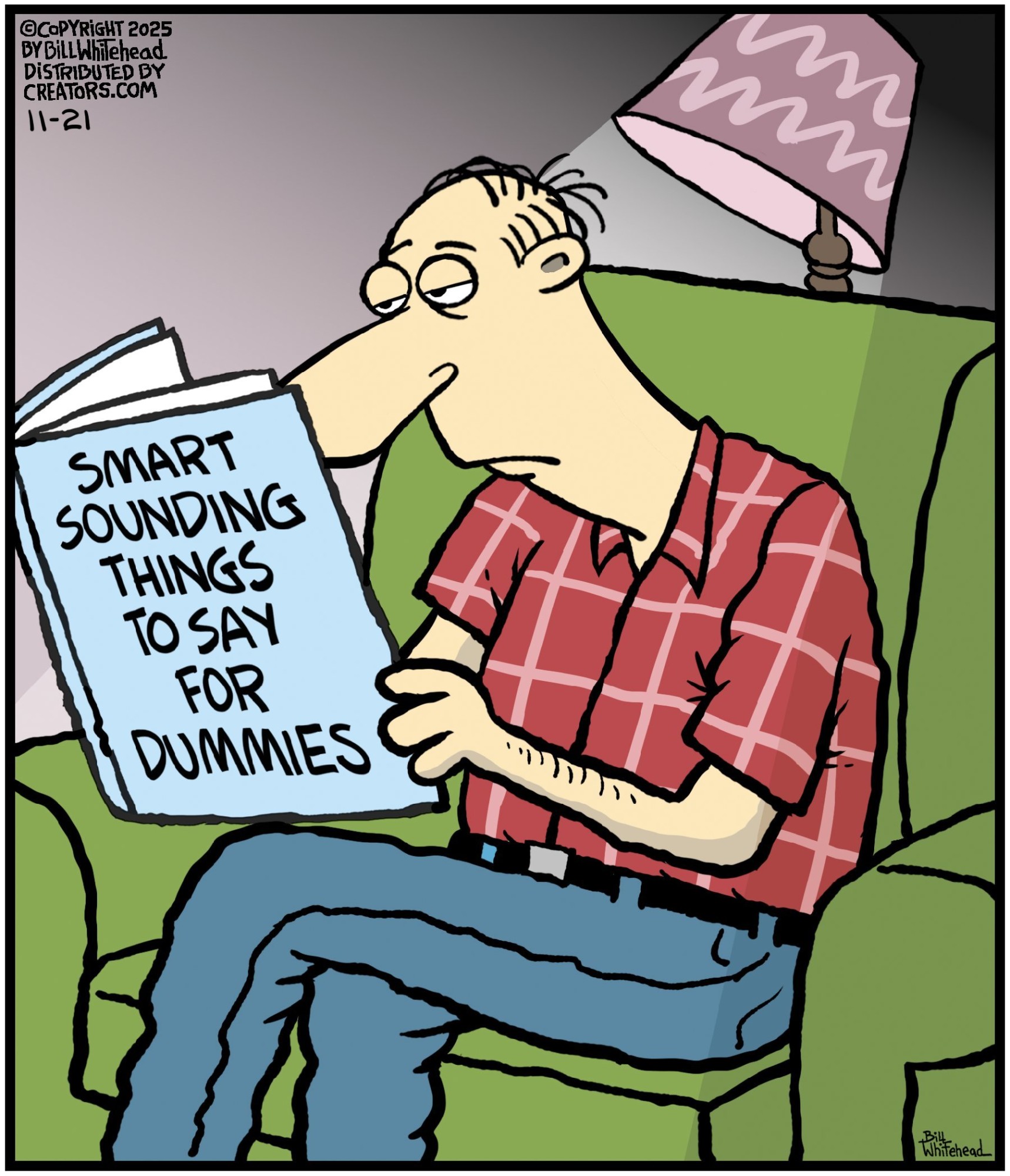 Bill’s career in cartooning started in the fifth grade, when he would copy drawings from comic strips, the New Yorker magazine and editorial cartoons. After a while he developed his own style, focusing primarily on the drawing. He soon realized his characters would need something to do and say, so he gave them their own odd little world to live in. Soon everyone around him became fair game. By college, Bill was cartooning for the school paper. Later, he created posters for book and record stores and freelanced for the Saturday Evening Post, Advertising Age, the Boston Phoenix, Wall Street Journal and King Features. In the '80s, he syndicated Sidelines, a sports panel cartoon. Creators Syndicate
