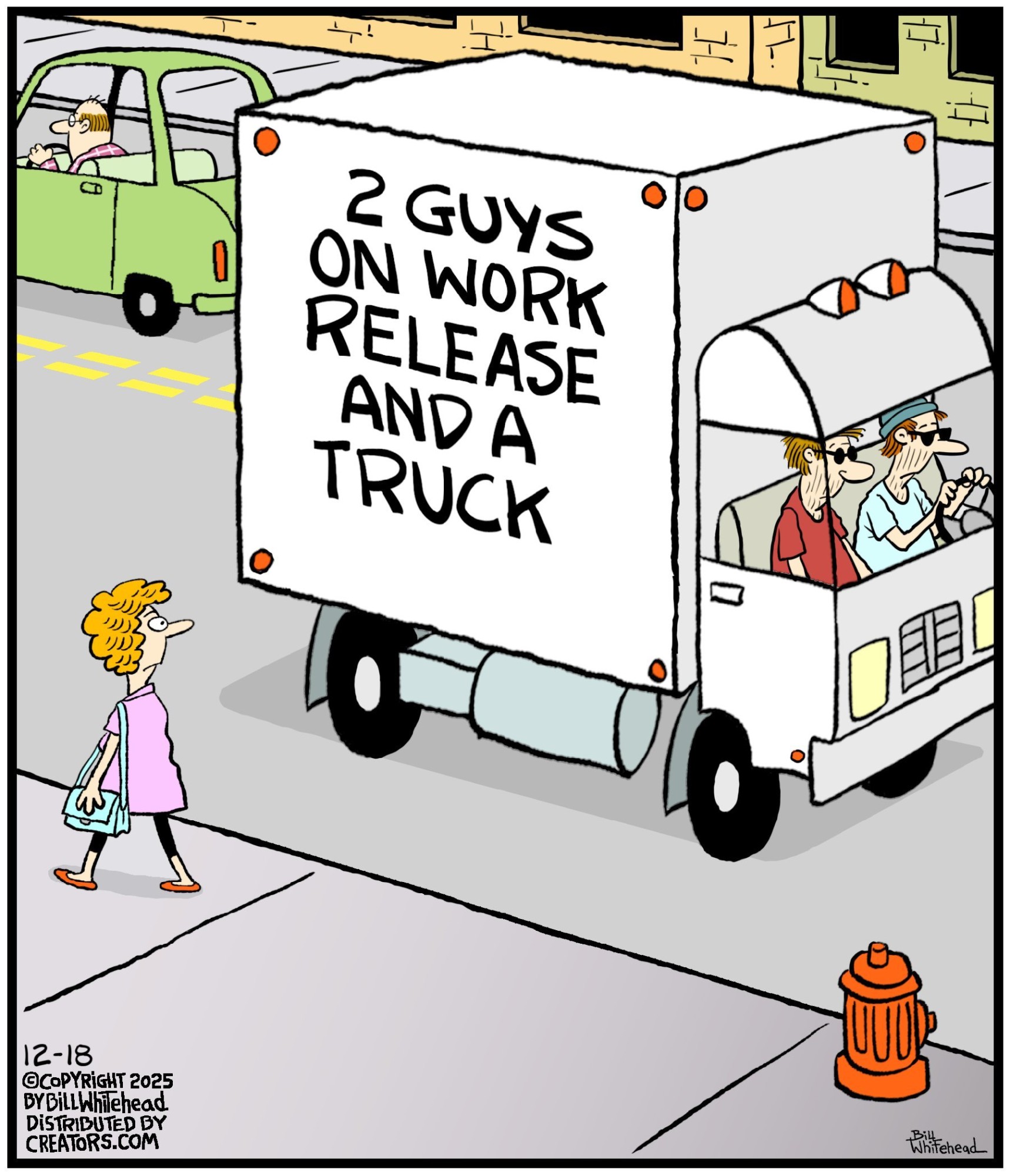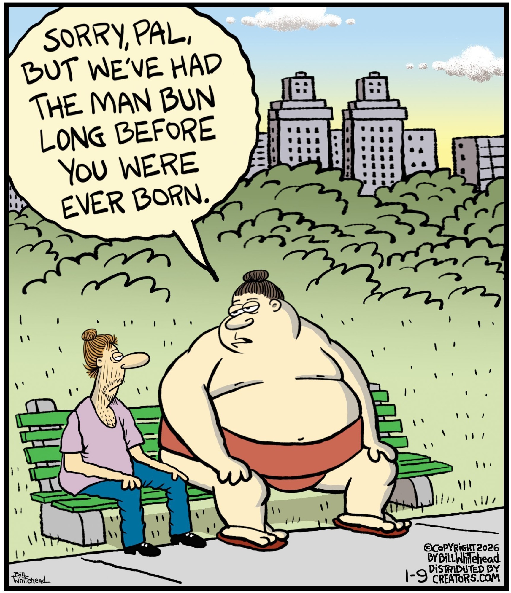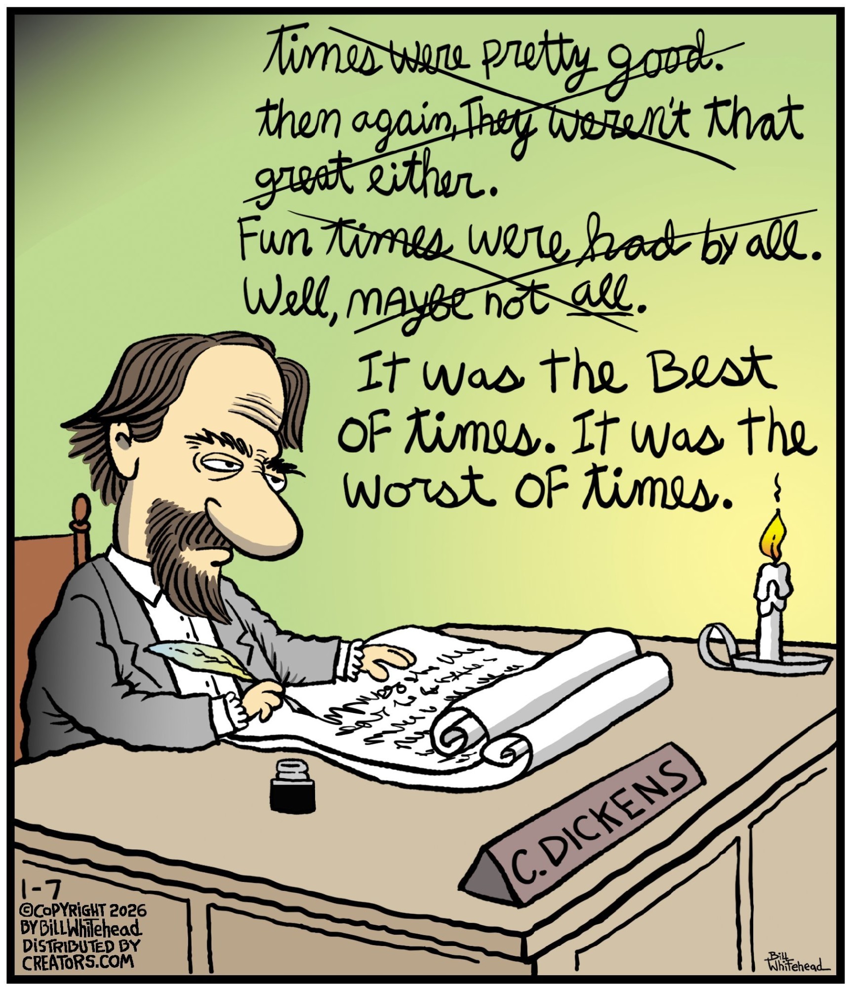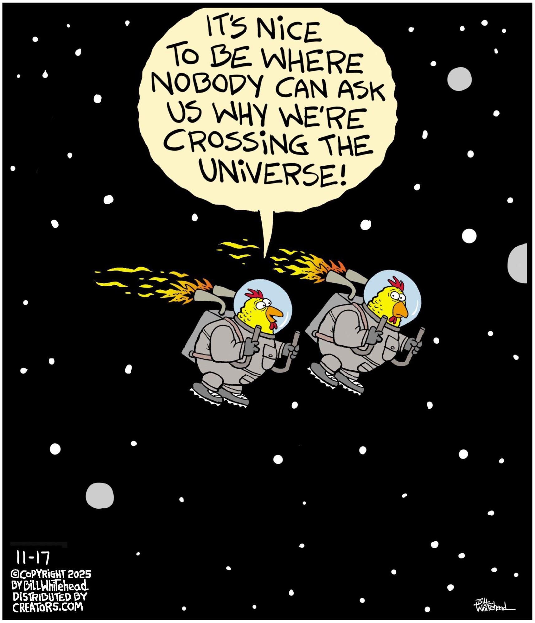 Bill’s career in cartooning started in the fifth grade, when he would copy drawings from comic strips, the New Yorker magazine and editorial cartoons. After a while he developed his own style, focusing primarily on the drawing. He soon realized his characters would need something to do and say, so he gave them their own odd little world to live in. Soon everyone around him became fair game. By college, Bill was cartooning for the school paper. Later, he created posters for book and record stores and freelanced for the Saturday Evening Post, Advertising Age, the Boston Phoenix, Wall Street Journal and King Features. In the '80s, he syndicated Sidelines, a sports panel cartoon. Creators Syndicate