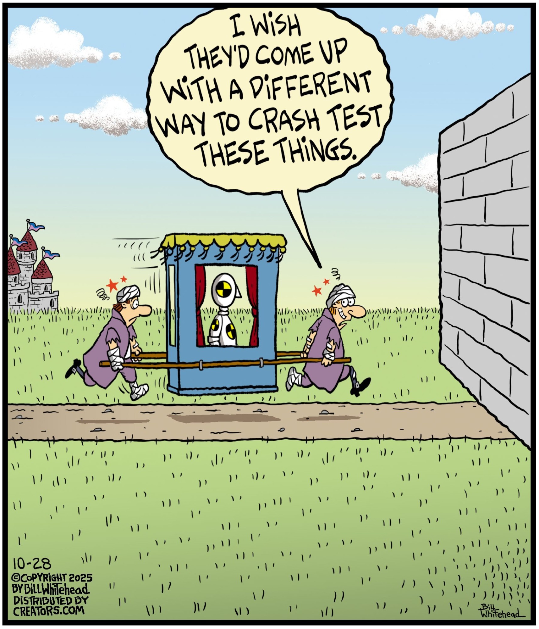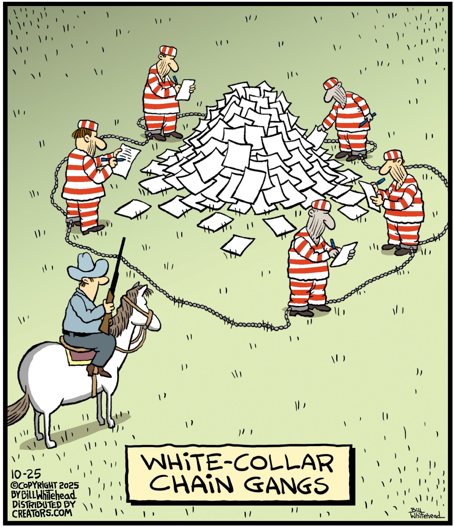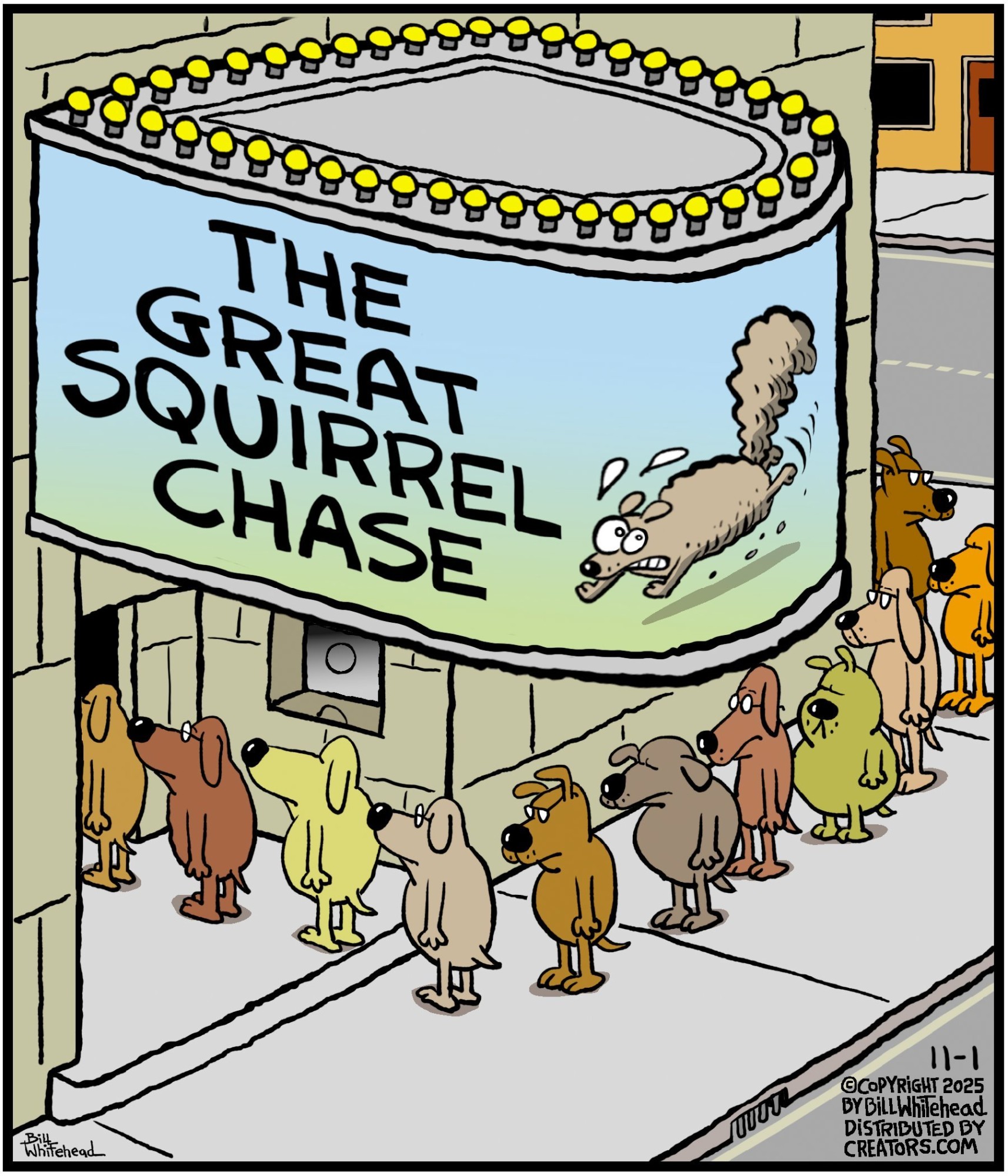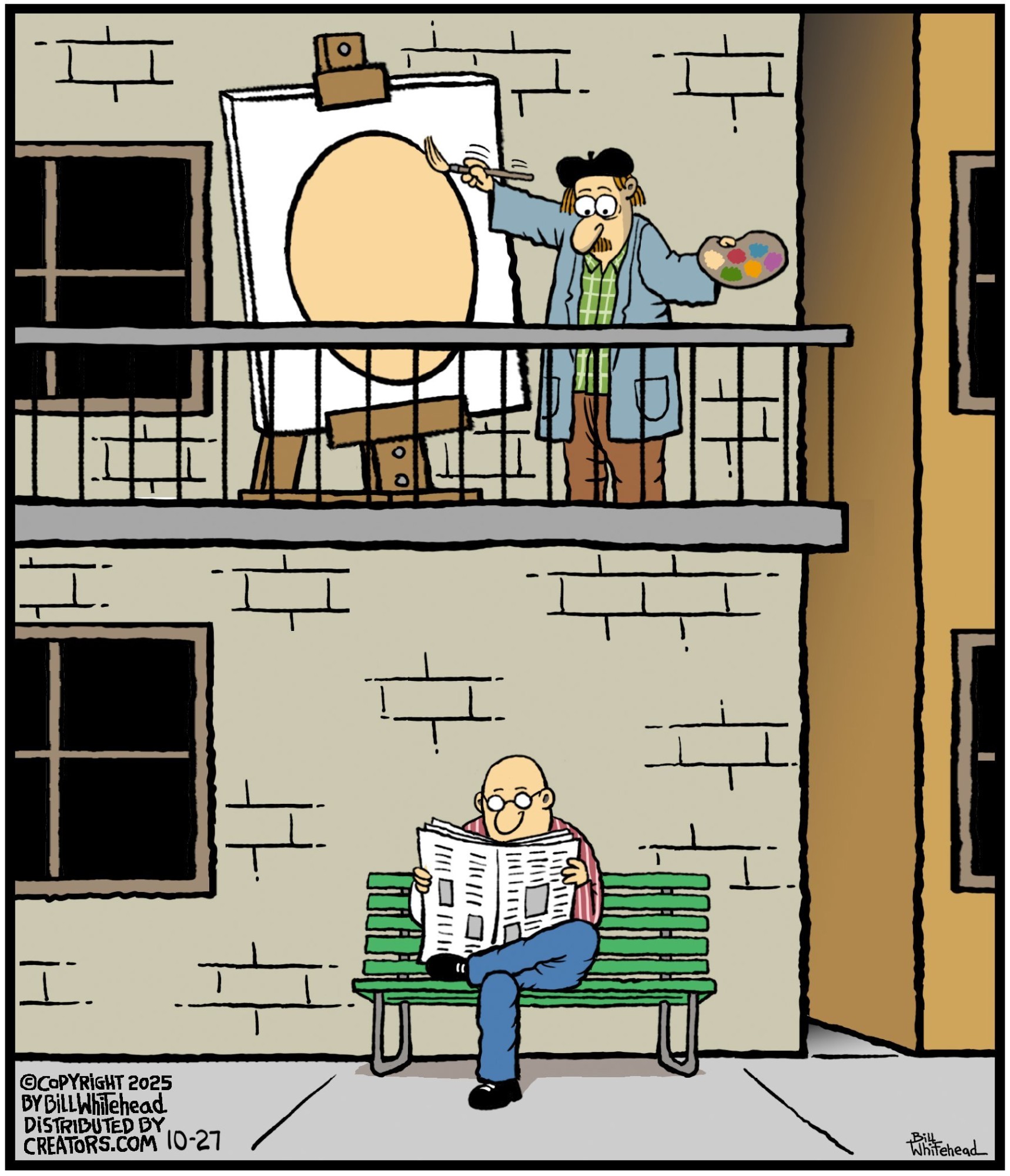 Bill’s career in cartooning started in the fifth grade, when he would copy drawings from comic strips, the New Yorker magazine and editorial cartoons. After a while he developed his own style, focusing primarily on the drawing. He soon realized his characters would need something to do and say, so he gave them their own odd little world to live in. Soon everyone around him became fair game. By college, Bill was cartooning for the school paper. Later, he created posters for book and record stores and freelanced for the Saturday Evening Post, Advertising Age, the Boston Phoenix, Wall Street Journal and King Features. In the '80s, he syndicated Sidelines, a sports panel cartoon. Creators Syndicate