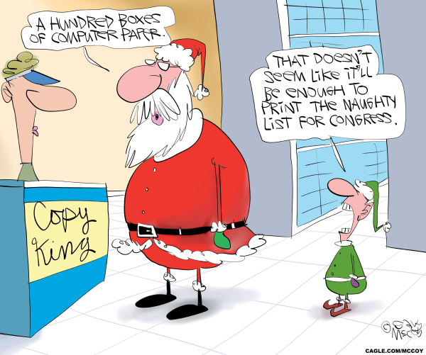 Gary McCoy creates the internationally-syndicated comic panel, The Flying McCoys. He has won Silver Reuben awards from the National Cartoonists Society for his greeting cards and magazine gag cartoons, and has freelanced for Playboy, PARADE Magazine, and too many more to name. He lives in the St. Louis area with his wife and son, and ‘59 Chevy pickup. Cagle Cartoons