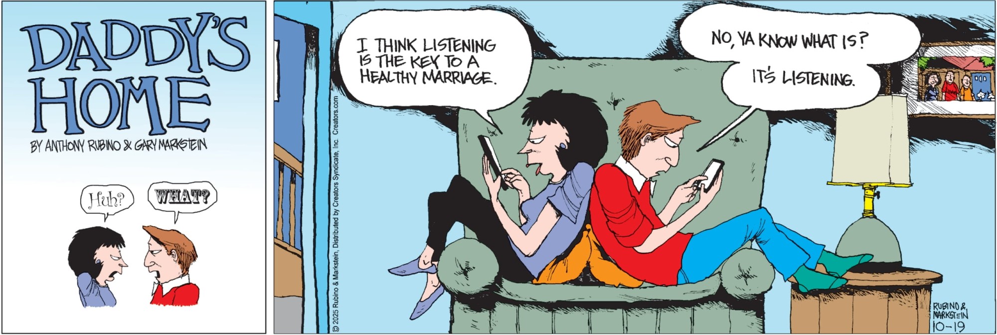 "Daddy’s Home" is a contemporary family comic with an emphasis on the role of the modern father. No other cartoon feature examines domesticity from this uniquely male perspective while remaining universally appealing to both genders. Through the eyes of a stay-at-home-dad, "Daddy’s Home" casts a unique light on everyday situations. With biting sarcasm and sharp wit, Peter and a cast of supporting characters navigate the turbulent waters of modern family life. Creators Syndicate