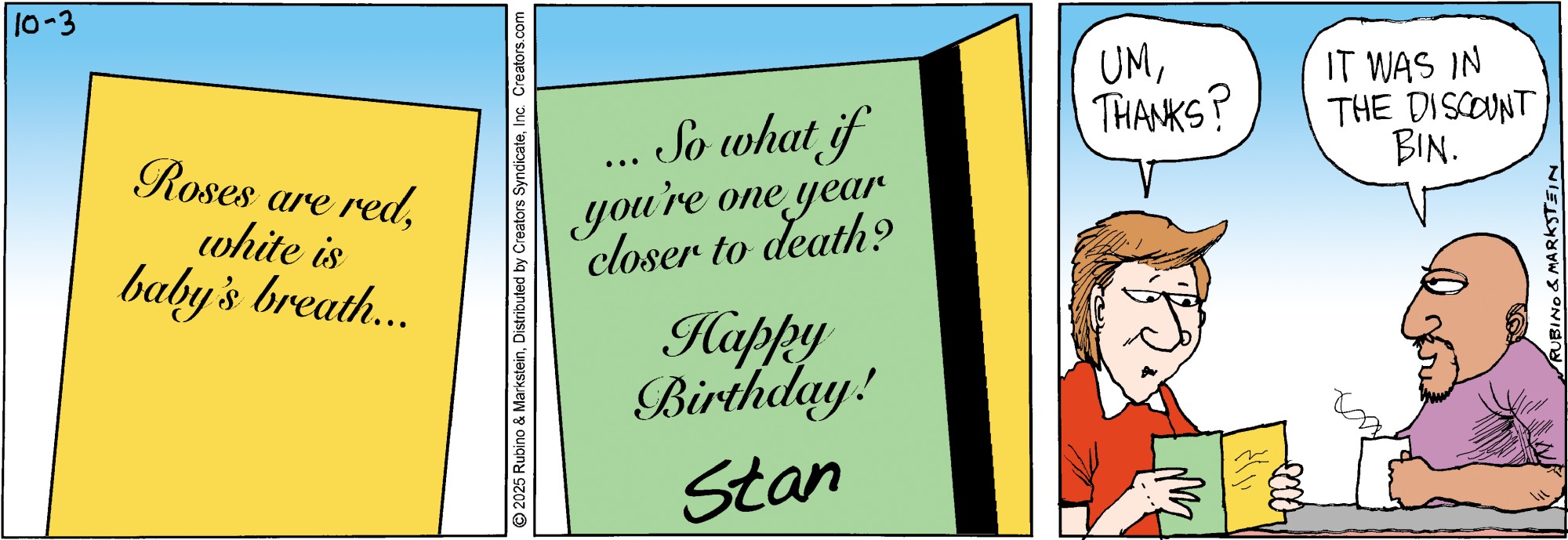 Talking cows, less-than-bright kids, and multiple varieties of flora and fauna make their appearance in the witty offbeat cartoon panel "Rubes" by Leigh Rubin. Rubin’s hilarious cast of characters and absurd view of the world have made "Rubes" a favorite with readers everywhere. Creators Syndicate