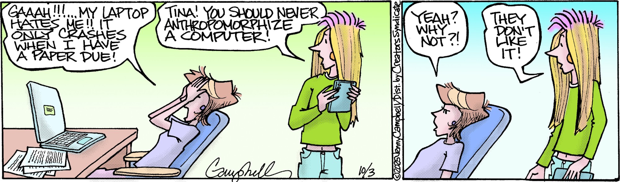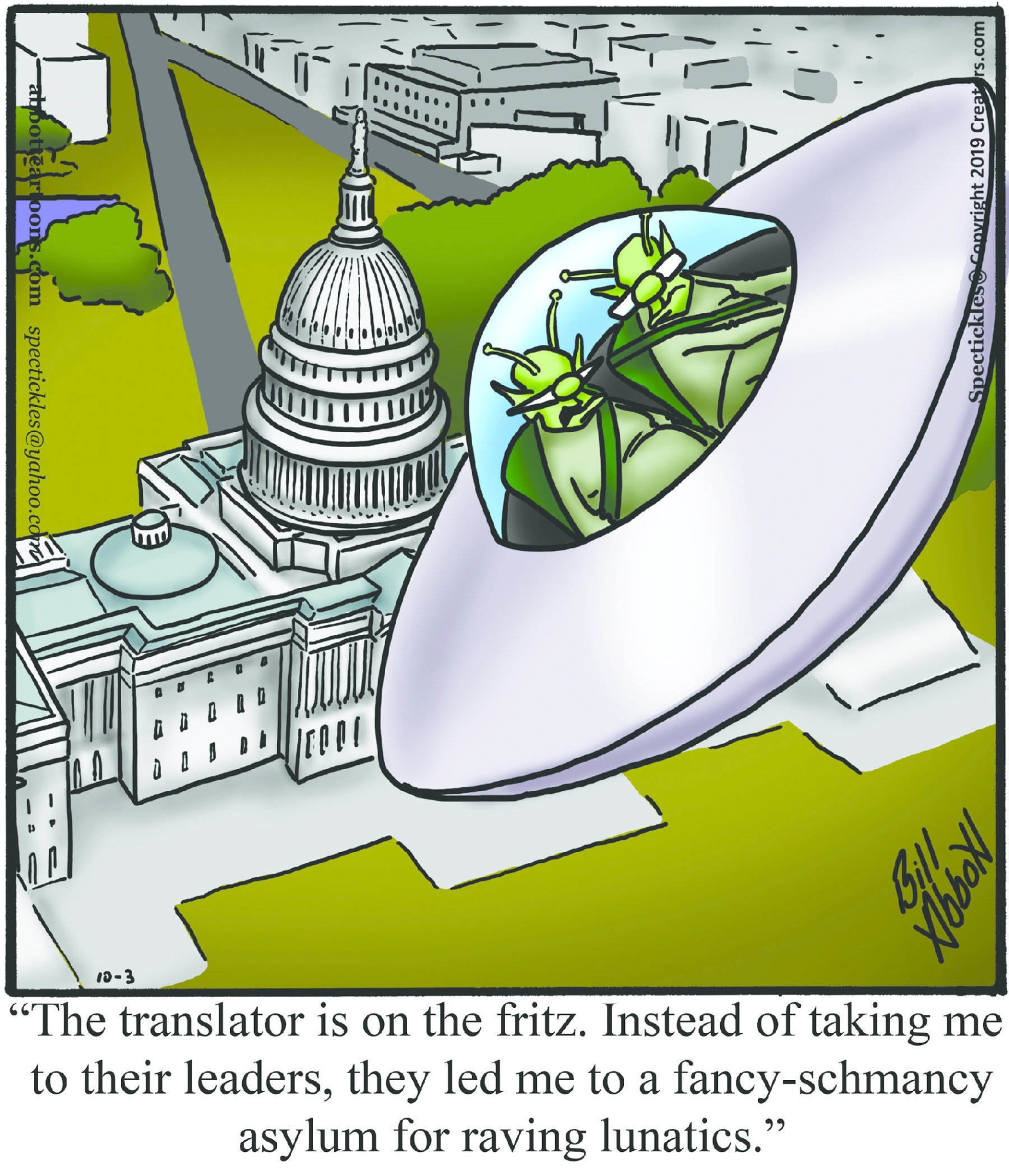Spectickles, a cartoon primarily about a married couple with, to put it mildly, communication challenges, is an amalgamation of physical traits that author Bill Abbott finds humorous: the deadpan expression and gravity-tugged flesh of Walter Matthau, the powerful presence of Ethel Merman, the glasses of his great-grand-parents and a host of other subtleties. Creators Syndicate