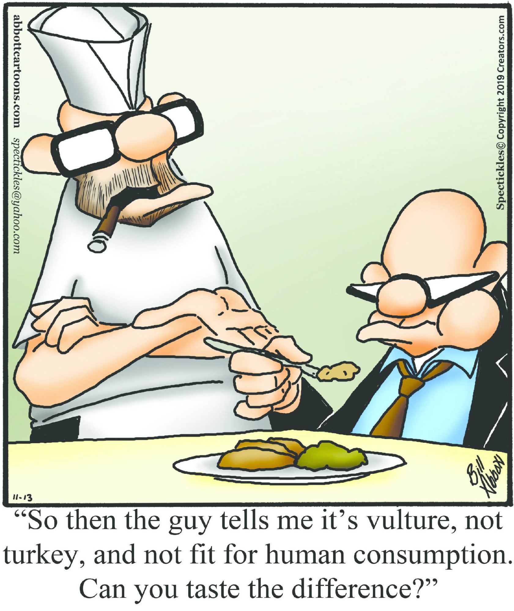 Spectickles, a cartoon primarily about a married couple with, to put it mildly, communication challenges, is an amalgamation of physical traits that author Bill Abbott finds humorous: the deadpan expression and gravity-tugged flesh of Walter Matthau, the powerful presence of Ethel Merman, the glasses of his great-grand-parents and a host of other subtleties. Creators Syndicate