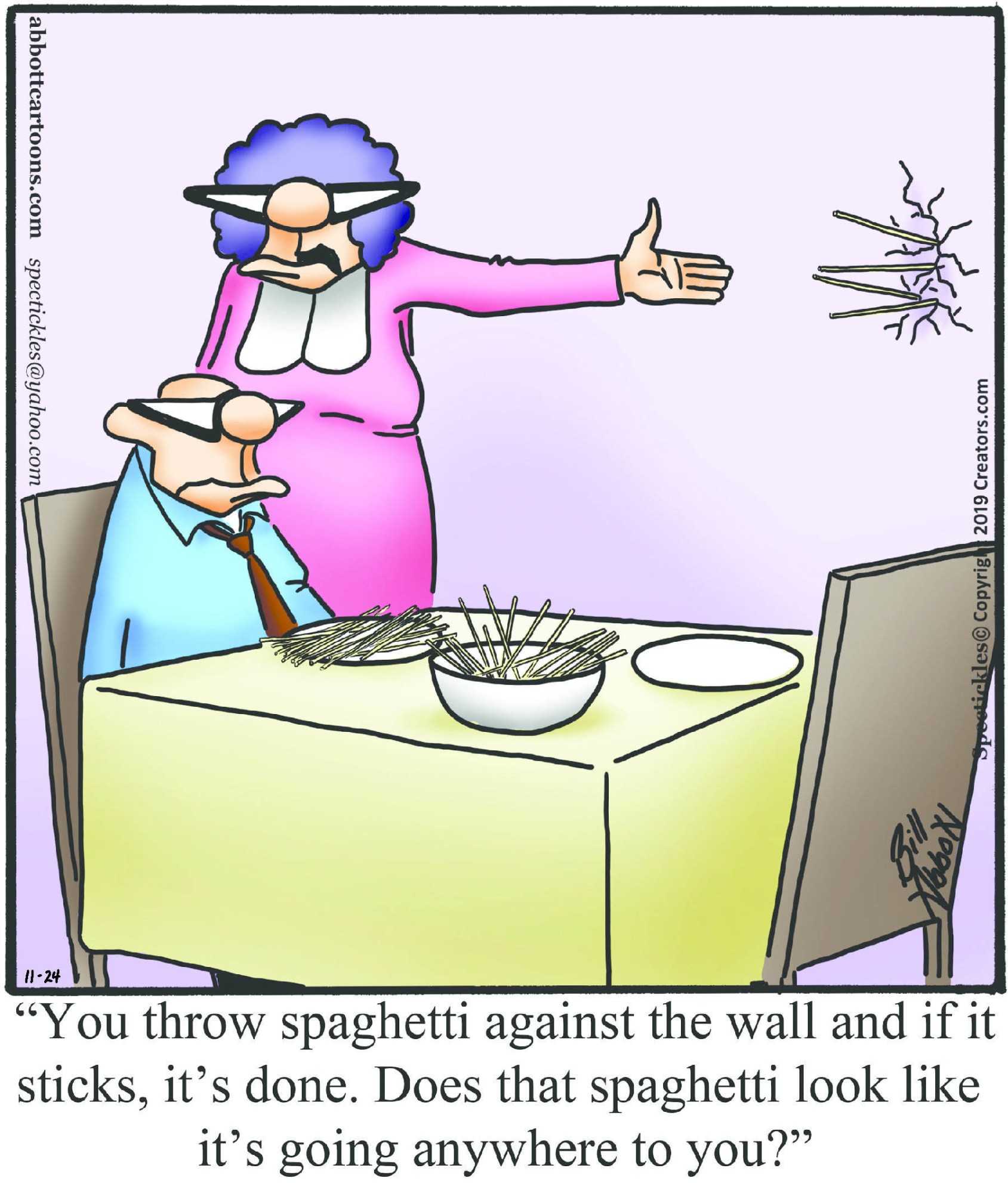 Spectickles, a cartoon primarily about a married couple with, to put it mildly, communication challenges, is an amalgamation of physical traits that author Bill Abbott finds humorous: the deadpan expression and gravity-tugged flesh of Walter Matthau, the powerful presence of Ethel Merman, the glasses of his great-grand-parents and a host of other subtleties.