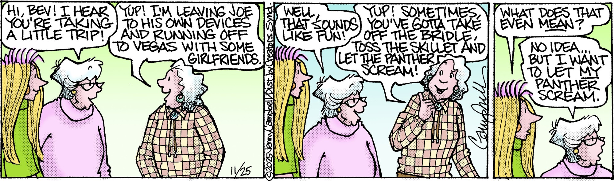 Cartoonist Jenny Campbell has created a spirited and intelligent look at aging and the generation gap. This strip features a group of older women and men dealing with the perils and perks of being old, the rules of chocolate, and the challenges of families. “Flo and Friends” is graceful, poignant, and full of humor.