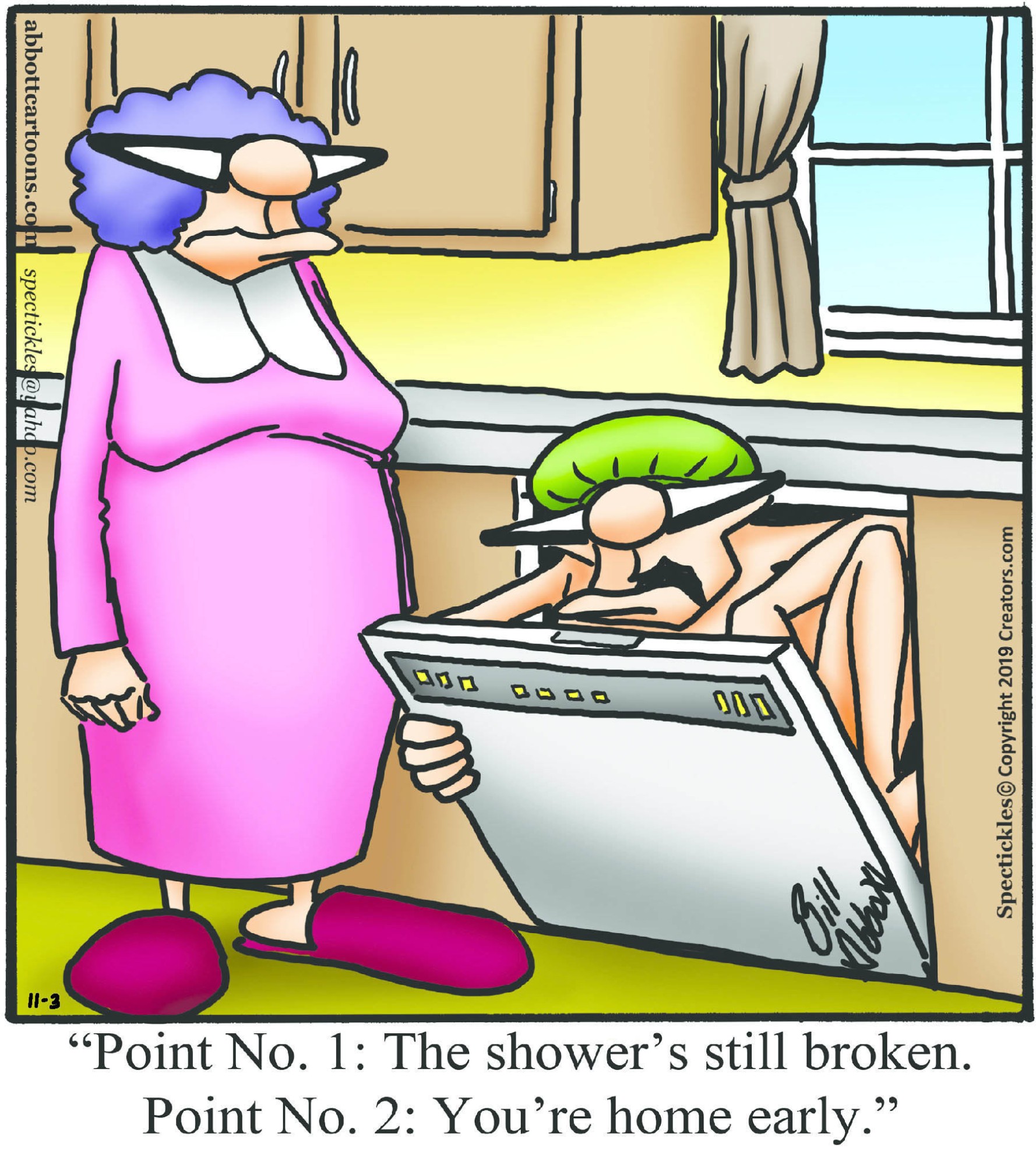 Spectickles, a cartoon primarily about a married couple with, to put it mildly, communication challenges, is an amalgamation of physical traits that author Bill Abbott finds humorous: the deadpan expression and gravity-tugged flesh of Walter Matthau, the powerful presence of Ethel Merman, the glasses of his great-grand-parents and a host of other subtleties. Creators Syndicate
