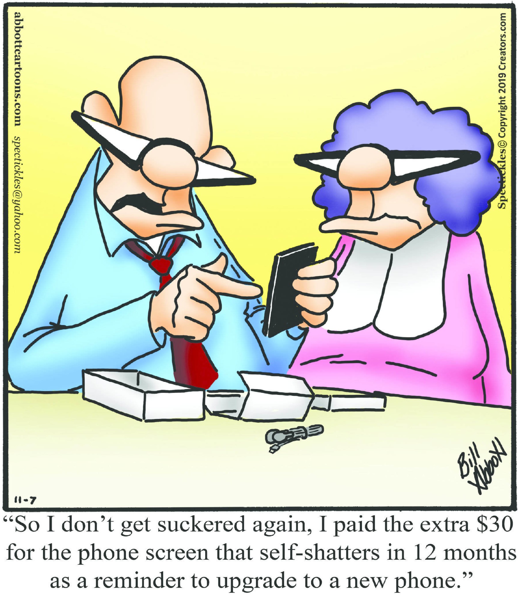 Spectickles, a cartoon primarily about a married couple with, to put it mildly, communication challenges, is an amalgamation of physical traits that author Bill Abbott finds humorous: the deadpan expression and gravity-tugged flesh of Walter Matthau, the powerful presence of Ethel Merman, the glasses of his great-grand-parents and a host of other subtleties. Creators Syndicate