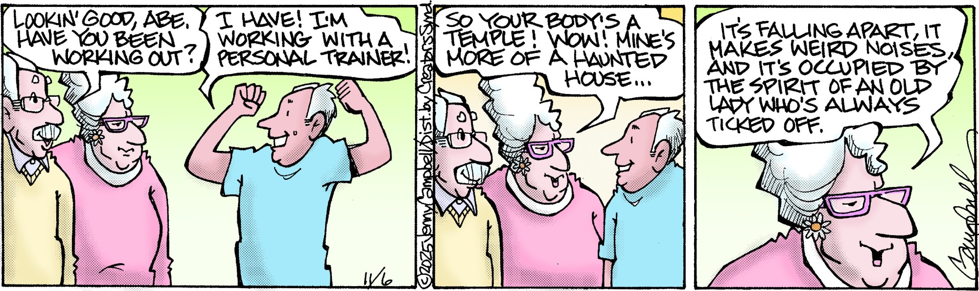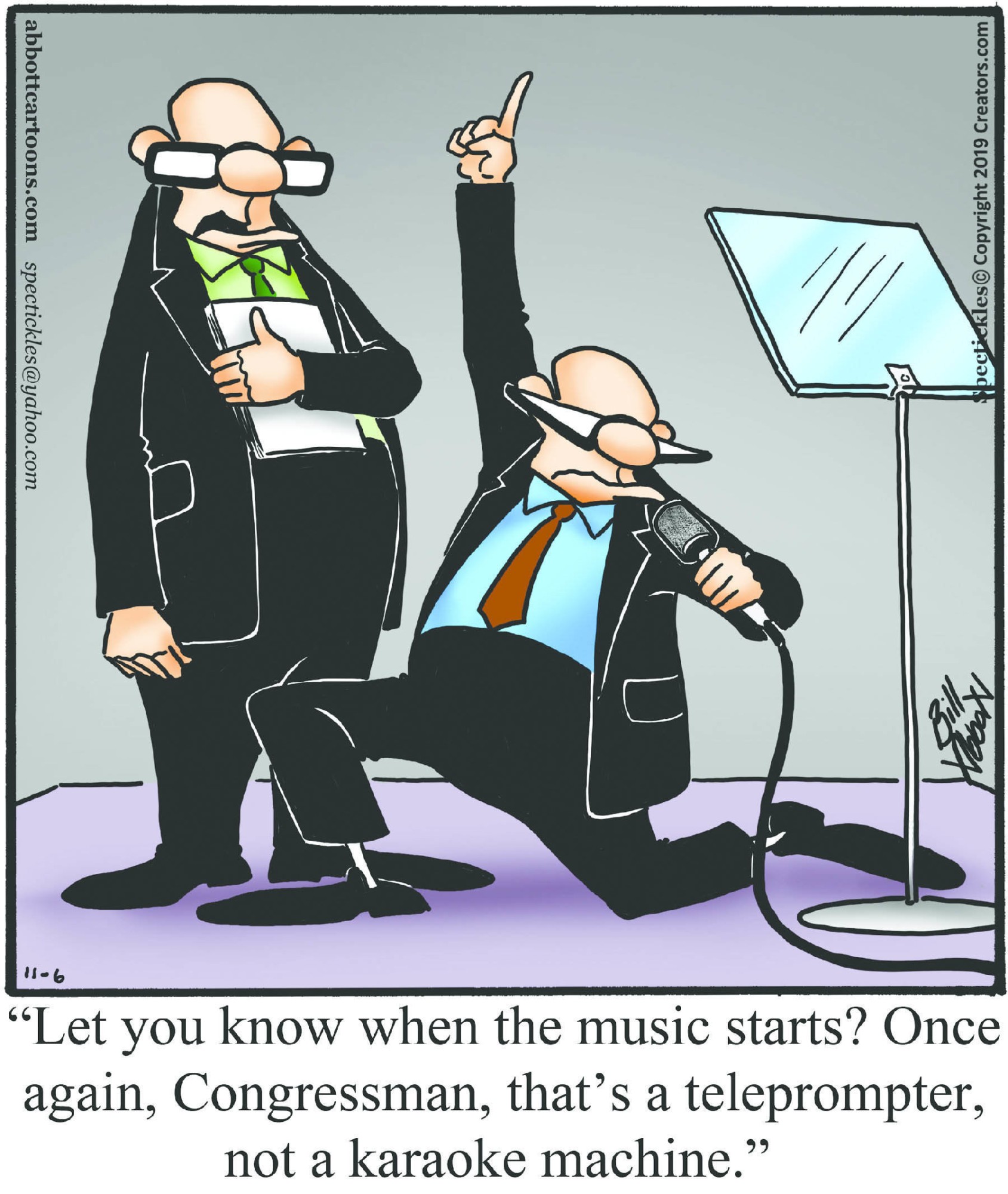 Spectickles, a cartoon primarily about a married couple with, to put it mildly, communication challenges, is an amalgamation of physical traits that author Bill Abbott finds humorous: the deadpan expression and gravity-tugged flesh of Walter Matthau, the powerful presence of Ethel Merman, the glasses of his great-grand-parents and a host of other subtleties. Creators Syndicate