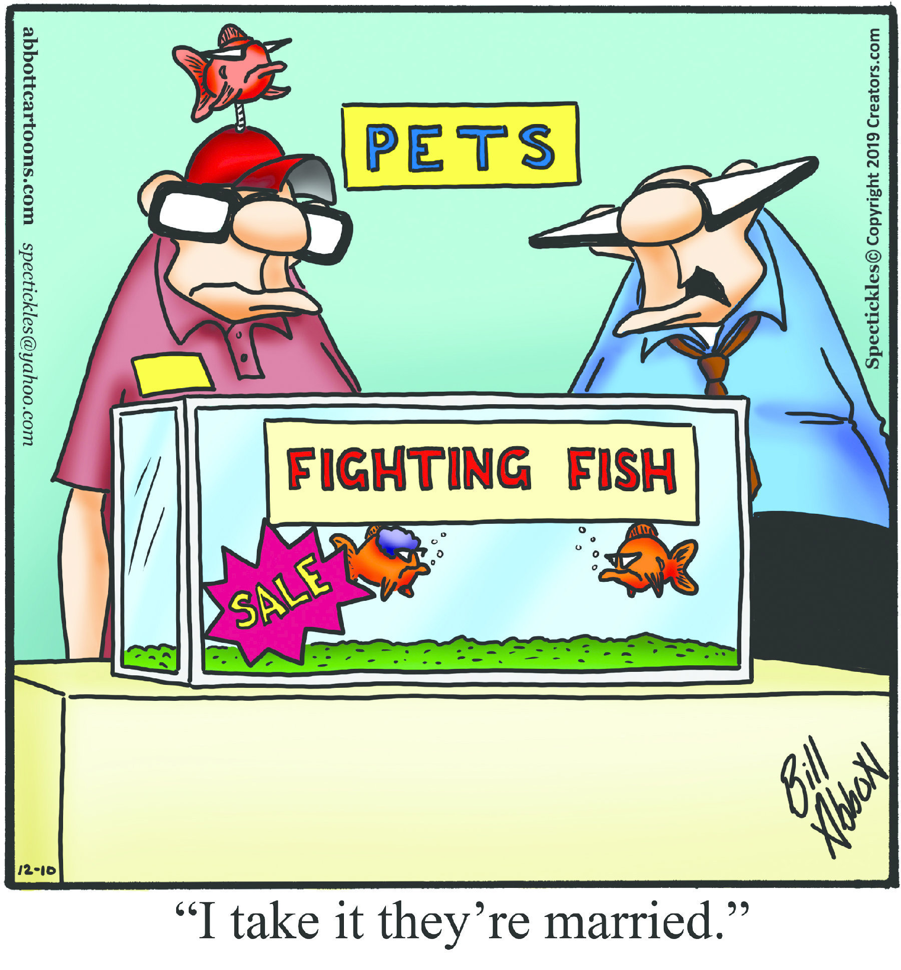 Spectickles, a cartoon primarily about a married couple with, to put it mildly, communication challenges, is an amalgamation of physical traits that author Bill Abbott finds humorous: the deadpan expression and gravity-tugged flesh of Walter Matthau, the powerful presence of Ethel Merman, the glasses of his great-grand-parents and a host of other subtleties.