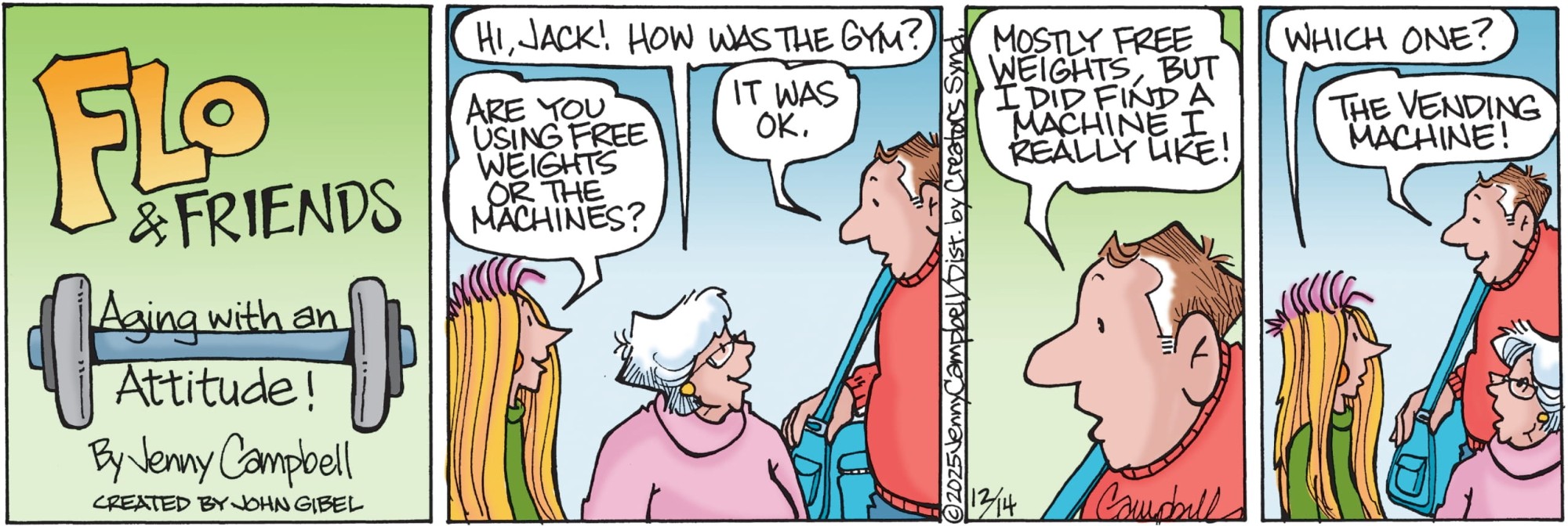 Cartoonist Jenny Campbell has created a spirited and intelligent look at aging and the generation gap. This strip features a group of older women and men dealing with the perils and perks of being old, the rules of chocolate, and the challenges of families. “Flo and Friends” is graceful, poignant, and full of humor.