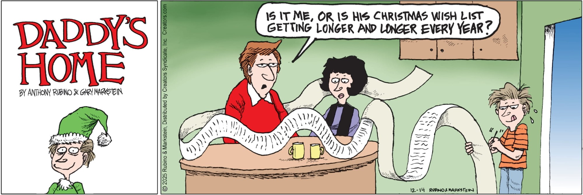 “Daddy’s Home” is a contemporary family comic with an emphasis on the role of the modern father. No other cartoon feature examines domesticity from this uniquely male perspective while remaining universally appealing to both genders. Through the eyes of a stay-at-home-dad, “Daddy’s Home” casts a unique light on everyday situations. With biting sarcasm and sharp wit, Peter and a cast of supporting characters navigate the turbulent waters of modern family life.