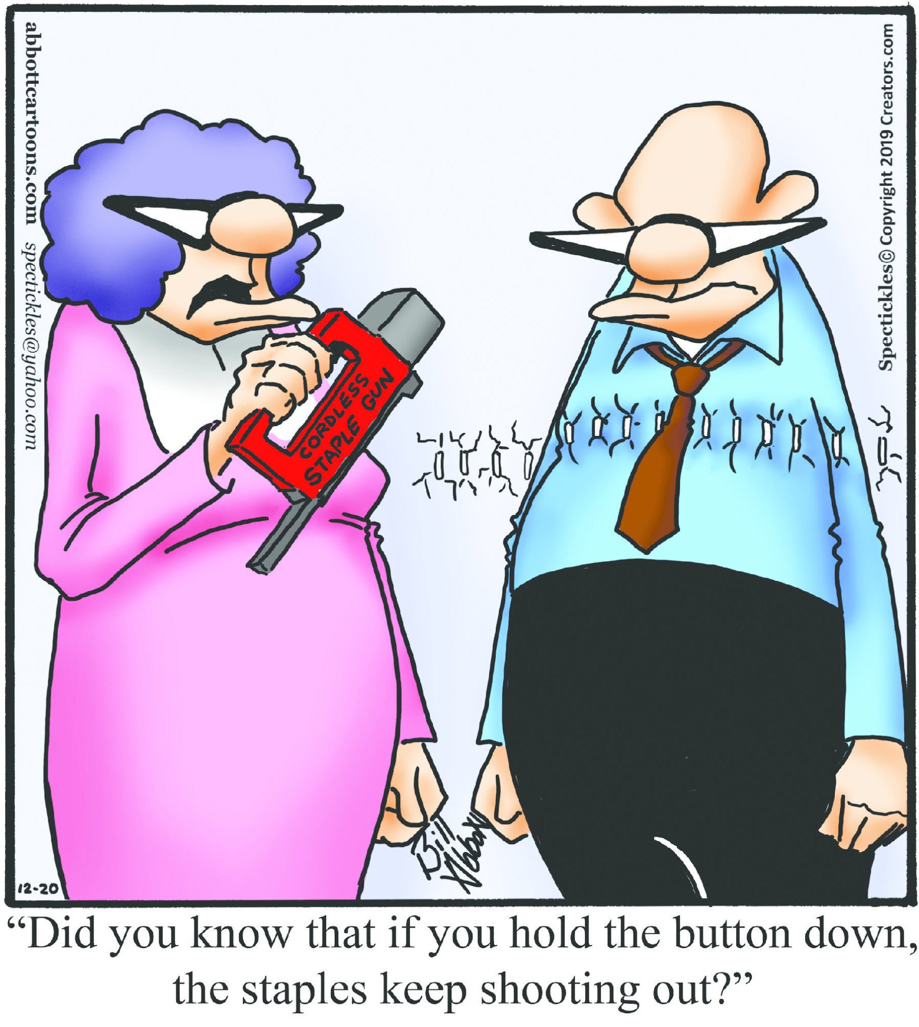 Spectickles, a cartoon primarily about a married couple with, to put it mildly, communication challenges, is an amalgamation of physical traits that author Bill Abbott finds humorous: the deadpan expression and gravity-tugged flesh of Walter Matthau, the powerful presence of Ethel Merman, the glasses of his great-grand-parents and a host of other subtleties.