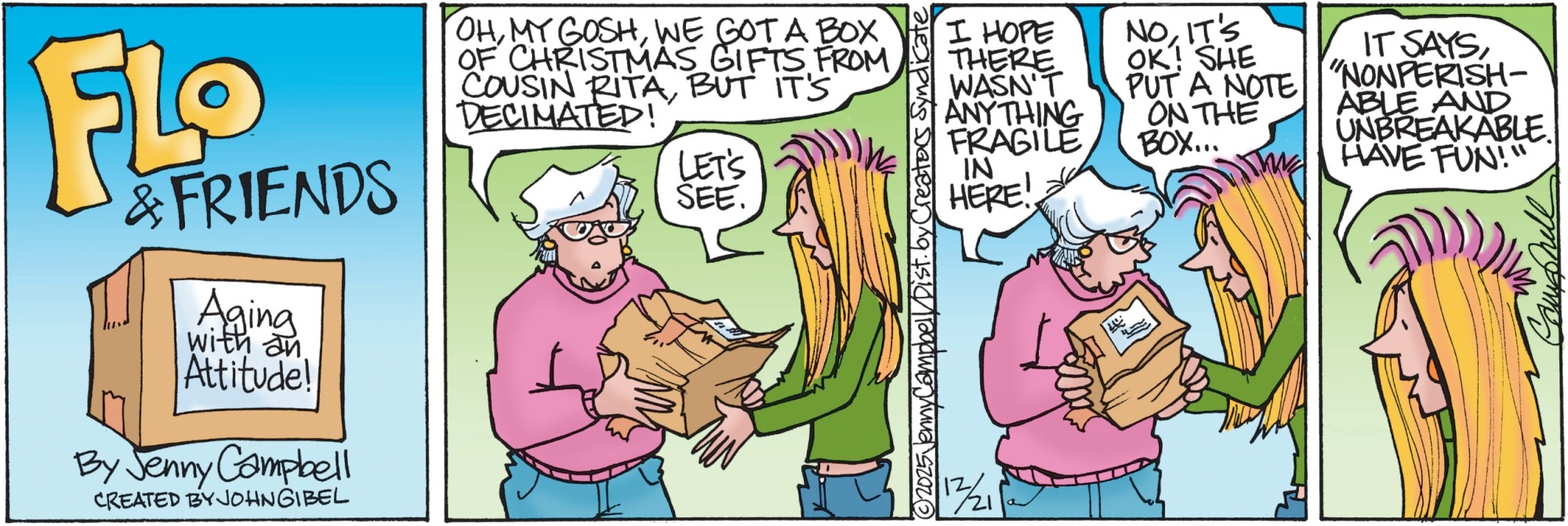 Cartoonist Jenny Campbell has created a spirited and intelligent look at aging and the generation gap. This strip features a group of older women and men dealing with the perils and perks of being old, the rules of chocolate, and the challenges of families. “Flo and Friends” is graceful, poignant, and full of humor.