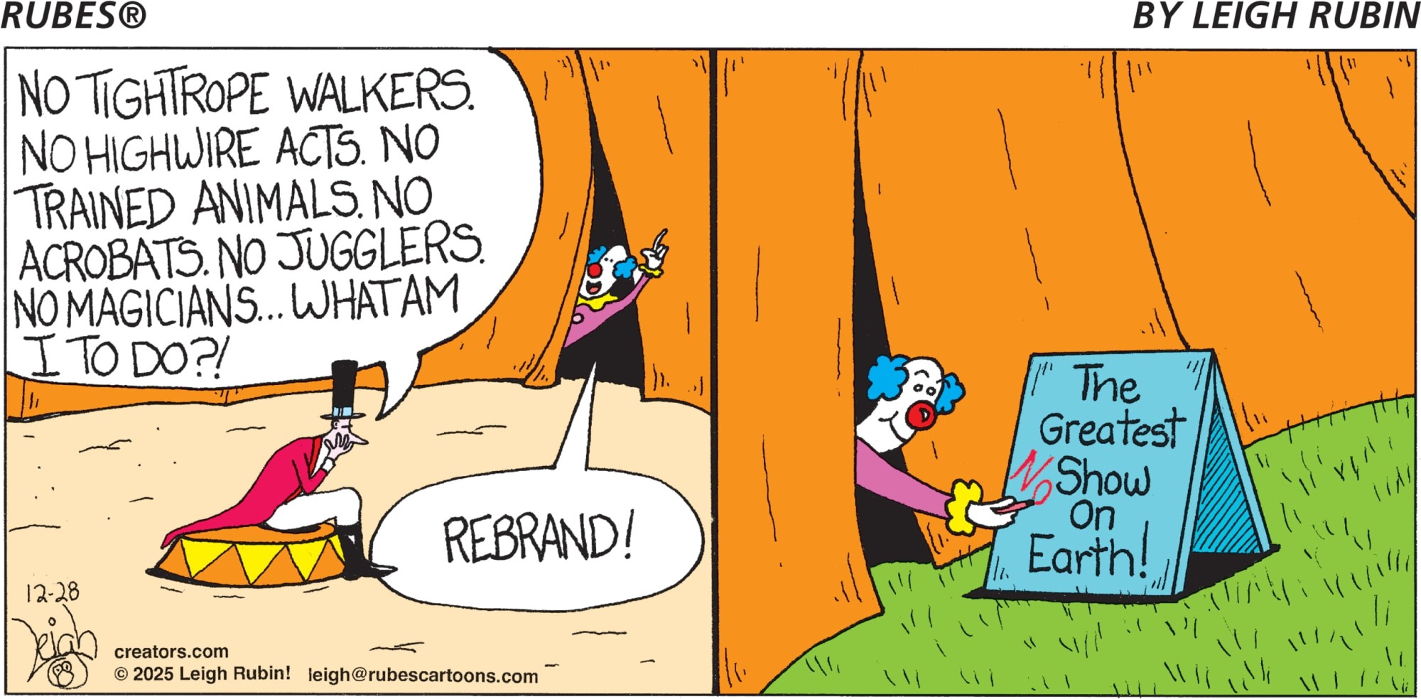 Talking cows, less-than-bright kids, and multiple varieties of flora and fauna make their appearance in the witty offbeat cartoon panel “Rubes” by Leigh Rubin. Rubin’s hilarious cast of characters and absurd view of the world have made “Rubes” a favorite with readers everywhere.