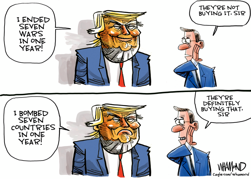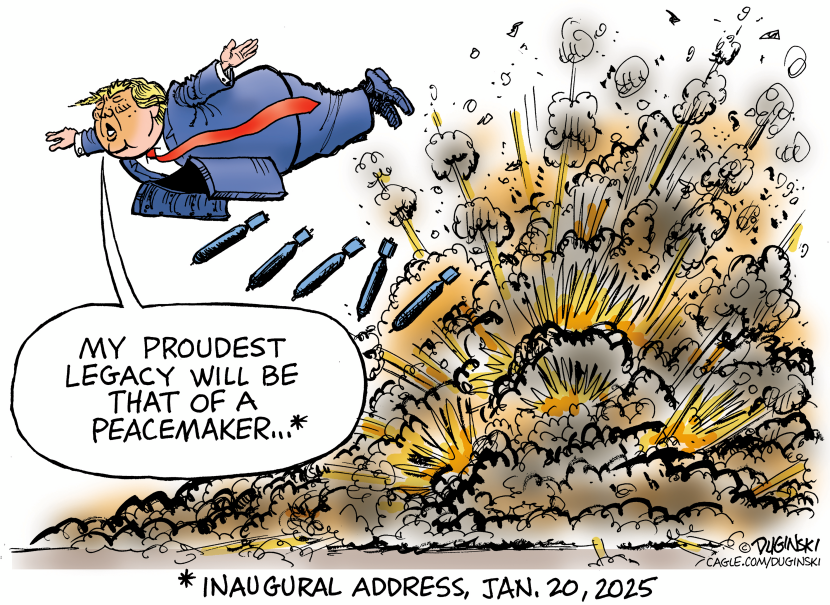 This political cartoon captures Donald Trump in mid-air, bombs raining down into a massive explosion, as he proclaims his proudest legacy as a peacemaker during a fictional 2025 inaugural address. Cagle Cartoons