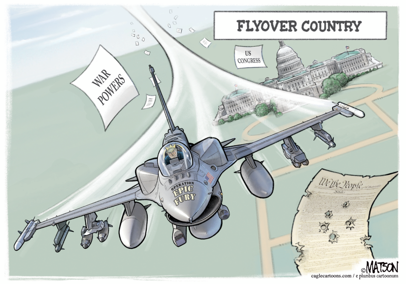 This sharp political cartoon captures the essence of executive overreach, with a fighter jet dubbed 'Epic Fury' zooming past US Congress, discarding war powers documents like confetti over flyover country. The torn US Constitution riddled with bullet holes symbolizes the erosion of constitutional principles amid unchecked military actions. Cagle Cartoons